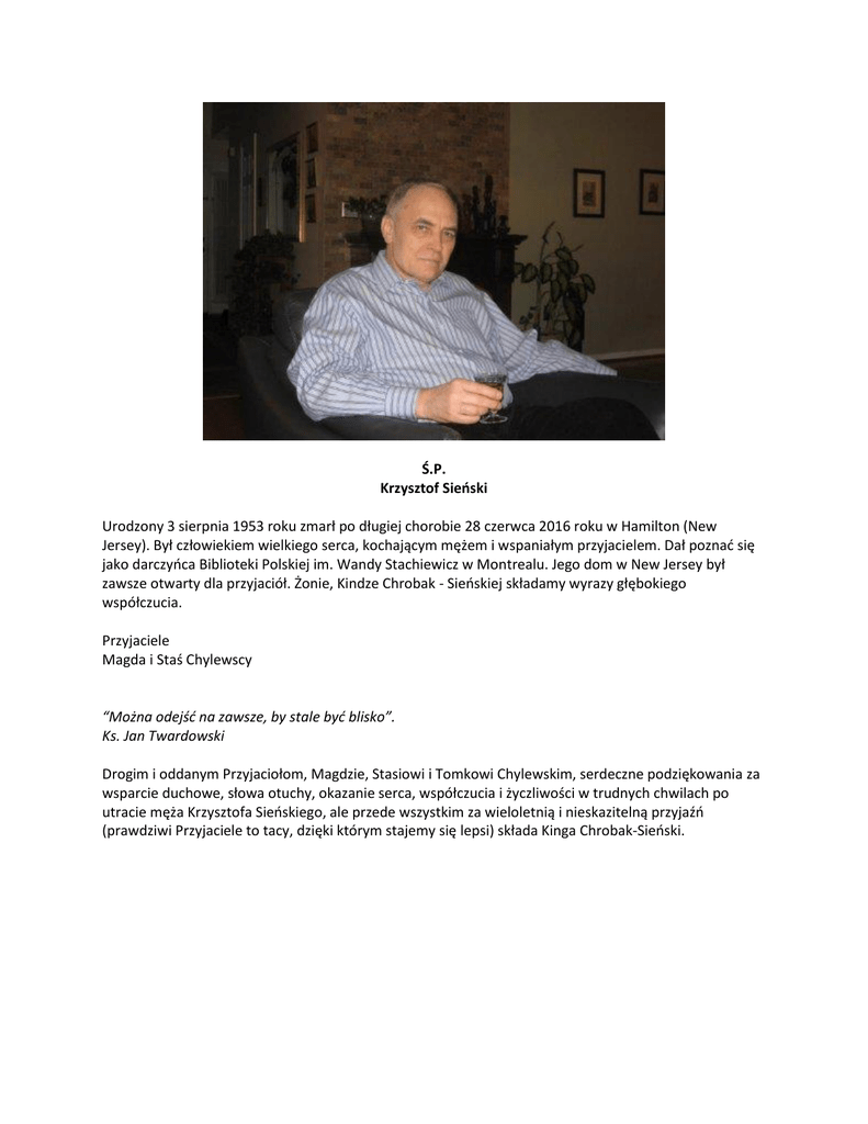 Ś.P. Krzysztof Sieński Urodzony 3 sierpnia 1953 roku zmarł po długiej chorobie 28 czerwca 2016 roku w Hamilton (New Jersey). Był człowiekiem wielkiego serca, kochającym mężem i wspaniałym przyjacielem. Dał poznać się jako darczyńca Biblioteki Polskiej im. Wandy Stachiewicz w Montrealu. Jego dom w New Jersey był zawsze otwarty dla przyjaciół. Żonie, Kindze Chrobak - Sieńskiej składamy wyrazy głębokiego współczucia. Przyjaciele Magda i Staś Chylewscy “Można odejść na zawsze, by stale być blisko”. Ks. Jan Twardowski Drogim i oddanym Przyjaciołom, Magdzie, Stasiowi i Tomkowi Chylewskim, serdeczne podziękowania za wsparcie duchowe, słowa otuchy, okazanie serca, współczucia i życzliwości w trudnych chwilach po utracie męża Krzysztofa Sieńskiego, ale przede wszystkim za wieloletnią i nieskazitelną przyjaźń (prawdziwi Przyjaciele to tacy, dzięki którym stajemy się lepsi) składa Kinga Chrobak-Sieński.