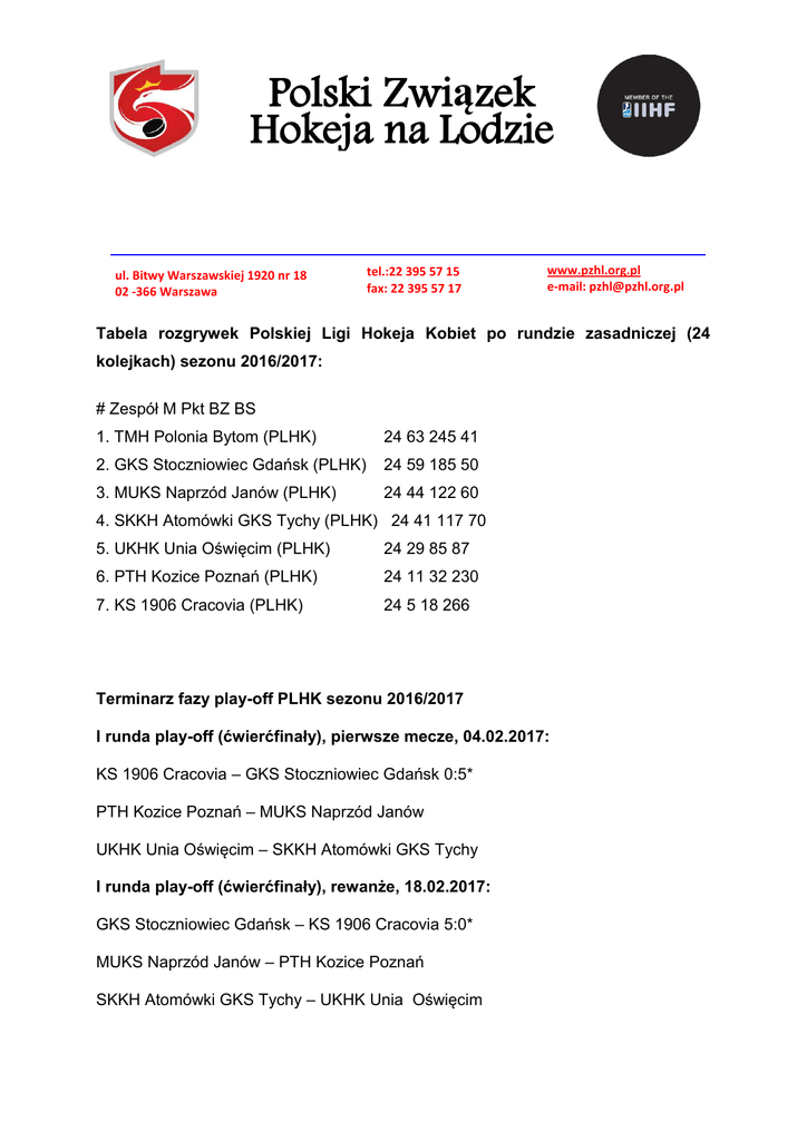 Polski Związek Hokeja na Lodzie ul. Bitwy Warszawskiej 1920 nr 18 02 -366 Warszawa tel.:22 395 57 15 fax: 22 395 57 17 www.pzhl.org.pl e-mail: [email protected] Tabela rozgrywek Polskiej Ligi Hokeja Kobiet po rundzie zasadniczej (24 kolejkach) sezonu 2016/2017: # Zespół M Pkt BZ BS 1. TMH Polonia Bytom (PLHK) 24 63 245 41 2. GKS Stoczniowiec Gdańsk (PLHK) 24 59 185 50 3. MUKS Naprzód Janów (PLHK) 24 44 122 60 4. SKKH Atomówki GKS Tychy (PLHK) 24 41 117 70 5. UKHK Unia Oświęcim (PLHK) 24 29 85 87 6. PTH Kozice Poznań (PLHK) 24 11 32 230 7. KS 1906 Cracovia (PLHK) 24 5 18 266 Terminarz fazy play-off PLHK sezonu 2016/2017 I runda play-off (ćwierćfinały), pierwsze mecze, 04.02.2017: KS 1906 Cracovia – GKS Stoczniowiec Gdańsk 0:5* PTH Kozice Poznań – MUKS Naprzód Janów UKHK Unia Oświęcim – SKKH Atomówki GKS Tychy I runda play-off (ćwierćfinały), rewanże, 18.02.2017: GKS Stoczniowiec Gdańsk – KS 1906 Cracovia 5:0* MUKS Naprzód Janów – PTH Kozice Poznań SKKH Atomówki GKS Tychy – UKHK Unia Oświęcim *Ze względu na wycofanie się z rozgrywek drużyny Cracovii, dwumecz pomiędzy zespołami z Krakowa i Gdańska zostaje zweryfikowany jako dwa zwycięstwa walkowerem GKS-u Stoczniowiec. Przy remisie punktowym po dwóch meczach I fazy play-off o awansie decyduje lepszy bilans bramek zdobytych do straconych w dwumeczu. W przypadku dalszego braku możliwości wyłonienia zwycięzcy, o awansie do II fazy play-off będzie decydować dogrywka i ewentualne rzuty karne. Zgodnie z Regulaminem, drużyna TMH Polonia Bytom jako zwycięzca fazy zasadniczej przechodzi automatycznie do półfinałów. II runda play-off, pierwsze mecze półfinału, 25.02, 04-05.03.2017: Zespół z miejsca 1-szego po rundzie zasadniczej tworzy parę z zespołem najniżej sklasyfikowanym po rundzie zasadniczej, który wygrał swój dwumecz w I rundzie play off. Gospodarzem pierwszego meczu niżej sklasyfikowana drużyna po rundzie zasadniczej. Rozgrywki w półfinałach prowadzone do dwóch zwycięstw. III runda play-off, finał oraz mecze o III miejsce, 11.03, 18-19.03.2017: Gospodarzem pierwszego meczu, niżej sklasyfikowana drużyna po rundzie zasadniczej. Rozgrywki w finale i w rywalizacji o brąz prowadzone do dwóch zwycięstw.