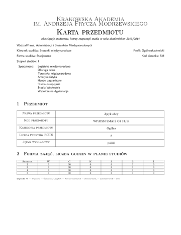 Krakowska Akademia im. Andrzeja Frycza Modrzewskiego Karta przedmiotu obowiązuje studentów, którzy rozpoczęli studia w roku akademickim 2013/2014 WydziałPrawa, Administracji i Stosunków Miedzynarodowych Kierunek studiów: Stosunki międzynarodowe Profil: Ogólnoakademicki Forma studiów: Stacjonarne Kod kierunku: SM Stopień studiów: I Specjalności: 1 2 Logistyka międzynarodowa Obsługa celna Turystyka międzynarodowa Amerykanistyka Handel zagraniczny Studia europejskie Studia Wschodnie Współczesna dyplomacja Przedmiot Nazwa przedmiotu Język obcy Kod przedmiotu WPAISM SMA1S O1 13/14 Kategoria przedmiotu Ogólna Liczba punktów ECTS 8 Język wykładowy polski Forma zajęć, liczba godzin w planie studiów Semestr 2 3 4 5 W 0 0 0 0 C 30 30 30 30 K 0 0 0 0 S 0 0 0 0 Legenda: W — WykładC — Ćwiczenia/ JęzykiK — KonwersatoriumS — SeminariumL — LabolatoriumI — Inne L 0 0 0 0 I 0 0 0 0 Krakowska Akademia im. Andrzeja Frycza Modrzewskiego 3 Cele przedmiotu Cel 1 OGÓLNE CELE NAUCZANIA JĘZYKA OBCEGO: usprawnienie komunikacji językowej uczących się aby ułatwić kontakty wymagające użycia języka obcego, ulepszenie wzajemnego zrozumienia się osób uczestniczących w procesie komunikacji, uściślenie współpracy i efektywności działań zawodowych lub w środowisku kształcenia, a także zwiększenie motywacji uczenia się uczynienie uczących się biegłymi i kompetentnymi użytkownikami języka zniesienie barier w komunikacji, poszerzenie zakresu wzajemnego zrozumienia, wzbogacenie kulturowe, rozwój osobowości uczącego się poprzez doświadczenie bogactwa innych języków i kultur, porozumienie ponad barierami kulturowymi i językowymi w świecie wielokulturowym integracja kolejnych nowych doświadczeń w zakresie uczenia się, nauczanie z większą spójnością działań: wykorzystanie multimedialnych pomocy dydaktycznych i wykorzystanie nowoczesnych technologii informacyjnych uczenie radzenia sobie w różnych sytuacjach życia codziennego w obcym kraju i pomagania cudzoziemcom w tego typu sytuacjach we własnym kraju wymienianie informacji i poglądów z ludźmi, którzy mówią innymi językami, wyrażanie własnych myśli i odczuć osiągnięcie lepszego zrozumienia sposobu życia, mentalności i dziedzictwa kulturowego innych ludzi przygotowanie do współpracy w sferze edukacji, kultury i nauki, handlu i przemysłu umożliwienie i kształcenie niezależności w myśleniu, ocenie i działaniu rozumienie i tworzenie tekstów dotyczących tematów z różnych sfer życia odpowiednich dla wykonania zadania kształcenie językowych kompetencji komunikacyjnych CELE NAUCZANIA JĘZYKA OBCEGO NA POZIOMIE B1 Wprowadzenie wyrażeń leksykalnych i struktur językowych niezbędnych do skutecznej komunikacji w zakresie znanych studentom tematów typowych dla domu, otoczenia, realizacji zadań z życia codziennego, organizacji czasu wolnego, spraw bieżących prywatnych i zawodowych Ćwiczenie umiejętności rozumienia głównych myśli i informacji jasno sformułowanych w tekstach pisanych /z użyciem słów najczęściej używanych /na temat życia rodzinnego albo zawodowego, oraz ćwiczenie formułowania wypowiedzi na tematy znane. Udoskonalanie umiejętności wyłapywania najważniejszych wątków programów radiowych lub telewizyjnych dotyczących spraw bieżących lub związanych z zainteresowaniami i wiedzą studentów. Angażowanie studentów do udziału w symulacjach imitujących interakcję zachodzącą w większości sytuacji z życia codziennego lub zawodowego z użyciem wyrażeń już znanych. Aktywizowanie studentów do udziału w rozmowach na tematy znane, bez przygotowania, w celu przekazania opisów przeżyć, zdarzeń, marzeń i ambicji a także objaśnienia własnych poglądów i planów: ćwiczenie relacjonowania przebiegu akcji filmów, książek w porównaniu z relacjonowaniem rzeczywistych zdarzeń. Ćwiczenia te prowadzone są celem udoskonalania umiejętności mówienia. Zwrócenie uwagi studentów na różnice w formułowaniu wypowiedzi pisemnej w sposób formalny i nieformalny. CELE NAUCZANIA JĘZYKA OBCEGO NA POZIOMIE B2 Rozszerzenie zagadnień leksykalnych o kolokacje językowe, konkretne tematy także abstrakcyjne. Wprowadzenie struktur gramatycznych, których zastosowanie pozwoli znacznie swobodniej budować i analizować teksty złożone, dłuższe i bardziej skomplikowane. Ćwiczenie poszczególnych umiejętności w sposób zintegrowany. Ćwiczenie rozumienia większości myśli w dłuższych wypowiedziach, wykładach, wiadomościach telewizyjnych i radiowych lub programach o sprawach bieżących a także filmów w standardowej odmianie języka. Analizowanie ze zrozumieniem tekstów dotyczących problemów współczesnego świata, których autorzy prezentują swoje poglądy. Zapoznanie studentów ze sposobem przedstawiania swoich opinii, poglądów oraz ich obroną. Ćwiczenie w prowadzeniu swobodnej, płynnej rozmowy z elementami spontanicznej wypowiedzi i swobodnego włączania się do rozmowy oraz jej podtrzymywania. Wdrożenie i utrwalanie struktur oraz wyrażeń umożliwiających formułowanie przejrzystych, rozbudowanych wypowiedzi związanych z różnymi tematami i dziedzinami, którymi student się interesuje, podawanie argumentów za i przeciw względem możliwych rozwiązań w formie ustnej i pisemnej, przedstawianie klarownych, uporządkowanych opisów z istotnymi szczegółami, przykładami, wspieranie wypowiedzi za pomocą komentarzy i przykładów. Zaprezentowanie najważniejszych aspektów związanych z korzystaniem z jednojęzycznych słowników. Praktyczne ćwiczenie ze studentami w przeprowadzeniu profesjonalnej prezentacji. CELE NAUCZANIA JĘZYKA OBCEGO NA POZIOMIE C1 Przygotowanie studentów do rozumienia szerokiego zakresu trudnych, dłuższych tekstów związanych nie tylko z dziedziną ich zainteresowań, dostrzeganie znaczeń ukrytych i wyrażonych pośrednio. Zwrócenie uwagi na zróżnicowanie tekstów pod 