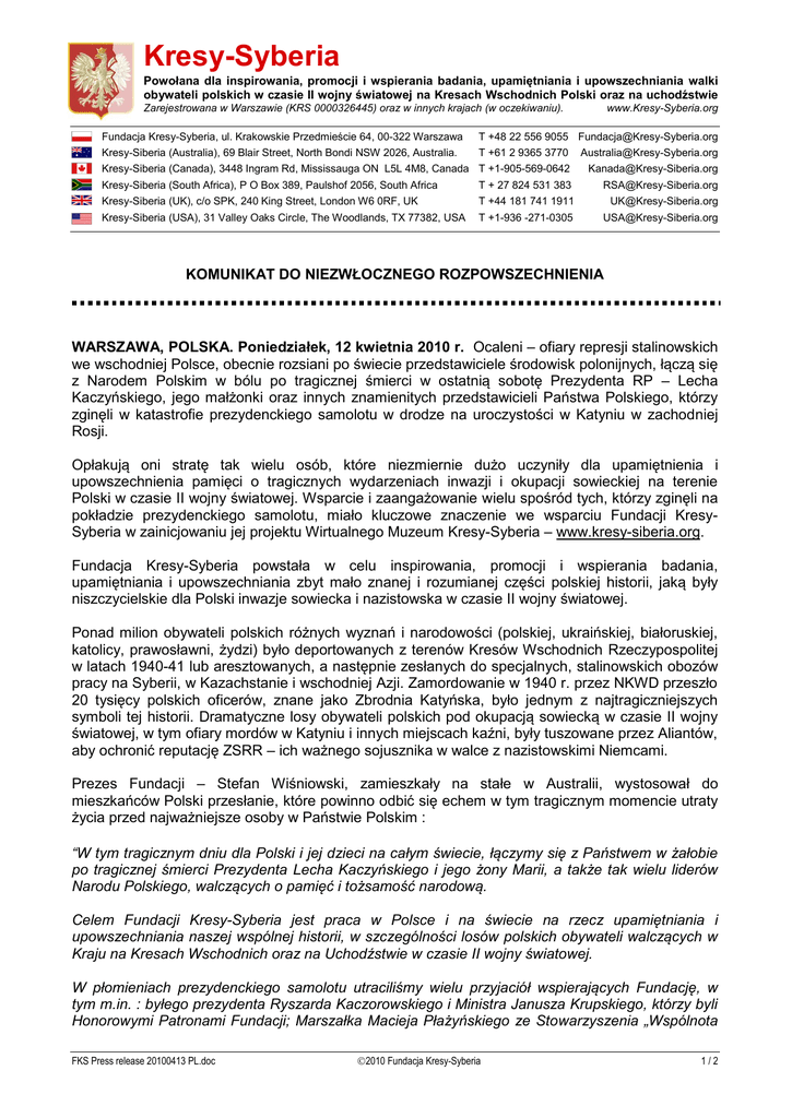 Kresy-Syberia Powołana dla inspirowania, promocji i wspierania badania, upamiętniania i upowszechniania walki obywateli polskich w czasie II wojny światowej na Kresach Wschodnich Polski oraz na uchodźstwie Zarejestrowana w Warszawie (KRS 0000326445) oraz w innych krajach (w oczekiwaniu). www.Kresy-Syberia.org Fundacja Kresy-Syberia, ul. Krakowskie Przedmieście 64, 00-322 Warszawa T +48 22 556 9055 [email protected] Kresy-Siberia (Australia), 69 Blair Street, North Bondi NSW 2026, Australia. T +61 2 9365 3770 [email protected] Kresy-Siberia (Canada), 3448 Ingram Rd, Mississauga ON L5L 4M8, Canada T +1-905-569-0642 [email protected] Kresy-Siberia (South Africa), P O Box 389, Paulshof 2056, South Africa T + 27 824 531 383 Kresy-Siberia (UK), c/o SPK, 240 King Street, London W6 0RF, UK T +44 181 741 1911 [email protected] [email protected] Kresy-Siberia (USA), 31 Valley Oaks Circle, The Woodlands, TX 77382, USA T +1-936 -271-0305 [email protected] KOMUNIKAT DO NIEZWŁOCZNEGO ROZPOWSZECHNIENIA WARSZAWA, POLSKA. Poniedziałek, 12 kwietnia 2010 r. Ocaleni – ofiary represji stalinowskich we wschodniej Polsce, obecnie rozsiani po świecie przedstawiciele środowisk polonijnych, łączą się z Narodem Polskim w bólu po tragicznej śmierci w ostatnią sobotę Prezydenta RP – Lecha Kaczyńskiego, jego małżonki oraz innych znamienitych przedstawicieli Państwa Polskiego, którzy zginęli w katastrofie prezydenckiego samolotu w drodze na uroczystości w Katyniu w zachodniej Rosji. Opłakują oni stratę tak wielu osób, które niezmiernie dużo uczyniły dla upamiętnienia i upowszechnienia pamięci o tragicznych wydarzeniach inwazji i okupacji sowieckiej na terenie Polski w czasie II wojny światowej. Wsparcie i zaangażowanie wielu spośród tych, którzy zginęli na pokładzie prezydenckiego samolotu, miało kluczowe znaczenie we wsparciu Fundacji KresySyberia w zainicjowaniu jej projektu Wirtualnego Muzeum Kresy-Syberia – www.kresy-siberia.org. Fundacja Kresy-Syberia powstała w celu inspirowania, promocji i wspierania badania, upamiętniania i upowszechniania zbyt mało znanej i rozumianej części polskiej historii, jaką były niszczycielskie dla Polski inwazje sowiecka i nazistowska w czasie II wojny światowej. Ponad milion obywateli polskich różnych wyznań i narodowości (polskiej, ukraińskiej, białoruskiej, katolicy, prawosławni, żydzi) było deportowanych z terenów Kresów Wschodnich Rzeczypospolitej w latach 1940-41 lub aresztowanych, a następnie zesłanych do specjalnych, stalinowskich obozów pracy na Syberii, w Kazachstanie i wschodniej Azji. Zamordowanie w 1940 r. przez NKWD przeszło 20 tysięcy polskich oficerów, znane jako Zbrodnia Katyńska, było jednym z najtragiczniejszych symboli tej historii. Dramatyczne losy obywateli polskich pod okupacją sowiecką w czasie II wojny światowej, w tym ofiary mordów w Katyniu i innych miejscach kaźni, były tuszowane przez Aliantów, aby ochronić reputację ZSRR – ich ważnego sojusznika w walce z nazistowskimi Niemcami. Prezes Fundacji – Stefan Wiśniowski, zamieszkały na stałe w Australii, wystosował do mieszkańców Polski przesłanie, które powinno odbić się echem w tym tragicznym momencie utraty życia przed najważniejsze osoby w Państwie Polskim : “W tym tragicznym dniu dla Polski i jej dzieci na całym świecie, łączymy się z Państwem w żałobie po tragicznej śmierci Prezydenta Lecha Kaczyńskiego i jego żony Marii, a także tak wielu liderów Narodu Polskiego, walczących o pamięć i tożsamość narodową. Celem Fundacji Kresy-Syberia jest praca w Polsce i na świecie na rzecz upamiętniania i upowszechniania naszej wspólnej historii, w szczególności losów polskich obywateli walczących w Kraju na Kresach Wschodnich oraz na Uchodźstwie w czasie II wojny światowej. W płomieniach prezydenckiego samolotu utraciliśmy wielu przyjaciół wspierających Fundację, w tym m.in. : byłego prezydenta Ryszarda Kaczorowskiego i Ministra Janusza Krupskiego, którzy byli Honorowymi Patronami Fundacji; Marszałka Macieja Płażyńskiego ze Stowarzyszenia „Wspólnota FKS Press release 20100413 PL.doc 2010 Fundacja Kresy-Syberia 1/2 Polska” – pierwszego z najważniejszych sponsorów Wirtualnego Muzeum Kresy-Syberia; Janusza Kurtykę, prezesa IPN i Andrzeja Przewoźnika, sekretarza generalnego Rady Ochrony Pamięci Walk i Męczeństwa – którzy byli inspirującymi Partnerami naszej Fundacji. Także pozostałe osoby, które z nimi zginęły, były patriotami z wielkim oddaniem pracującymi dla przyszłości Narodu i upamiętnienia pamięci o polskiej historii. Nie możemy pogodzić się z tragiczną ironią historii, jaką jest fakt, że zginęli ludzie, którzy udawali się do lasu katyńskiego, aby uczcić ofiary mordu sprzed 70 lat. Las w Katyniu ponownie upomniał się o krew nowego pokolenia przywódców Polski. Jako bracia i siostry Narodu Polskiego wspólnie przetrwamy tę wielką tragedię, podobnie jak stało się to w przypadku naszych przodków poprzez setki lat. Lecz obecnie przeżywamy stratę zaangażowanych i wrażliwych historycznie patriotów. Nasze myśli i modlitwy biegną w stronę całego Narodu Polskiego i do rodzin, które utraciły swoich Najbliższych. Niech Polska, jej dzieci oraz jej przyjaciele na całym świecie zjednoczą się w tym tragicznym momencie.” “Jeszcze Polska nie zginęła póki my żyjemy” FUNDACJA KRESY-SYBERIA WWW.KRESY-SIBERIA.ORG Kontakt dla mediów : Australia & Nowa Zelandia : Stefan Wiśniowski, Prezes Fundacji (Sydney) tel. komórkowy : +61-4-1186-4873 [email protected] Wlk. Brytania : George Neisser, Członek Zarządu Fundacji (Manchester) tel. +44-12572-79145, tel. komórkowy +44-77379-98123 [email protected] USA: Witold Łukaszewski, Członek Zarządu Fundacji (Houston) tel. +1-936-271-0305 lub tel. komórkowy : +1-979-229-9942 [email protected] lub Eugene Bąk, Kresy-Syberia (USA) Prezes (Cleveland) tel. +1-440-899-1608 [email p