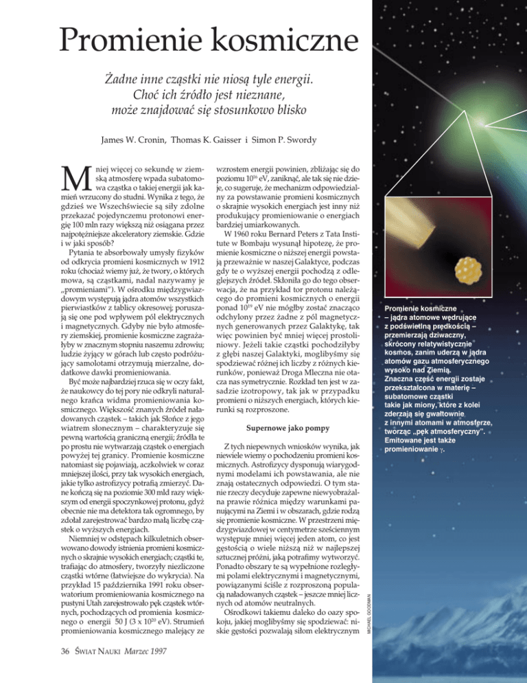 Promienie kosmiczne ˚adne inne czàstki nie niosà tyle energii. Choç ich êród∏o jest nieznane, mo˝e znajdowaç si´ stosunkowo blisko James W. Cronin, Thomas K. Gaisser i Simon P. Swordy 36 ÂWIAT NAUKI Marzec 1997 wzrostem energii powinien, zbli˝ajàc si´ do poziomu 1016 eV, zaniknàç, ale tak si´ nie dzieje, co sugeruje, ˝e mechanizm odpowiedzialny za powstawanie promieni kosmicznych o skrajnie wysokich energiach jest inny ni˝ produkujàcy promieniowanie o energiach bardziej umiarkowanych. W 1960 roku Bernard Peters z Tata Institute w Bombaju wysunà∏ hipotez´, ˝e promienie kosmiczne o ni˝szej energii powstajà przewa˝nie w naszej Galaktyce, podczas gdy te o wy˝szej energii pochodzà z odleglejszych êróde∏. Sk∏oni∏a go do tego obserwacja, ˝e na przyk∏ad tor protonu nale˝àcego do promieni kosmicznych o energii ponad 1019 eV nie móg∏by zostaç znaczàco odchylony przez ˝adne z pól magnetycznych generowanych przez Galaktyk´, tak wi´c powinien byç mniej wi´cej prostoliniowy. Je˝eli takie czàstki pochodzi∏yby z g∏´bi naszej Galaktyki, moglibyÊmy si´ spodziewaç ró˝nej ich liczby z ró˝nych kierunków, poniewa˝ Droga Mleczna nie otacza nas symetrycznie. Rozk∏ad ten jest w zasadzie izotropowy, tak jak w przypadku promieni o ni˝szych energiach, których kierunki sà rozproszone. Promienie kosmiczne – jàdra atomowe w´drujàce z podÊwietlnà pr´dkoÊcià – przemierzajà dziwaczny, skrócony relatywistycznie kosmos, zanim uderzà w jàdra atomów gazu atmosferycznego wysoko nad Ziemià. Znaczna cz´Êç energii zostaje przekszta∏cona w materi´ – subatomowe czàstki takie jak miony, które z kolei zderzajà si´ gwa∏townie z innymi atomami w atmosferze, tworzàc „p´k atmosferyczny”. Emitowane jest tak˝e promieniowanie g. Supernowe jako pompy Z tych niepewnych wniosków wynika, jak niewiele wiemy o pochodzeniu promieni kosmicznych. Astrofizycy dysponujà wiarygodnymi modelami ich powstawania, ale nie znajà ostatecznych odpowiedzi. O tym stanie rzeczy decyduje zapewne niewyobra˝alna prawie ró˝nica mi´dzy warunkami panujàcymi na Ziemi i w obszarach, gdzie rodzà si´ promienie kosmiczne. W przestrzeni mi´dzygwiazdowej w centymetrze szeÊciennym wyst´puje mniej wi´cej jeden atom, co jest g´stoÊcià o wiele ni˝szà ni˝ w najlepszej sztucznej pró˝ni, jakà potrafimy wytworzyç. Ponadto obszary te sà wype∏nione rozleg∏ymi polami elektrycznymi i magnetycznymi, powiàzanymi ÊciÊle z rozproszonà populacjà na∏adowanych czàstek – jeszcze mniej licznych od atomów neutralnych. OÊrodkowi takiemu daleko do oazy spokoju, jakiej moglibyÊmy si´ spodziewaç: niskie g´stoÊci pozwalajà si∏om elektrycznym MICHAEL GOODMAN M niej wi´cej co sekund´ w ziemskà atmosfer´ wpada subatomowa czàstka o takiej energii jak kamieƒ wrzucony do studni. Wynika z tego, ˝e gdzieÊ we WszechÊwiecie sà si∏y zdolne przekazaç pojedynczemu protonowi energi´ 100 mln razy wi´kszà ni˝ osiàgana przez najpot´˝niejsze akceleratory ziemskie. Gdzie i w jaki sposób? Pytania te absorbowa∏y umys∏y fizyków od odkrycia promieni kosmicznych w 1912 roku (chocia˝ wiemy ju˝, ˝e twory, o których mowa, sà czàstkami, nadal nazywamy je „promieniami”). W oÊrodku mi´dzygwiazdowym wyst´pujà jàdra atomów wszystkich pierwiastków z tablicy okresowej; poruszajà si´ one pod wp∏ywem pól elektrycznych i magnetycznych. Gdyby nie by∏o atmosfery ziemskiej, promienie kosmiczne zagra˝a∏yby w znacznym stopniu naszemu zdrowiu; ludzie ˝yjàcy w górach lub cz´sto podró˝ujàcy samolotami otrzymujà mierzalne, dodatkowe dawki promieniowania. Byç mo˝e najbardziej rzuca si´ w oczy fakt, ˝e naukowcy do tej pory nie odkryli naturalnego kraƒca widma promieniowania kosmicznego. Wi´kszoÊç znanych êróde∏ na∏adowanych czàstek – takich jak S∏oƒce z jego wiatrem s∏onecznym – charakteryzuje si´ pewnà wartoÊcià granicznà energii; êród∏a te po prostu nie wytwarzajà czàstek o energiach powy˝ej tej granicy. Promienie kosmiczne natomiast si´ pojawiajà, aczkolwiek w coraz mniejszej iloÊci, przy tak wysokich energiach, jakie tylko astrofizycy potrafià zmierzyç. Dane koƒczà si´ na poziomie 300 mld razy wi´kszym od energii spoczynkowej protonu, gdy˝ obecnie nie ma detektora tak ogromnego, by zdo∏a∏ zarejestrowaç bardzo ma∏à liczb´ czàstek o wy˝szych energiach. Niemniej w odst´pach kilkuletnich obserwowano dowody istnienia promieni kosmicznych o skrajnie wysokich energiach; czàstki te, trafiajàc do atmosfery, tworzy∏y niezliczone czàstki wtórne (∏atwiejsze do wykrycia). Na przyk∏ad 15 paêdziernika 1991 roku obserwatorium promieniowania kosmicznego na pustyni Utah zarejestrowa∏o p´k czàstek wtórnych, pochodzàcych od promienia kosmicznego o energii 50 J (3 x 1020 eV). Strumieƒ promieniowania kosmicznego malejàcy ze ˚ycie promienia kosmicznego Czàstki na poczàtkowym etapie rozwoju kaskady poruszajà si´ tak szybko, ˝e przewy˝szajà w rozrzedzonych górnych warstwach atmosfery pr´dkoÊç Êwiat∏a (nieznacznie ni˝szà ni˝ pr´dkoÊç Êwiat∏a w pró˝ni), i dlatego emitujà promieniowanie Czerenkowa – odpowiednik optyczny huku powstajàcego przy przekraczaniu bariery dêwi´ku. Gdy czàstki powsta∏e w wyniku poczàtkowego zderzenia wpadnà na jàdra atomowe atmosfery, kosztem ich energii mogà powstaç inne czàstki oraz wysokoenergetyczne promieniowanie. Z zasady zachowania p´du wynika, ˝e wi´kszoÊç wykreowanej materii porusza si´ w tym samym kierunku, co poczàtkowy promieƒ kosmiczny, natomiast fotony mogà byç w zasadzie emitowane we wszystkich kierunkach. Miony i inne resztki na koƒcu p´ku atmosferycznego rozproszy∏y ju˝ swojà energi´ na tyle, ˝e ich oddzia∏ywanie z atmosferà generuje g∏ównie promieniowanie ultrafioletowe, powstajàce w wyniku zniszczenia pow∏ok elektronowych w atomach. Âwiat∏o to mo˝e byç wykrywan
