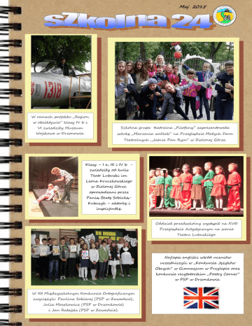Maj 2015 W ramach projektu „Region w obiektywie” klasy IV b i VI zwiedziły Muzeum Szkolna grupa teatralna „Filofany” zaprezentowała Wojskowe w Drzonowie. sztukę „Marzenia wróżek” na Przeglądzie Małych Form Teatralnych „Jaśnie Pan Rym” w Zielonej Górze. Klasy – I a, III i IV b zwiedziły od kulis Teatr Lubuski im. Leona Kruczkowskiego w Zielonej Górze. oprowadzani przez Panią Beatę SobickąKubczyk – aktorkę i inspicjentkę. Oddział przedszkolny wystąpił na XVIII Przeglądzie Artystycznym na scenie Teatru Lubuskiego. Najlepsi angliści wśród uczniów uczestniczyli w „Konkursie Języków Obcych” w Gimnazjum w Przylepie oraz konkursie recytatorskim „Poetry Corner” w PSP w Drzonkowie. W XII Międzyszkolnym Konkursie Ortograficznym zwyciężyli: Paulina Sobieraj (PSP w Zawadzie), Julia Moszkowicz (PSP w Drzonkowie) i Jan Ratajski (PSP w Zawadzie). Maj 2015 Dzień Dziecka Klasa I a przedstawiła „Królewnę Śnieżkę”, Świętowaliśmy też na sportowo. zaprezentowali się instrumentaliści oraz klasy starsze W turnieju triumfowała klasa VI. w szkolnym karaoke. FESTYN SZKOLNO-RODZINNY zorganizowany dzięki dofinansowaniu z budżetu Miasta Zielona Góra przez Stowarzyszenie na Rzecz Rozwoju Zawady Krępy i Publiczną Szkołę Podstawową w Zawadzie odbył się na kompleksie boisk Orlik w Zawadzie. Na scenie wystąpili uczniowie szkoły, mali artyści z Gminnego Przedszkola oraz uczestnicy zajęć Dzieci mogły skorzystać z propozycji gier i zabaw, obejrzeć spektakl prowadzonych przez Stowarzyszenie w ramach projektu „Akademia Talentów”. „Wróżki” przygotowany w ramach akcji „Dorośli Dzieciom” i prezentację sprzętu OSP. Dorośli podziwiali wystawę obrazów Katarzyny Szurkowskiej, korzystali z porad medycznych lub kulinarnych usług kawiarenki prowadzonej przez Radę Rodziców i namiotów gastronomicznych. Swoje trofea odebrali zwycięzcy: konkursów - „Vabank” oraz „Wiem prawie wszystko o Zielonej Górze”, Turnieju Rodzinnego „Zdrowo i wesoło”, rozgrywek finałowych tenisa ziemnego o Puchar „Orlik-Zawada 2015” oraz piłki nożnej – o Puchar Sołtysa Zawady. Organizatorzy dziękują wszystkim Partnerom i Przyjaciołom Szkoły i Stowarzyszenia za pomoc w przedsięwzięciu. Publiczna Szkoła Podstawowa w Zawadzie ul. Zawada - Szkolna 24 66-001 Zielona Góra woj. lubuskie Sekretariat : Tel./fax 068-321-12-68 www.pspzawada.edu.pl Redakcja: E. Kaczmarek, J. Zrobczyńska, A. Nowacki maj 2015