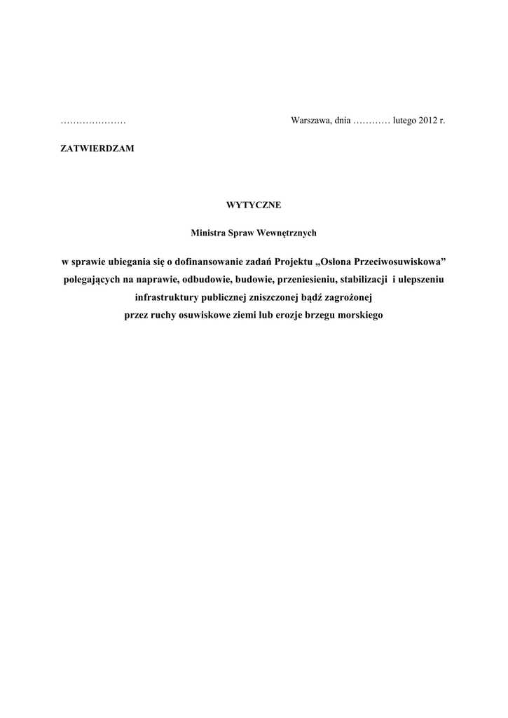 ………………… Warszawa, dnia ………… lutego 2012 r. ZATWIERDZAM WYTYCZNE Ministra Spraw Wewnętrznych w sprawie ubiegania się o dofinansowanie zadań Projektu „Osłona Przeciwosuwiskowa” polegających na naprawie, odbudowie, budowie, przeniesieniu, stabilizacji i ulepszeniu infrastruktury publicznej zniszczonej bądź zagrożonej przez ruchy osuwiskowe ziemi lub erozje brzegu morskiego Cel Projektu Celem Projektu jest finansowanie lub dofinansowanie zadań z zakresu przeciwdziałania ruchom osuwiskowym ziemi i usuwania ich skutków, na które składają się: przygotowanie, projektowanie, wykonanie oraz nadzór nad pojedynczymi zadaniami stanowiącymi część programu odbudowy, przeniesienia i ochrony obiektów infrastruktury użyteczności publicznej. I. Podmioty zaangażowane w realizację Projektu Jednostka Realizująca Projekt (JR): Biuro do Spraw Usuwania Skutków Klęsk Żywiołowych w Ministerstwie Spraw Wewnętrznych. Jednostki Wykonujące (JW): jednostki organizacyjne administracji samorządowej i rządowej oraz inne podmioty sektora finansów publicznych. Jednostki Wspierające Realizację Projektu: podmioty wspierające Jednostkę Realizującą we wdrożeniu Projektu, w szczególności Wojewódzkie Zespoły Nadzorujące Realizację Projektu (WZNRP) powołane przez wojewodów: małopolskiego, podkarpackiego, śląskiego, pomorskiego, świętokrzyskiego, lubelskiego, mazowieckiego, kujawsko-pomorskiego. II. Kwalifikacja zadań W ramach Projektu „Osłona Przeciwosuwiskowa” realizowane będą tylko zadania w dziedzinie naprawy, odbudowy, budowy, przeniesienia, stabilizacji i ulepszenia infrastruktury publicznej zniszczonej bądź zagrożonej wystąpieniem ruchów osuwiskowych ziemi lub erozji brzegu morskiego oraz wykonania systemów (budowli, urządzeń) zaprojektowanych w celu ochrony zagrożonych obszarów przed powtórnym wystąpieniem podobnych zdarzeń katastroficznych. Przeniesienie (budowa) infrastruktury będzie możliwe tylko w przypadkach, gdy stabilizacja osuwiska będzie niemożliwa lub koszty stabilizacji osuwiska będą wyższe od kosztów przeniesienia infrastruktury. Uwaga: 1. Pod uwagę nie będą brane zadania obejmujące szkody i zagrożenia na terenie obszarów niezurbanizowanych dofinansowane z lub pozbawionych Programu infrastruktury priorytetowego technicznej „Przeciwdziałanie oraz osuwiskom zadania ziemi i likwidowanie ich skutków dla środowiska”, prowadzonego przez Narodowy Fundusz Ochrony Środowiska i Gospodarki Wodnej. 2. Odbudowa lub przeniesienie zagrożonej infrastruktury dokonana powinna być w sposób eliminujący możliwość ponownego zniszczenia lub uszkodzenia. 3. Wszystkie zadania, które zostaną włączone do Projektu powinny znajdować się w kompetencjach Jednostek Wykonujących. 2 III. Zasady ubiegania się o dofinansowanie stabilizacji, odbudowy, przeniesienia lub remontów obiektów zniszczonych lub uszkodzonych przez osuwiska oraz jego rozliczania 1. Zgłaszanie potrzeb Podstawę prawną do udzielenia pomocy finansowej z rezerwy celowej budżetu państwa z przeznaczeniem na przeciwdziałanie lub usuwanie skutków klęsk żywiołowych (osuwisk) dla Jednostek Wykonujących stanowią: obowiązująca w danym roku ustawa budżetowa, ustawa z dnia 27 sierpnia 2009 roku o finansach publicznych (Dz. U. Nr 157, poz. 1240, z późn. zm.), inne akty prawne określające źródła dochodów jednostek samorządu terytorialnego oraz zasady i tryb udzielania dotacji, w szczególności ustawa z dnia 13 listopada 2003 r. o dochodach jednostek samorządu terytorialnego (Dz. U. z 2010 r. Nr 80, poz. 526, z późn. zm.). Jednostka Wykonująca ubiegająca się o dofinansowanie powinna sporządzić plan finansowania zadania w podziale na etapy, który ma na celu pomóc w przygotowaniu preliminarza finansowego podziału rezerwy celowej budżetu państwa przez Ministra Spraw Wewnętrznych (załącznik 1 – wzór planu finansowania zadania). Plan ten powinien być elementem wyjściowym przy ubieganiu się o środki finansowe z budżetu państwa z przeznaczeniem na usuwanie skutków osuwisk. Powyższy plan powinien zostać opracowany przez występującą o dofinansowanie JW na podstawie protokołów szkód (załącznik nr 2 - wzór protokołu szkód). Dopuszcza się dokonanie wyceny potrzeb finansowych na podstawie informacji posiadanych przez daną JW, które nie mają charakteru protokołu. Należy jednak przyjąć, iż wysokość strat lub kosztów naprawy, odbudowy lub budowy powinny zostać ustalone z uwzględnieniem wytycznych zawartych w rozporządzeniu Ministra Infrastruktury z dnia 18 maja 2004 r. w sprawie określenia metod i podstaw sporządzania kosztorysu inwestorskiego, obliczania planowanych kosztów prac projektowych oraz planowanych kosztów robót budowlanych określonych w programie funkcjonalno-użytkowym (Dz. U. Nr 130, poz. 1389), albo innych przepisów wydanych na podstawie art. 33 ust. 3 ustawy z dnia 29 stycznia 2004 r. - Prawo zamówień publicznych (Dz. U. z 2010 r. Nr 113, poz. 759, z późn. zm.). Aplikująca o dofinansowanie Jednostka Wykonująca powinna złożyć do Jednostki Realizującej Projekt i właściwego Wojewódzkiego Zespołu Nadzorującego Realizację Projektu, poza wymienionymi wyżej dokumentami, również kopię Karty Rejestracyjnej Osuwiska/Karty Rejestracyjnej Terenu Zagrożonego Ruchami Masowymi Ziemi, oddzielnie dla każdego zadania [załącznik do Rozporządzenia Ministra Środowiska z dnia 20 czerwca 2007 r. 3 w sprawie informacji dotyczących ruchów masowych ziemi (Dz. U. Nr 121, poz. 840)]. Zaleca się agregowanie wspólnych wniosków przez JW, które dotyczą danego osuwiska, a stan właścicielski powodowałby złożenie wniosków przez kilka uprawnionych podmiotów. W tym celu, ubiegające się o dofinansowanie JW mogą zawrzeć porozumienie lub inną umowę określającą prawa i obowiązki stron zaangażowanych w realizację zadania oraz wskazać JW - wiodącą, która b