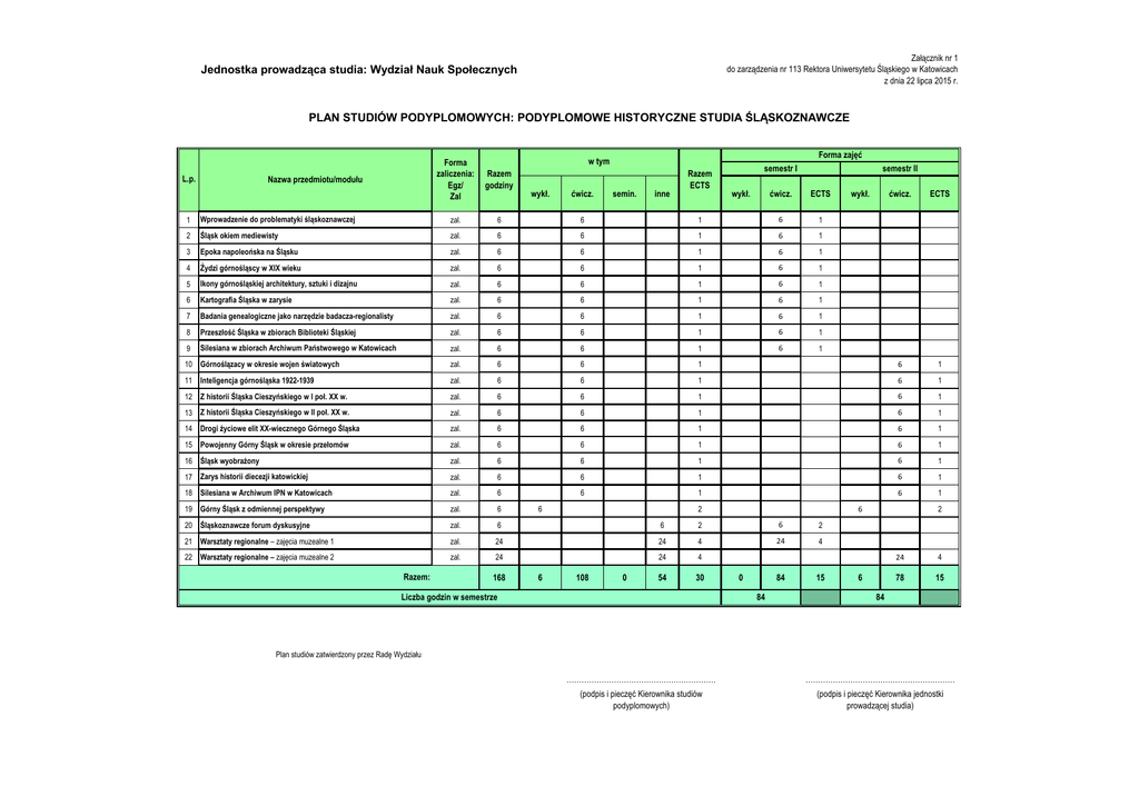 Załącznik nr 1 do zarządzenia nr 113 Rektora Uniwersytetu Śląskiego w Katowicach z dnia 22 lipca 2015 r. Jednostka prowadząca studia: Wydział Nauk Społecznych PLAN STUDIÓW PODYPLOMOWYCH: PODYPLOMOWE HISTORYCZNE STUDIA ŚLĄSKOZNAWCZE L.p. Nazwa przedmiotu/modułu Forma zajęć w tym Forma zaliczenia: Egz/ Zal Razem godziny wykł. ćwicz. semin. inne Razem ECTS semestr I wykł. semestr II ćwicz. ECTS wykł. ćwicz. ECTS 1 Wprowadzenie do problematyki śląskoznawczej zal. 6 6 1 6 1 2 Śląsk okiem mediewisty zal. 6 6 1 6 1 3 Epoka napoleońska na Śląsku zal. 6 6 1 6 1 4 Żydzi górnośląscy w XIX wieku zal. 6 6 1 6 1 5 Ikony górnośląskiej architektury, sztuki i dizajnu zal. 6 6 1 6 1 6 Kartografia Śląska w zarysie zal. 6 6 1 6 1 7 Badania genealogiczne jako narzędzie badacza-regionalisty zal. 6 6 1 6 1 8 Przeszłość Śląska w zbiorach Biblioteki Śląskiej zal. 6 6 1 6 1 9 Silesiana w zbiorach Archiwum Państwowego w Katowicach zal. 6 6 1 6 1 10 Górnoślązacy w okresie wojen światowych zal. 6 6 1 6 1 11 Inteligencja górnośląska 1922-1939 zal. 6 6 1 6 1 12 Z historii Śląska Cieszyńskiego w I poł. XX w. zal. 6 6 1 6 1 13 Z historii Śląska Cieszyńskiego w II poł. XX w. zal. 6 6 1 6 1 14 Drogi życiowe elit XX-wiecznego Górnego Śląska zal. 6 6 1 6 1 15 Powojenny Górny Śląsk w okresie przełomów zal. 6 6 1 6 1 16 Śląsk wyobrażony zal. 6 6 1 6 1 17 Zarys historii diecezji katowickiej zal. 6 6 1 6 1 18 Silesiana w Archiwum IPN w Katowicach zal. 6 6 1 6 1 19 Górny Śląsk z odmiennej perspektywy zal. 6 20 Śląskoznawcze forum dyskusyjne zal. 6 6 2 6 2 21 Warsztaty regionalne – zajęcia muzealne 1 zal. 24 24 4 24 4 22 Warsztaty regionalne – zajęcia muzealne 2 zal. 24 24 4 54 30 Razem: 168 6 6 2 108 0 Liczba godzin w semestrze 2 6 0 84 84 15 6 24 4 78 15 84 Plan studiów zatwierdzony przez Radę Wydziału …………………………………………………… …………………………………………………… (podpis i pieczęć Kierownika studiów podyplomowych) (podpis i pieczęć Kierownika jednostki prowadzącej studia)