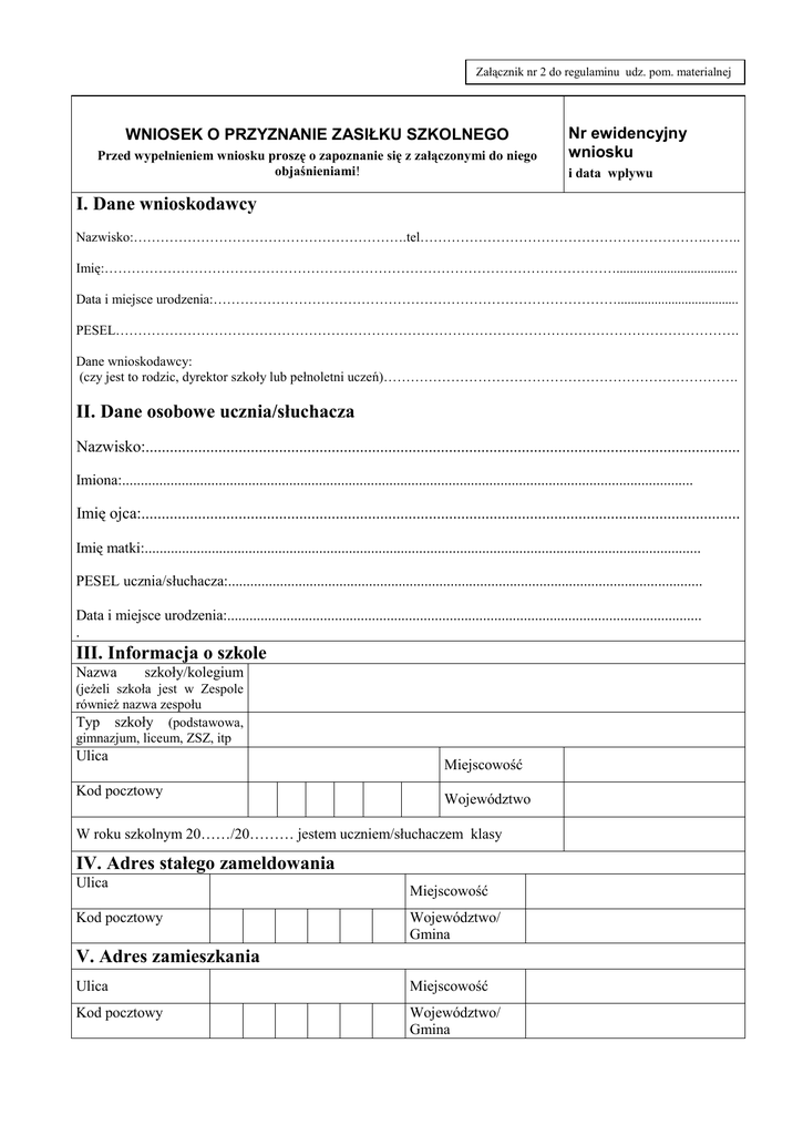 Załącznik nr 2 do regulaminu udz. pom. materialnej WNIOSEK O PRZYZNANIE ZASIŁKU SZKOLNEGO Przed wypełnieniem wniosku proszę o zapoznanie się z załączonymi do niego objaśnieniami! Nr ewidencyjny wniosku i data wpływu I. Dane wnioskodawcy Nazwisko:…………………………………………………….tel……………………………………………………….…….. Imię:…………………………………………………………………………………………………….................................... Data i miejsce urodzenia:……………………………………………………………………………….................................... PESEL…………………………………………………………………………………………………………………………. Dane wnioskodawcy: (czy jest to rodzic, dyrektor szkoły lub pełnoletni uczeń)……………………………………………………………………. II. Dane osobowe ucznia/słuchacza Nazwisko:................................................................................................................................................... Imiona:.......................................................................................................................................................... Imię ojca:.................................................................................................................................................... Imię matki:...................................................................................................................................................... PESEL ucznia/słuchacza:................................................................................................................................ Data i miejsce urodzenia:................................................................................................................................ . III. Informacja o szkole Nazwa szkoły/kolegium (jeżeli szkoła jest w Zespole również nazwa zespołu Typ szkoły (podstawowa, gimnazjum, liceum, ZSZ, itp Ulica Miejscowość Kod pocztowy Województwo W roku szkolnym 20……/20……… jestem uczniem/słuchaczem klasy IV. Adres stałego zameldowania Ulica Miejscowość Kod pocztowy Województwo/ Gmina V. Adres zamieszkania Ulica Miejscowość Kod pocztowy Województwo/ Gmina Uczeń/słuchacz spełnia następujące kryteria do przyznania zasiłku szkolnego: VI. Data zdarzenia losowego: Opis zdarzenia losowego: VII. Wnioskowane formy pomocy pomoc rzeczowa o charakterze edukacyjnym, w tym w szczególności zakupu podręczników, zakupu pomocy świadczenie pieniężne VIII. Oświadczam, iż w roku szkolnym ..................... otrzymałem / nie otrzymałem * zasiłek szkolny Jeśli tak to ile razy..................... IX. Wyrażam zgodę na przetwarzanie danych osobowych wyłącznie dla potrzeb programu pomocy materialnej. ………………………… miejscowość, data ………………………… podpis ucznia/słuchacza pełnoletniego albo rodzica lub opiekuna prawnego ucznia niepełnoletniego X. Oświadczenie o sytuacji rodzinnej i materialnej ucznia Oświadczam, że moja rodzina składa się z .......... osób, pozostających we wspólnym gospodarstwie domowym. Łączny dochód gospodarstwa domowego wynosi ............................,....... zł Średni dochód na 1 osobę miesięcznie wynosi ……… ,.......zł (słownie: ………................……………….............................................................................……..zł) Dochód obliczyłem/am sposobem wskazanym w ustawie o pomocy społecznej, Do niniejszego oświadczenia załączam zaświadczenie o dochodach dla każdej osoby pozostającej we wspólnym gospodarstwie XI. Oświadczenie dotyczące formy wypłacania stypendium szkolnego Przyznane świadczenie proszę przekazać na: □ Konto Nr konta: Nazwa wierzyciela konta …………………………………………………………………………………………… □ Będę odbierał/a w kasie MGOPS w Piasecznie …………………………. (podpis) Uprzedzony o odpowiedzialności potwierdzam własnoręcznym podpisem prawdziwość danych zamieszczonych w niniejszym oświadczeniu. ………………………… miejscowość, data ………………………… podpis ucznia/słuchacza pełnoletniego albo rodzica lub opiekuna prawnego ucznia niepełnoletniego XII. Oświadczenie wnioskodawcy 1) Ja niżej podpisany/a świadomy/a i uprzedzony/a o odpowiedzialności karnej wynikającej z art. 233 ustawy z dnia 6 czerwca 1997r. Kodeks Karny (Dz.U. Nr 88 poz. 553 z późn zmianami) o składaniu fałszywych zeznań lub zatajenie prawdy oświadczam, że wszystkie powyższe dane zawarte we wniosku są zgodne z prawdą. 2) Ja niżej podpisany/a świadomy/a i uprzedzony/a o odpowiedzialności karnej wynikającej z art. 233 ustawy z dnia 6 czerwca 1997r. Kodeks Karny (Dz.U. Nr 88 poz. 553 z późn. zmianami) o składaniu fałszywych zeznań lub zatajenie prawdy, składam stosowne do art. 75 § 2 KPA w brzmieniu “Jeżeli przepis prawa nie wymaga urzędowego potwierdzenia określonych faktów lub stanu prawnego w drodze zaświadczenia właściwego organu administracji, organ administracji publicznej odbiera od strony, na jej wniosek, oświadczenie złożone pod rygorem odpowiedzialności za fałszywe zeznania” oświadczenie, iż utrzymuję się z dochodów zgodnie z przedstawionymi dokumentami. 3) Zgodnie z ustawą z dnia 29 sierpnia 1997r. o ochronie danych osobowych (Dz.U. z 2002 Nr 101 poz. 926 z późn. zmianami) wyrażam zgodę na wykorzystanie danych zawartych we wniosku do realizacji programu przyznawania pomocy materialnej o charakterze socjalnym dla uczniów – stypendium szkolne. Zostałem/am poinformowany/a o przysługującym mi prawie wglądu do danych osobowych, ich poprawiania i kontroli przetwarzania. ..............