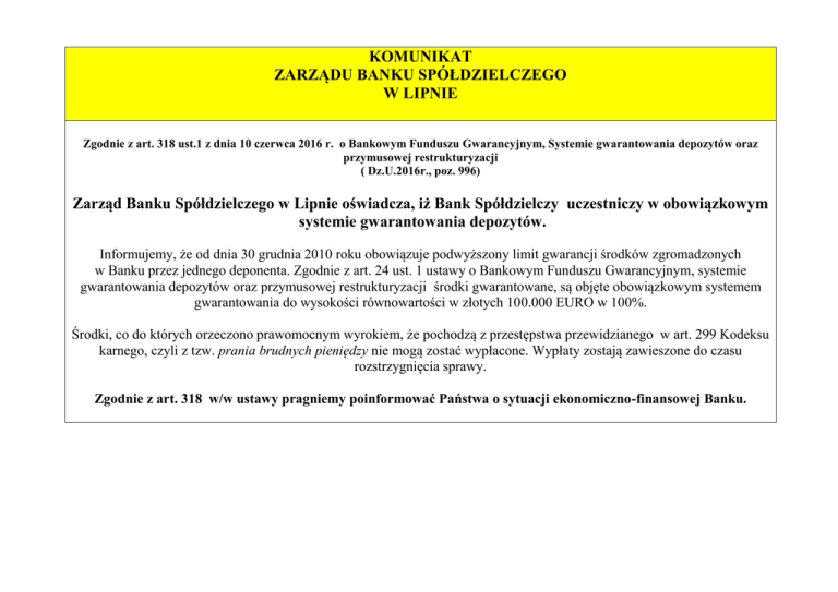 KOMUNIKAT ZARZĄDU BANKU SPÓŁDZIELCZEGO W LIPNIE