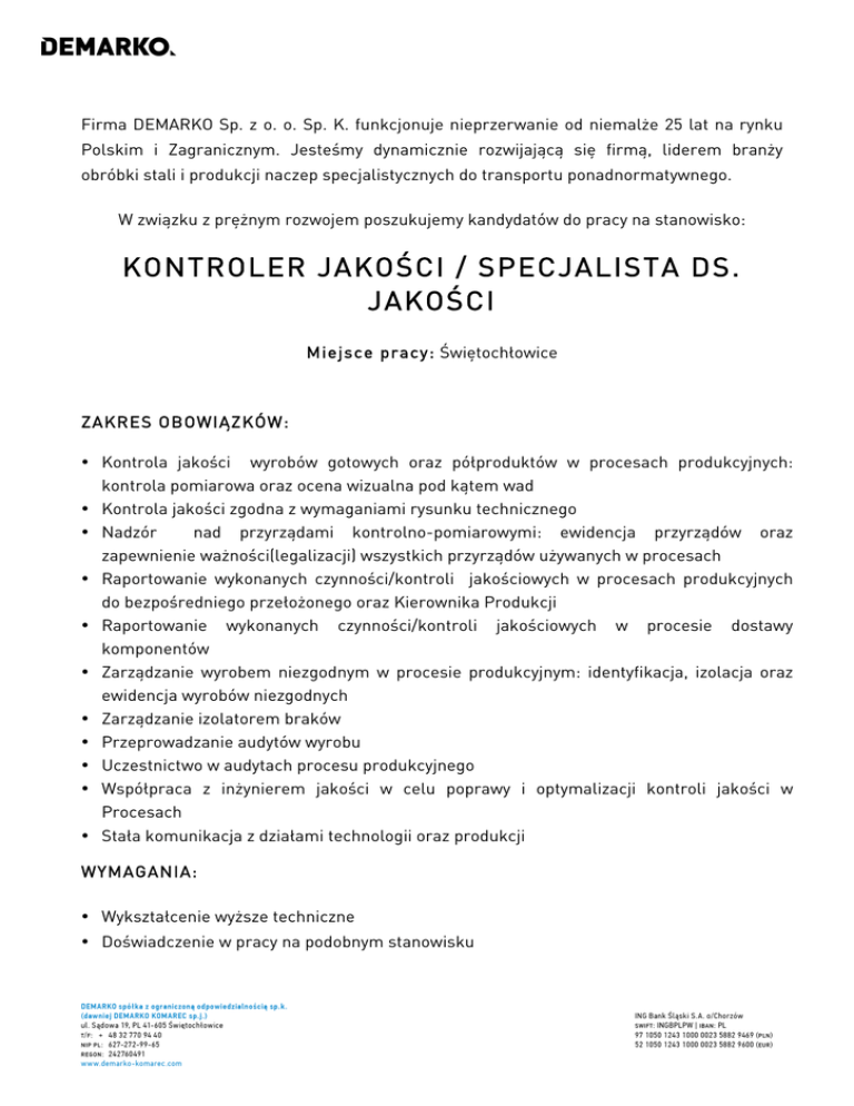 Firma DEMARKO Sp. z o. o. Sp. K. funkcjonuje nieprzerwanie od niemalże 25 lat na rynku Polskim i Zagranicznym. Jesteśmy dynamicznie rozwijającą się firmą, liderem branży obróbki stali i produkcji naczep specjalistycznych do transportu ponadnormatywnego. W związku z prężnym rozwojem poszukujemy kandydatów do pracy na stanowisko: KONTROLER JAKOŚCI / SPECJALISTA DS. JAKOŚCI Miejsce pracy: Świętochłowice ZAKRES OBOWIĄZKÓW: • Kontrola jakości wyrobów gotowych oraz półproduktów w procesach produkcyjnych: kontrola pomiarowa oraz ocena wizualna pod kątem wad • Kontrola jakości zgodna z wymaganiami rysunku technicznego • Nadzór nad przyrządami kontrolno-pomiarowymi: ewidencja przyrządów oraz zapewnienie ważności(legalizacji) wszystkich przyrządów używanych w procesach • Raportowanie wykonanych czynności/kontroli jakościowych w procesach produkcyjnych do bezpośredniego przełożonego oraz Kierownika Produkcji • Raportowanie wykonanych czynności/kontroli jakościowych w procesie dostawy komponentów • Zarządzanie wyrobem niezgodnym w procesie produkcyjnym: identyfikacja, izolacja oraz ewidencja wyrobów niezgodnych • Zarządzanie izolatorem braków • Przeprowadzanie audytów wyrobu • Uczestnictwo w audytach procesu produkcyjnego • Współpraca z inżynierem jakości w celu poprawy i optymalizacji kontroli jakości w Procesach • Stała komunikacja z działami technologii oraz produkcji WYMAGANIA: • Wykształcenie wyższe techniczne • Doświadczenie w pracy na podobnym stanowisku • Znajomość rysunku technicznego – warunek konieczny • Znajomość języka angielskiego w stopniu komunikatywnym • Zdolności analityczne • Bardzo dobra organizacja pracy OFERUJEMY: • Umowę o pracę • Stabilne warunki zatrudnienia • Pracę w dużej, renomowanej, rozwijającej się firmie Zainteresowane osoby prosimy o przesłanie Aplikacji (CV ze zdjęciem + List motywacyjny) na adres: [email protected] Prosimy o zamieszczenie klauzuli: „ Wyrażam zgodę na przetwarzanie moich danych przez firmę DEMARKO spółka z ograniczoną odpowiedzialnością spółka komandytowa dla potrzeb niezbędnych do realizacji procesu rekrutacji (zgodnie z Ustawą z dnia 29.08.1997 o ochronie danych osobowych Dz. U. z 1997 nr 133, poz. 883)”. Uprzejmie informujemy, iż skontaktujemy się wyłącznie z wybranymi kandydatami.