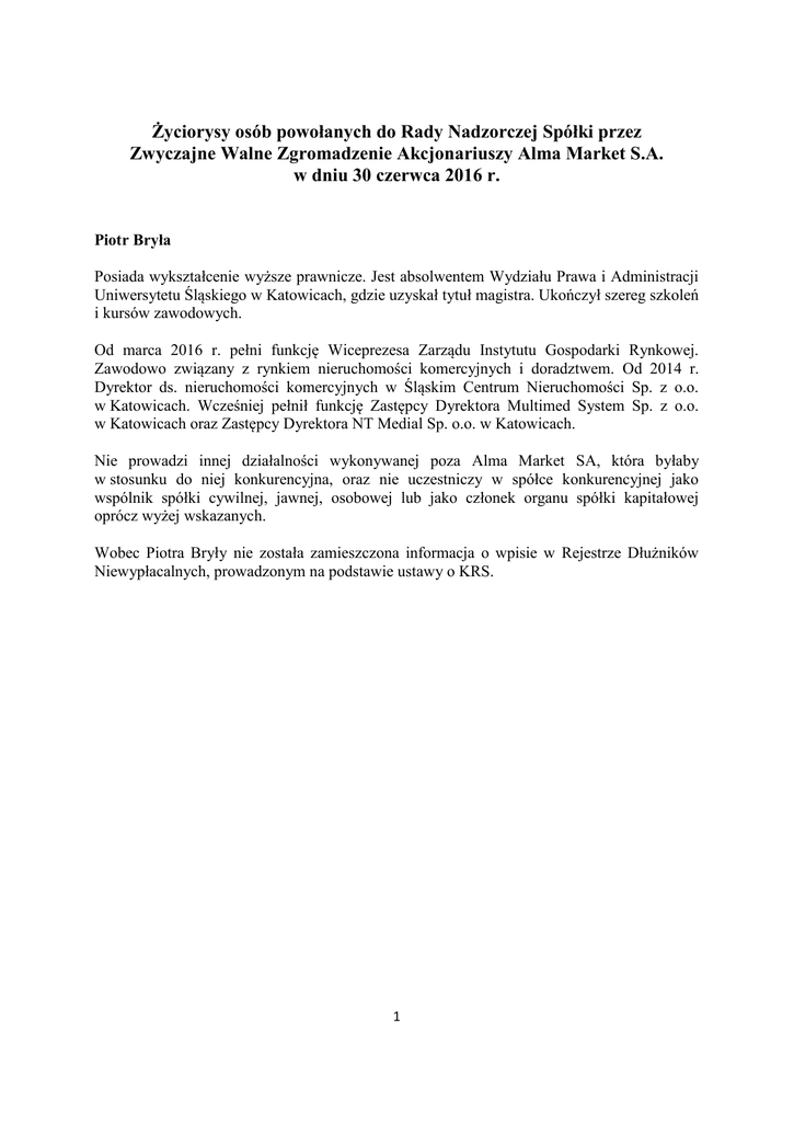Życiorysy osób powołanych do Rady Nadzorczej Spółki przez Zwyczajne Walne Zgromadzenie Akcjonariuszy Alma Market S.A. w dniu 30 czerwca 2016 r. Piotr Bryła Posiada wykształcenie wyższe prawnicze. Jest absolwentem Wydziału Prawa i Administracji Uniwersytetu Śląskiego w Katowicach, gdzie uzyskał tytuł magistra. Ukończył szereg szkoleń i kursów zawodowych. Od marca 2016 r. pełni funkcję Wiceprezesa Zarządu Instytutu Gospodarki Rynkowej. Zawodowo związany z rynkiem nieruchomości komercyjnych i doradztwem. Od 2014 r. Dyrektor ds. nieruchomości komercyjnych w Śląskim Centrum Nieruchomości Sp. z o.o. w Katowicach. Wcześniej pełnił funkcję Zastępcy Dyrektora Multimed System Sp. z o.o. w Katowicach oraz Zastępcy Dyrektora NT Medial Sp. o.o. w Katowicach. Nie prowadzi innej działalności wykonywanej poza Alma Market SA, która byłaby w stosunku do niej konkurencyjna, oraz nie uczestniczy w spółce konkurencyjnej jako wspólnik spółki cywilnej, jawnej, osobowej lub jako członek organu spółki kapitałowej oprócz wyżej wskazanych. Wobec Piotra Bryły nie została zamieszczona informacja o wpisie w Rejestrze Dłużników Niewypłacalnych, prowadzonym na podstawie ustawy o KRS. 1 Barbara Mazgaj Od 1999 roku pełni funkcję członka Rady Nadzorczej Alma Market S.A., a w latach 2004 2011 była Przewodniczącą Rady Nadzorczej Alma Market SA. Od 2011 do 2014 roku pełniła funkcję Wiceprzewodniczącej Rady Nadzorczej. Barbara Mazgaj od wielu lat jest zaangażowana w działalność handlową wraz ze swoim mężem. W latach 2004 - 2007 roku pełniła funkcję Wiceprzewodniczącej Rady Nadzorczej w spółce Krakchemia S.A. Od 2010 roku jest Wiceprzewodniczącą Rady Nadzorczej Krakchemia S.A. Posiada wykształcenie wyższe. Jest absolwentką Akademii Rolniczej w Krakowie. Nie prowadzi innej działalności wykonywanej poza Alma Market SA, która byłaby w stosunku do niej konkurencyjna, oraz nie uczestniczy w spółce konkurencyjnej jako wspólnik spółki cywilnej, jawnej, osobowej lub jako członek organu spółki kapitałowej oprócz wyżej wskazanych. Wobec Barbary Mazgaj nie została zamieszczona informacja o wpisie w Rejestrze Dłużników Niewypłacalnych, prowadzonym na podstawie ustawy o KRS. 2 Wojciech Mazgaj Od 2001 roku pełni funkcję członka Rady Nadzorczej Alma Market S.A. W latach 2004 2011 był Wiceprzewodniczącym Rady Nadzorczej, natomiast od roku 2011 sprawuje funkcję Sekretarza Rady Nadzorczej. Obecnie prowadzi własną działalność gospodarczą w formie spółki cywilnej YOSI.PL specjalizującej się we wdrożeniach i serwisie systemów klasy ERP oraz w rozwiązaniach z zakresu systemów bazodanowych, systemów analitycznych oraz hurtowni danych. Posiada wykształcenie wyższe niepełne. Nie prowadzi innej działalności wykonywanej poza Alma Market SA, która byłaby w stosunku do niej konkurencyjna, oraz nie uczestniczy w spółce konkurencyjnej jako wspólnik spółki cywilnej, jawnej, osobowej lub jako członek organu spółki kapitałowej oprócz wyżej wskazanych. Wobec Wojciecha Mazgaja nie została zamieszczona informacja o wpisie w Rejestrze Dłużników Niewypłacalnych, prowadzonym na podstawie ustawy o KRS. 3 Władysław Kardasiński Jest emerytowanym żołnierzem zawodowym. Posiada wykształcenie średnie, administracyjno-prawne, szkoła oficerska. W latach 2003-2004 pełnił funkcję członka Rady Nadzorczej Alma Market S.A. Nie prowadzi innej działalności wykonywanej poza Alma Market SA, która byłaby w stosunku do niej konkurencyjna, oraz nie uczestniczy w spółce konkurencyjnej jako wspólnik spółki cywilnej, jawnej, osobowej lub jako członek organu spółki kapitałowej. Jest powiązany rodzinnie (powinowaty I stopnia) z osobą akcjonariusza większościowego pana Jerzego Mazgaja. Wobec Władysława Kardasińskiego nie została zamieszczona informacja o wpisie w Rejestrze Dłużników Niewypłacalnych, prowadzonym na podstawie ustawy o KRS. 4 Andrzej Kardasiński Posiada wykształcenie wyższe, jest absolwentem Studium Nauczycielskiego w Tarnowie oraz Akademii Sztuk Pięknych w Paryżu - kierunek dekoratorstwo. W okresie od 2005 r. do 2007 r. pełnił funkcję członka Rady Nadzorczej spółki Premium Cigars Sp. z o.o. Od 2002 r. pełni funkcję dyrektora sprzedaży w spółce Paradise Group Sp. z o.o. Biegle włada językiem francuskim. Nie prowadzi innej działalności wykonywanej poza Alma Market SA, która byłaby w stosunku do niej konkurencyjna, oraz nie uczestniczy w spółce konkurencyjnej jako wspólnik spółki cywilnej, jawnej, osobowej lub jako członek organu spółki kapitałowej. Jest powiązany rodzinnie z osobą akcjonariusza większościowego pana Jerzego Mazgaja. Wobec Andrzeja Kardasińskiego nie została zamieszczona informacja o wpisie w Rejestrze Dłużników Niewypłacalnych, prowadzonym na podstawie ustawy o KRS. 5
