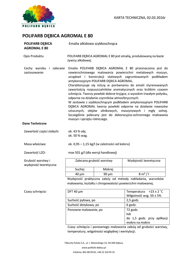 KARTA TECHNICZNA, 02.03.2016r POLIFARB DĘBICA AGROMAL E 80 POLIFARB DĘBICA AGROMAL E 80 Opis Produktu Emalia alkidowa szybkoschnąca POLIFARB DĘBICA AGROMAL E 80 jest emalią, produkowaną na bazie żywicy alkidowej. Cechy wyrobu i zalecane Emalia POLIFARB DĘBICA AGROMAL E 80 przeznaczona jest do zastosowanie: nawierzchniowego malowania powierzchni metalowych maszyn, urządzeń i konstrukcji stalowych zagruntowanych podkładem antykorozyjnym POLIFARB DĘBICA AGROMAL. Charakteryzuje się niższą w porównaniu do emalii styrenowanych zawartością rozpuszczalników aromatycznych oraz krótkim czasem schnięcia. Tworzy powłoki dobrze kryjące, o wysokim trwałym połysku, odporne na działanie czynników atmosferycznych. W zestawie z szybkoschnącym podkładem antykorozyjnym POLIFARB DĘBICA AGROMAL tworzy powłoki odporne na działanie nawozów sztucznych, olejów silnikowych, maszynowych i mgły solnej. Szczególnie polecany jest do dekoracyjno-ochronnego malowania maszyn i sprzętu rolniczego. Dane Techniczne Zawartość części stałych: ok. 43 % obj. ok. 50 % wag. Masa właściwa: ok. 0,95 – 1,15 kg/l (w zależności od koloru) Zawartość LZO: max 501 g/l (dla wersji handlowej) Grubość warstwy i wydajność teoretyczna Zalecana grubość warstwy Wydajność teoretyczna Suchej Mokrej 40 µm 90 µm 8 m² / l Wydajność praktyczna zależy od metody nakładania, warunków malowania, kształtu i chropowatości powierzchni malowanej. Czasy schnięcia: DFT 40 µm Temperatura +23 ± 2 ˚C Wilgotność wzg. 50 ± 5% Suchość pyłowa, po 2,5 godz. Suchość dotykowa, po 6 godz. Ponowne malowanie, po 72 godz. lub do 1,5 godz. przy aplikacji mokro na mokro Czasy schnięcia i ponownego malowania zależą od grubości warstwy, temperatury, wilgotności względnej i wentylacji. Tikkurila Polska S.A., ul. I. Mościckiego 23, 39-200 Dębica, www.polifarb-debica.pl Infolinia: 801 88 99 65, +48 22 310 95 55 KARTA TECHNICZNA, 02.03.2016r POLIFARB DĘBICA AGROMAL E 80 Wykończenie powierzchni: Połysk Kolory: Czarny, czerwony karminowy 3002, czerwony ognisty 3000. W celu uniknięcia różnic w odcieniach należy użyć farby z jednej partii produkcyjnej. Dane Aplikacyjne Przygotowanie Powierzchni: Usunąć oleje, tłuszcze, sole i inne zanieczyszczenia powierzchni, używając odpowiednich środków. Warunki nakładania: Emalię przed użyciem należy dokładnie wymieszać, a w razie potrzeby rozcieńczyć do wymaganej lepkości. Zaleca się nakładanie 1-2 warstw emalii w zależności od zagrożenia korozyjnego środowiska -. Czynność malowania należy prowadzić przy temperaturze otoczenia od +5°C do +30°C i wilgotności względnej powietrza poniżej 80%, przy czym temperatura podłoża powinna być co najmniej o 3°C wyższa od temperatury punktu rosy. Nakładanie: Przed użyciem farbę dokładnie wymieszać. Pędzel – farba o lepkości handlowej. Natrysk pneumatyczny – sugerowane parametry: – lepkość umowna mierzona kubkiem wypływowym z dnem stożkowym o średnicy otworu 4 mm – 25-30 s, – średnica dyszy – 1,5 - 2,5 mm, – ciśnienie – 2,5-3,5 bar, Natrysk hydrodynamiczny – sugerowane parametry: – lepkość umowna mierzona kubkiem wypływowym z dnem stożkowym o średnicy otworu 4mm – 70-90 s, – średnica dyszy – 0,013”-0,015”, – ciśnienie w dyszy – ok. 120 – 160bar, Producent nie odpowiada za jakość wymalowań w przypadku nieprzestrzegania podanych zaleceń. Rozcieńczalnik Rozcieńczalnik do wyrobów alkidowych dla przemysłu maszynowego marki Polifarb Dębica. Czyszczenie narzędzi Rozcieńczalnik do wyrobów alkidowych dla przemysłu maszynowego marki Polifarb Dębica. Termin przydatności 18 miesięcy od daty produkcji, w fabrycznie zamkniętym opakowaniu. Tikkurila Polska S.A., ul. I. Mościckiego 23, 39-200 Dębica, www.polifarb-debica.pl Infolinia: 801 88 99 65, +48 22 310 95 55 KARTA TECHNICZNA, 02.03.2016r POLIFARB DĘBICA AGROMAL E 80 Opakowania 20 l Bezpieczeństwo Zawsze należy zwracać uwagę na etykietę ostrzegawczą, znajdującą się na opakowaniu. Dodatkowe informacje o zagrożeniach i ich zapobieganiu ujęte są w kartach charakterystyki produktu. Zawiera: ksylen. Uwaga! Łatwopalna ciecz i pary. Działa drażniąco na oczy. Działa drażniąco na skórę. Może powodować uszkodzenie narządów poprzez długotrwałe lub narażenie powtarzane. Działa szkodliwie na organizmy wodne, powodując długotrwałe skutki. Zawiera bezwodnik ftalowy, estryfikowany polieter alifatyczny z kwasem maleinowym i oksym ketonu etylowo-metylowego. Może powodować wystąpienie reakcji alergicznej. Unikać wdychania mgły/par/rozpylonej cieczy. Stosować rękawice ochronne/odzież ochronną. W przypadku niedostatecznej wentylacji stosować indywidualne środki ochrony dróg oddechowych. Chronić przed urządzeniami iskrzącymi i otwartym ogniem. Nie palić. Unikać uwolnienia do środowiska. W PRZYPADKU DOSTANIA SIĘ DO OCZU: Ostrożnie płukać wodą przez kilka minut. Transport i przechowywanie Przechowywać i transportować w szczelnie zamkniętym opakowaniu, w temperaturze od +5°C do +25°C. Składować w pomieszczeniach suchych i przewiewnych. Produkt jest klasyfikowany jako towar niebezpieczny w rozumieniu przepisów transportowych (ADR/RID) klasa 3 UN 1263. Natrysk pneumatyczny, hydrodynamiczny, nakładanie pędzlem: Produkt przeznaczony jest wyłącznie do stosowania w instalacjach, w których stosuje się przepisy w sprawie standardów emisyjnych. WYRÓB TYLKO DO UŻYTKU PRZEMYSŁOWEGO Powyższe informacje nie są wyczerpujące i kompletne. Dane opierają się na badaniach laboratoryjnych oraz doświadczeniu praktycznym i są przekazywane zgodnie z naszą najlepszą wiedzą. Jakość wyrobu zagwarantowana jest naszym systemem produkcji opartym na wymaganiach norm ISO 9001 i ISO 14001. Jako producent nie możemy kontrolować warunków, w jakich produkt jest używany lub różnorodności czynników, które mają wpływ na wykorzystanie 