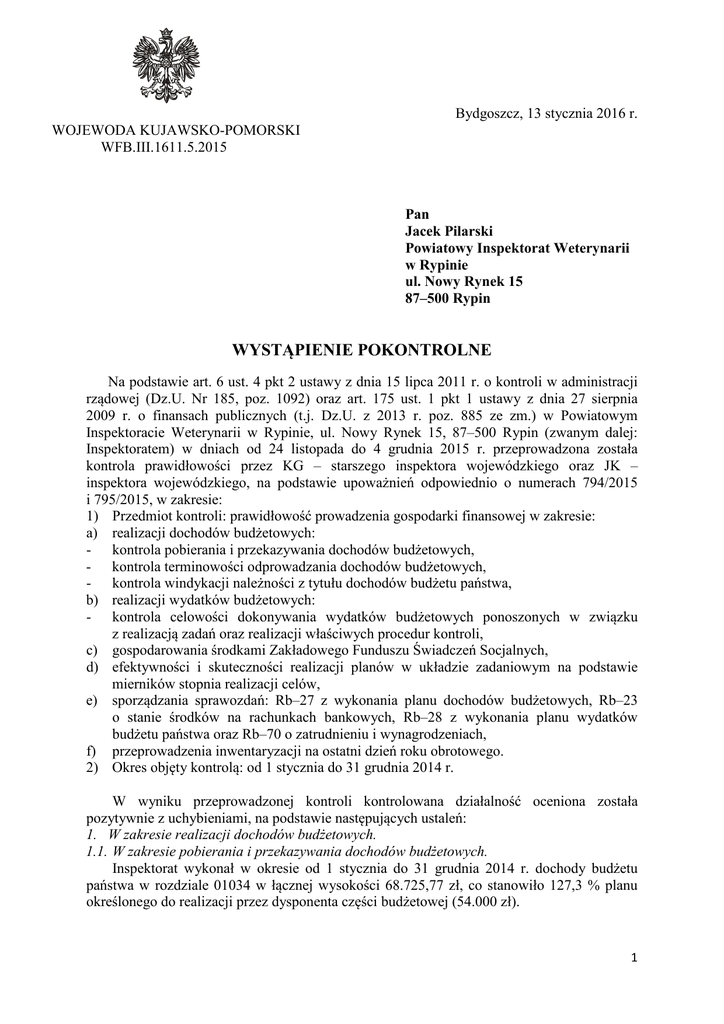 Bydgoszcz, 13 stycznia 2016 r. WOJEWODA KUJAWSKO-POMORSKI WFB.III.1611.5.2015 Pan Jacek Pilarski Powiatowy Inspektorat Weterynarii w Rypinie ul. Nowy Rynek 15 87–500 Rypin WYSTĄPIENIE POKONTROLNE Na podstawie art. 6 ust. 4 pkt 2 ustawy z dnia 15 lipca 2011 r. o kontroli w administracji rządowej (Dz.U. Nr 185, poz. 1092) oraz art. 175 ust. 1 pkt 1 ustawy z dnia 27 sierpnia 2009 r. o finansach publicznych (t.j. Dz.U. z 2013 r. poz. 885 ze zm.) w Powiatowym Inspektoracie Weterynarii w Rypinie, ul. Nowy Rynek 15, 87–500 Rypin (zwanym dalej: Inspektoratem) w dniach od 24 listopada do 4 grudnia 2015 r. przeprowadzona została kontrola prawidłowości przez KG – starszego inspektora wojewódzkiego oraz JK – inspektora wojewódzkiego, na podstawie upoważnień odpowiednio o numerach 794/2015 i 795/2015, w zakresie: 1) Przedmiot kontroli: prawidłowość prowadzenia gospodarki finansowej w zakresie: a) realizacji dochodów budżetowych: - kontrola pobierania i przekazywania dochodów budżetowych, - kontrola terminowości odprowadzania dochodów budżetowych, - kontrola windykacji należności z tytułu dochodów budżetu państwa, b) realizacji wydatków budżetowych: - kontrola celowości dokonywania wydatków budżetowych ponoszonych w związku z realizacją zadań oraz realizacji właściwych procedur kontroli, c) gospodarowania środkami Zakładowego Funduszu Świadczeń Socjalnych, d) efektywności i skuteczności realizacji planów w układzie zadaniowym na podstawie mierników stopnia realizacji celów, e) sporządzania sprawozdań: Rb–27 z wykonania planu dochodów budżetowych, Rb–23 o stanie środków na rachunkach bankowych, Rb–28 z wykonania planu wydatków budżetu państwa oraz Rb–70 o zatrudnieniu i wynagrodzeniach, f) przeprowadzenia inwentaryzacji na ostatni dzień roku obrotowego. 2) Okres objęty kontrolą: od 1 stycznia do 31 grudnia 2014 r. W wyniku przeprowadzonej kontroli kontrolowana działalność oceniona została pozytywnie z uchybieniami, na podstawie następujących ustaleń: 1. W zakresie realizacji dochodów budżetowych. 1.1. W zakresie pobierania i przekazywania dochodów budżetowych. Inspektorat wykonał w okresie od 1 stycznia do 31 grudnia 2014 r. dochody budżetu państwa w rozdziale 01034 w łącznej wysokości 68.725,77 zł, co stanowiło 127,3 % planu określonego do realizacji przez dysponenta części budżetowej (54.000 zł). 1 Wszystkie zrealizowane dochody w ww. rozdziale, które objęto badaniem kontrolnym, zostały przekazane na odpowiedni rachunek dochodów centralnego rachunku bieżącego budżetu państwa. Skontrolowano, na podstawie dowodów źródłowych oraz zapisów w księgach rachunkowych, dochody budżetowe (należne, wykonane i przekazane) w ww. rozdziale pobrane w I kwartale 2014 r. w wysokości 16.550,63 zł. W toku kontroli stwierdzono, iż Inspektorat naliczył, zaewidencjonował i pobrał odsetki w wysokości 1 zł, z tytułu zwrotu nienależnie pobranego w roku poprzednim wynagrodzenia za wykonane czynności weterynaryjne, w kwocie 29,25 zł, w sytuacji, gdy wysokość tych odsetek nie przekraczała trzykrotności wartości opłaty dodatkowej pobieranej przez operatora wyznaczonego w rozumieniu ustawy z dnia 23 listopada 2012 r. – Prawo pocztowe za traktowanie przesyłki listowej jako przesyłki poleconej, tj. do wysokości 8,70 zł – obowiązującej od 1 lutego 2014 r., co było niezgodne z art. 54 § 1 pkt 5 ustawy z dnia 29 sierpnia 1997 r. Ordynacja podatkowa (t.j. Dz.U. z 2012 r., poz. 749 ze zm.). 1.2. W zakresie terminowości odprowadzania dochodów budżetowych. W okresie objętym szczegółowym badaniem, wszystkie pobrane dochody budżetowe w rozdziale 01034 przekazywane były na rachunek dochodów budżetu państwa w terminach określonych w § 4 ust. 2 obwiązującego do 31 stycznia 2014 r. rozporządzenia Ministra Finansów z dnia 20 grudnia 2010 r. w sprawie szczegółowego sposobu wykonywania budżetu państwa (Dz.U. Nr 245, poz. 1637 ze zm.) oraz § 4 ust. 2 obwiązującego od 31 stycznia 2014 r. rozporządzenia Ministra Finansów z dnia 15 stycznia 2014 r. w sprawie szczegółowego sposobu wykonywania budżetu państwa (Dz.U. z 2014 r., poz. 82 ze zm.). 1.3. W zakresie windykacji należności z tytułu dochodów budżetu państwa. Należności wymagalne z tytułu dochodów budżetowych w rozdziale 01034, według stanu na 31.12.2014 r. wyniosły 4.456,45 zł. Wszystkie należności wymagalne powstałe w okresie objętym szczegółowym badaniem oraz w poprzedzającym okres objęty kontrolą, były objęte postępowaniem windykacyjnym lub też zostały uregulowane zarówno w trakcie okresu będącego przedmiotem kontroli, jak i po tym okresie. 2. W zakresie realizacji wydatków budżetowych. 2.1. W zakresie celowości dokonywania wydatków budżetowych ponoszonych w związku z realizacją zadań oraz realizacji właściwych procedur kontroli. W 2014 r. Inspektorat wydatkował środki publiczne w rozdziale 01034 na realizację statutowych zadań w wysokości 1.194.967,42 zł, tj. 97,9 % planowanej kwoty (1.221.000 zł). Skontrolowano, na podstawie dowodów źródłowych oraz zapisów w księgach rachunkowych, wydatki budżetowe poniesione w ww. rozdziale w I kwartale 2014 r., w łącznej wysokości 226.204,92 zł, tj. 18,9 % ogólnej kwoty wydatków dokonanych w tym rozdziale w okresie objętym kontrolą. Na podstawie przeprowadzonej kontroli stwierdzono, że Inspektorat w związku z realizacją zadań dokonywał wydatków celowo oraz ponosił niezbędne koszty na funkcjonowanie jednostki. Stwierdzono niewłaściwe zaklasyfikowanie do § 4300 wydatków poniesionych z tytułu: podgrzewania dostarczonej do Inspektoratu wody, w łącznej kwocie 151,20 zł oraz administrowania, w łącznej kwocie 160,60 zł. Zgodnie z przepisami rozporządzenia Ministra Finansów z dnia 2 marca 2010 r. w sprawie szczegółowej klasyfikacji dochodów, wydatków, przychodów i rozchodów oraz środków pochodzących ze 
