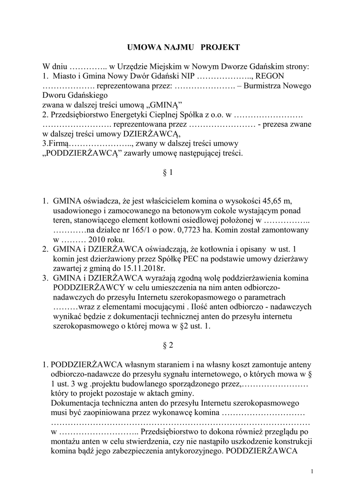 UMOWA NAJMU PROJEKT W dniu ………….. w Urzędzie Miejskim w Nowym Dworze Gdańskim strony: 1. Miasto i Gmina Nowy Dwór Gdański NIP ……………….., REGON ………………. reprezentowana przez: …………………. – Burmistrza Nowego Dworu Gdańskiego zwana w dalszej treści umową „GMINĄ” 2. Przedsiębiorstwo Energetyki Cieplnej Spółka z o.o. w ……………………. ……………………. reprezentowana przez …………………… - prezesa zwane w dalszej treści umowy DZIERŻAWCĄ, 3.Firmą………………….., zwany w dalszej treści umowy „PODDZIERŻAWCĄ” zawarły umowę następującej treści. §1 1. GMINA oświadcza, że jest właścicielem komina o wysokości 45,65 m, usadowionego i zamocowanego na betonowym cokole wystającym ponad teren, stanowiącego element kotłowni osiedlowej położonej w …………….. …………na działce nr 165/1 o pow. 0,7723 ha. Komin został zamontowany w ……… 2010 roku. 2. GMINA i DZIERŻAWCA oświadczają, że kotłownia i opisany w ust. 1 komin jest dzierżawiony przez Spółkę PEC na podstawie umowy dzierżawy zawartej z gminą do 15.11.2018r. 3. GMINA i DZIERŻAWCA wyrażają zgodną wolę poddzierżawienia komina PODDZIERŻAWCY w celu umieszczenia na nim anten odbiorczonadawczych do przesyłu Internetu szerokopasmowego o parametrach ………wraz z elementami mocującymi . Ilość anten odbiorczo - nadawczych wynikać będzie z dokumentacji technicznej anten do przesyłu internetu szerokopasmowego o której mowa w §2 ust. 1. §2 1. PODDZIERŻAWCA własnym staraniem i na własny koszt zamontuje anteny odbiorczo-nadawcze do przesyłu sygnału internetowego, o których mowa w § 1 ust. 3 wg .projektu budowlanego sporządzonego przez,…………………… który to projekt pozostaje w aktach gminy. Dokumentacja techniczna anten do przesyłu Internetu szerokopasmowego musi być zaopiniowana przez wykonawcę komina ………………………… ………………………………………………………………………………… w ……………………….. Przedsiębiorstwo to dokona również przeglądu po montażu anten w celu stwierdzenia, czy nie nastąpiło uszkodzenie konstrukcji komina bądź jego zabezpieczenia antykorozyjnego. PODDZIERŻAWCA 1 zapłaci wykonawcy komina koszty przeglądu w wysokości 1500,- zł (słownie: jeden tysiąc pięćset 00/100 zł) plus należny podatek VAT. 2. PODDZIERŻAWCA w terminie 7 dni po wygaśnięciu lub rozwiązaniu niniejszej umowy zobowiązuje się własnym staraniem i na własny koszt zdemontować zainstalowane anteny wraz z elementami mocującymi i usunąć je z terenu kotłowni. 3. W przypadku niewywiązania się z obowiązku określonego w ust. 2 DZIERŻAWCA usunie anteny i inne elementy mocujące na własny koszt i obciąży nim PODDZIERŻAWCĘ. PODDZIERŻAWCA zobowiązuje się zwrócić ten koszt DZIERŻAWCY w terminie 7 dni od daty otrzymania wezwania do zapłaty. W przypadku nieuregulowania zapłaty w określonym terminie naliczone zostaną ustawowe odsetki. §3 1. PODDZIERŻAWCA zobowiązuje się do sprawdzenia przynajmniej raz na pół roku stanu technicznego anten i elementów mocujących oraz poddzierżawianych części komina w obecności przedstawiciela DZIERŻAWCY. 2. PODDZIERŻAWCA zabezpieczy każdorazowo odpowiednim materiałem antykorozyjnym zauważone ubytki w warstwie ochronnej komina zarówno w obrębie zamontowanych anten i uchwytów mocujących jak i miejsc, które zostały narażone w wyniku wykonywanych czynności konserwacyjnych i przeglądowych. 3. Czynności, o których mowa w ust 2, PODDZIERŻAWCA wykona także na każdorazowe wezwanie DZIERŻAWCY przy czym DZIERŻAWCA może wykonywać te czynność samodzielnie, po uprzednim pisemnym uzgodnieniu z PODDZIERŻAWCĄ i na jego koszt. §4 W przypadku zauważenia przez DZIERŻAWCĘ nieprawidłowości powstałych w trakcie eksploatacji anten np. uszkodzenia elementów mocujących lub anten, DZIERŻAWCA powiadomi niezwłocznie PODDZIERZAWCĘ o zauważonych usterkach a PODDZIERŻAWCA usunie je najpóźniej w ciągu 24 godzin od chwili powiadomienia. §5 GMINA I DZIERŻAWCA nie ponoszą odpowiedzialności za uszkodzenia lub zniszczenie anten i elementów je mocujących jeżeli nie powstały one z winy DZIERŻAWCY. 2 §6 1. W przypadku zamiaru zmiany anten lub elementów mocujących a także umieszczenia na kominie innych nowych elementów nie objętych niniejszą umową, PODDZIERŻAWCA zobowiązuje się uzyskać na to uprzednią zgodę GMINY na piśmie. W takim przypadku GMINA uzależnia swoja zgodę od opinii DZIERŻAWCY i wykonawcy komina a ponadto zastrzega sobie prawo podniesienia czynszu określonego w niniejszej umowie. §7 PODDZIERŻAWCA zobowiązuje się: 1. przestrzegać przepisy Ustawy Prawo Budowlane, 2. przestrzegać przepisy bezpieczeństwa i higieny pracy podczas montowania, eksploatacji anten i ich demontażu, 3. uporządkować teren każdorazowo po wykonaniu robót, §8 PODDZIERŻAWCA bierze na siebie całkowitą odpowiedzialność za bezpieczeństwo zdrowia i życia swoje, swoich pracowników oraz wszystkich innych osób współpracujących z PODDZIERŻAWCĄ w zakresie montowania, eksploatacji, konserwacji, przeglądów i demontażu anten odbiorczo-nadawczych i innych elementów mocujących te urządzenia, a także za bezpieczeństwo zdrowia i życia pracowników DZIERŻAWCY, GMINY i innych osób przebywających na tym terenie. §9 Dla zabezpieczenia swoich zobowiązań wobec GMINY z tytułu ewentualnego uszkodzenia komina PODDZIERŻAWCA wnosi na rzecz Gminy zabezpieczenie finansowe w wysokości 2140 zł (słownie złotych: dwa tysiące sto czterdzieści 00/100) na okres gwarancji komina tj. do dnia 27 stycznia 2012 roku. § 10 1.Czynsz dzierżawny za udostępnienie komina wynosi miesięcznie ……….. zł (słownie złotych: ………………………………….. 00/100) plus należny podatek VAT. 2.Czynsz płatny jest na konto Urzędu Miej
