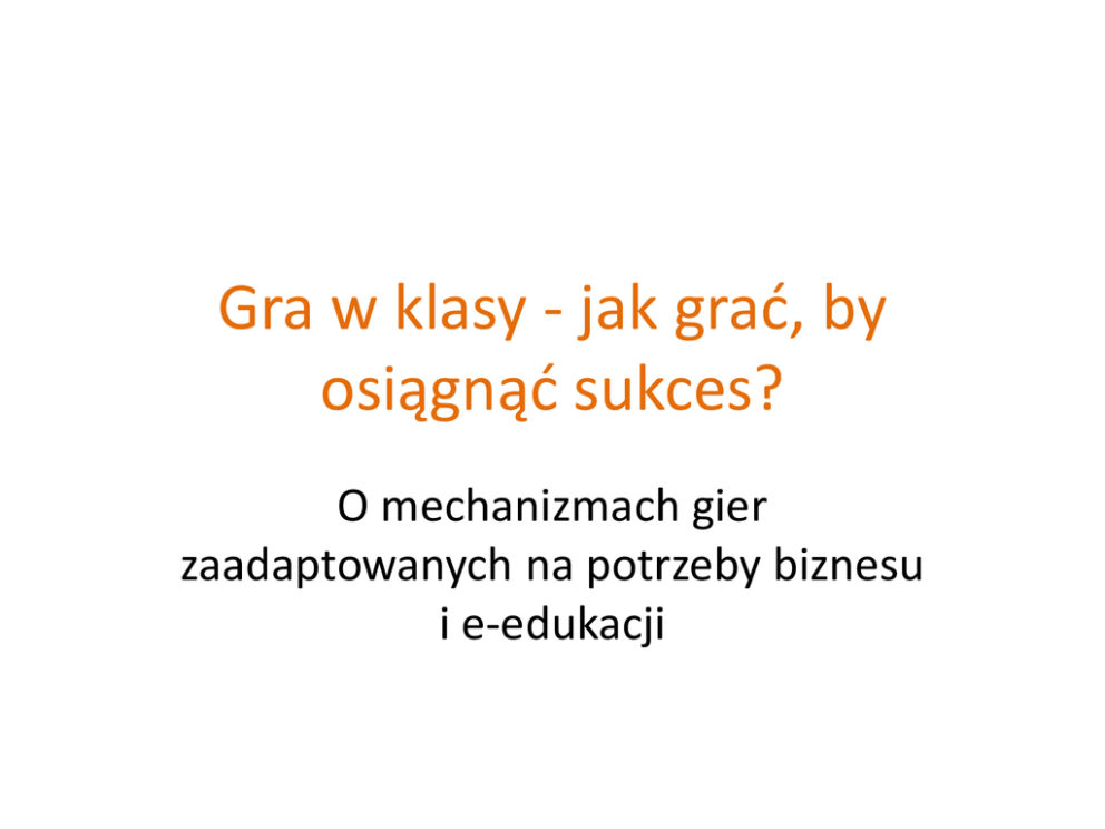Gra w klasy - jak grać, by osiągnąć sukces? O mechanizmach gier zaadaptowanych na potrzeby biznesu i e-edukacji Idea przewodnia „W klasy gra się małym kamyczkiem, który należy popychać czubkiem buta. Elementy gry: chodnik, kamyczek, but i piękny rysunek kredą, najchętniej kolorową. Na górze jest Niebo, na dole jest Ziemia, prawie zawsze źle się jakoś obliczy i kamyk wylatuje poza rysunek. Powoli jednak nabiera się zręczności koniecznej, by przechodzić z jednego kwadratu do drugiego, i któregoś dnia może się uda wyjść z Ziemi”. Julio Cortázar - Gra w klasy Agenda • Mechanizmy gier - wprowadzenie • Wykorzystanie grywalizacji w biznesie • Adaptacja gier na potrzeby e-edukacji MECHANIZMY GIER WPROWADZENIE Grywalizacja – czym jest? • Grywalizacja (ang. gamification) to używanie mechanizmów znanych z gier fabularnych i komputerowych do zmiany zachowań ludzi poza kontekstem gry, w celu zwiększenia ich zaangażowania. • Trend marketingu, który polega na przeistaczaniu nudnych konieczności w ekscytującą zabawę, np. przy okazji zakupów w formie programów lojalnościowych, przy tworzeniu tożsamości marki czy przy budowaniu zaangażowania klientów. • Ma swoje podstawy w psychologii behawioralnej, projektowaniu gier i w budowaniu programów lojalnościowych. Grywalizacja – emocje • Najważniejsza jest fabuła i frajda. Dlatego, że klienci w większości przypadków kierują się właśnie emocjami. • Zaangażowanie klientów na poziomie umysłowym w zabawę. Dobra grywalizacja angażuje w taki sposób, że chce się osiągnąć konkretny cel. Najpierw działanie, później nagroda. • Wykorzystanie potencjalnych motywacji klientów / wykreowanie ich potrzeb związanych z firmą. Grywalizacja – dlaczego to działa? • Wiek XXI - powszechny brak zaangażowania w cokolwiek. • Klif zaangażowania. • Gry oddziałują na nas na poziomie biologicznym, nagradzając nas za zaangażowanie. Grywalizacja jest odpowiedzią na brak zaangażowania, antidotum na to, co spotyka nas co dzień w pracy, na zakupach i w szkołach oraz na uczelniach wyższych. Grywalizacja – mechanizmy Mat. Szymon Paroszkiewicz Grywalizacja – typy graczy Mat. Szymon Paroszkiewicz WYKORZYSTANIE GRYWALIZACJI W BIZNESIE Grywalizacja w biznesie – przykłady – Programy lojalnościowe • koncentrują się na frajdzie, a nie na monotonnym zbieraniu punktów na kartę; • nagradzają nie tylko za zakupy, ale także za interakcje z marką czy używanie swojego społecznego wpływu (przyprowadzanie do marki innych ludzi); • przykład: American Express – stała się preferowaną przez wielu kartą, ponieważ jej użytkownicy mają dostęp do biletów na koncerty kilka dni wcześniej, niż pojawiają się one w oficjalnej sprzedaży. Grywalizacja w biznesie – przykłady – Kreowanie tożsamości marki i budowanie zaangażowania klientów • Aplikacja mobilna Starbucks Earlybird – połączenie budzika, geolokalizacji i zabawy ze znajomymi. • Nagradzanie za brak drzemki: jeśli w ciągu 45 minut odbierze się kawę w Starbucksie, otrzymuje się zniżkę. • Kara za drzemkę: automatyczny status na FB informujący o tym znajomych. Grywalizacja w biznesie – przykłady Gry rekrutacyjne – strategie fabularne: – Gra biznesowa „Reveal” w firmie L’Oreal: • Zachęca młodych ludzi, by w wirtualnym świecie wcielili się w postać pracownika firmy, który uczestniczy w kampanii wprowadzającej na rynek nowy produkt. • Trafiają do skróconego procesu rekrutacji w stażowym programie rozwoju talentów. – „Unilevergame” : • Uczestnicy rozwiązują w wirtualnym świecie różne biznesowe przypadki. • Dodatkowo w Unilever kandydaci na letnie praktyki w drugim etapie przechodzą animowaną grę analityczną online. ADAPTACJA GIER NA POTRZEBY E-EDUKACJI Gry w e-edukacji – pomysły • Zaszczepienie elementu frajdy w szkołach, również wyższych. • Odejście od liniowego podejścia – prawidłowa jest tylko jedna odpowiedź, wypracowana tylko w jeden właściwy sposób. • Zachęcenie do eksploracji tematu na własną rękę – podobnie jak to ma miejsce w grach: – Nagradzanie za to – punktami, ustawianiem coraz wyższej poprzeczki. – Gromadzone np. na moodle’u punkty przekładałyby się nie tylko na ocenę, ale również na… – przechodzenie na następny poziom wiedzy – zmianę kąta badania danej tematyki, możliwość realizacji zaliczeń w odmienny sposób, np. nie tylko poprzez testy, ale również poprzez pisanie esejów, rozwiązywanie case’ów i symulacji etc. Gry w e-edukacji – pomysły • Świat gry skonstruowany jest w taki sposób, by zachęcać do eksploracji, podejmowania kolejnych prób – te same założenia powinny panować w e-edukacji. • Celem gry jest osiągnięcie maestrii, nie chodzi o przejście jej od początku do końca, lecz o przyjemność z grania (mocno uzależniającą) – celem grywalizacji w e-learningu powinno być stworzenie mechanizmu nagradzającego za poszerzanie wiedzy. • Tradycyjna szkoła do eksploracji zniechęca – na teście prawidłowa odpowiedź jest tylko jedna, a eksploracja podręcznika w trakcie trwania testu jest nazywana ściąganiem. • Szkoła powinna nagradzać też za wysiłek, a nie tylko za efekty. • „Zasady gry” powinny być dostosowane do indywidualnych potrzeb i umiejętności ucznia-gracza (różne możliwości realizacji nauki). Gry w e-edukacji – przyszłość • Dążenie do zacierania granicy pomiędzy nauką a przyjemnością. – Element frajdy stanie się nieodłączną częścią procesu edukacyjnego. • Zmiana wymagań. – Dziś liczy się umiejętność pracy w zespole i kreatywne rozwiązywanie problemów. – Posiadanie wiedzy nie jest już wyzwaniem – Internet. Liczy się umiejętność odróżnienia informacji cennych od błędnych. • E-edukacja musi angażować młodych ludzi. Gry w e-edukacji – przykłady • Global Ma