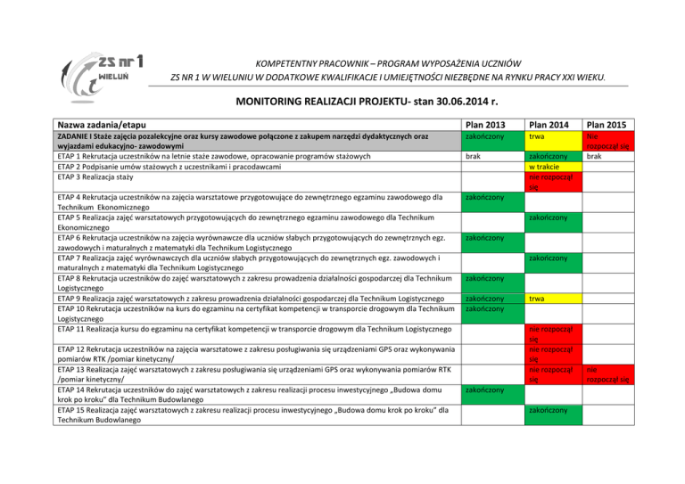 KOMPETENTNY PRACOWNIK – PROGRAM WYPOSAŻENIA UCZNIÓW ZS NR 1 W WIELUNIU W DODATKOWE KWALIFIKACJE I UMIEJĘTNOŚCI NIEZBĘDNE NA RYNKU PRACY XXI WIEKU. MONITORING REALIZACJI PROJEKTU- stan 30.06.2014 r. Nazwa zadania/etapu Plan 2013 Plan 2014 Plan 2015 ZADANIE I Staże zajęcia pozalekcyjne oraz kursy zawodowe połączone z zakupem narzędzi dydaktycznych oraz wyjazdami edukacyjno- zawodowymi ETAP 1 Rekrutacja uczestników na letnie staże zawodowe, opracowanie programów stażowych ETAP 2 Podpisanie umów stażowych z uczestnikami i pracodawcami ETAP 3 Realizacja staży zakończony trwa brak zakończony w trakcie nie rozpoczął się Nie rozpoczął się brak ETAP 4 Rekrutacja uczestników na zajęcia warsztatowe przygotowujące do zewnętrznego egzaminu zawodowego dla Technikum Ekonomicznego ETAP 5 Realizacja zajęć warsztatowych przygotowujących do zewnętrznego egzaminu zawodowego dla Technikum Ekonomicznego ETAP 6 Rekrutacja uczestników na zajęcia wyrównawcze dla uczniów słabych przygotowujących do zewnętrznych egz. zawodowych i maturalnych z matematyki dla Technikum Logistycznego ETAP 7 Realizacja zajęć wyrównawczych dla uczniów słabych przygotowujących do zewnętrznych egz. zawodowych i maturalnych z matematyki dla Technikum Logistycznego ETAP 8 Rekrutacja uczestników do zajęć warsztatowych z zakresu prowadzenia działalności gospodarczej dla Technikum Logistycznego ETAP 9 Realizacja zajęć warsztatowych z zakresu prowadzenia działalności gospodarczej dla Technikum Logistycznego ETAP 10 Rekrutacja uczestników na kurs do egzaminu na certyfikat kompetencji w transporcie drogowym dla Technikum Logistycznego ETAP 11 Realizacja kursu do egzaminu na certyfikat kompetencji w transporcie drogowym dla Technikum Logistycznego zakończony ETAP 12 Rekrutacja uczestników na zajęcia warsztatowe z zakresu posługiwania się urządzeniami GPS oraz wykonywania pomiarów RTK /pomiar kinetyczny/ ETAP 13 Realizacja zajęć warsztatowych z zakresu posługiwania się urządzeniami GPS oraz wykonywania pomiarów RTK /pomiar kinetyczny/ ETAP 14 Rekrutacja uczestników do zajęć warsztatowych z zakresu realizacji procesu inwestycyjnego „Budowa domu krok po kroku” dla Technikum Budowlanego ETAP 15 Realizacja zajęć warsztatowych z zakresu realizacji procesu inwestycyjnego „Budowa domu krok po kroku” dla Technikum Budowlanego zakończony zakończony zakończony zakończony zakończony zakończony trwa nie rozpoczął się nie rozpoczął się nie rozpoczął się zakończony zakończony nie rozpoczął się ETAP 16 Rekrutacja na kurs rysunku odręcznego dla uczniów zdolnych przygotowujący do egzaminu na studia dla Technikum Budownictwa i Technikum Architektury Krajobrazu ETAP 17 Realizacja kursu rysunku odręcznego dla uczniów zdolnych przygotowujący do egzaminu na studia dla Technikum Budownictwa i Technikum Architektury Krajobrazu ETAP 18 Rekrutacja na kurs tajniki sztuki kulinarnej dla kierunków gastronomicznych ETAP 19 Realizacja kursu tajniki sztuki kulinarnej dla kierunków gastronomicznych ETAP 20 Rekrutacja na kurs sztuka prezentacji, obsługa klienta dla kierunków gastronomicznych zakończony zakończony zakończony zakończony ETAP 21 Realizacja kursu sztuka prezentacji, obsługa klienta dla kierunków gastronomicznych w trakcie ETAP 22 Rekrutacja na kurs barmana II stopnia dla kierunków gastronomicznych ETAP 23 Realizacja kursu barmana II stopnia dla kierunków gastronomicznych zakończony ETAP 24 Rekrutacja na zajęcia wyrównawcze z chemii dla uczniów kierunków gastronomicznych ETAP 25 Realizacja zajęć wyrównawczych z chemii dla uczniów kierunków gastronomicznych zakończony ETAP 26 Rekrutacja na kurs operatora wózka widłowego z wymianą butli gazowej dla Technikum Budownictwa oraz Technikum Logistycznego ETAP 27 Realizacja kursu operatora wózka widłowego z wymianą butli gazowej dla Technikum Budownictwa oraz Technikum Logistycznego ETAP 28 Rekrutacja na kurs prawa jazdy kategorii „B” dla Technikum Architektury Krajobrazu ETAP 29 Realizacja kursu prawa jazdy kategorii „B” dla Technikum Architektury Krajobrazu ETAP 30 Rekrutacja na kurs inżynieria projektowania komputerowego CAD 2D i 3D dla Technikum Architektury Krajobrazu i technikum Budownictwa ETAP 31 Realizacja kursu inżynieria projektowania komputerowego CAD 2D i 3D dla Technikum Architektury Krajobrazu i technikum Budownictwa ETAP 32 Rekrutacja na kurs personel obsługi naziemnej dla Technikum Logistycznego ETAP 33 Realizacja kursu personel obsługi naziemnej dla Technikum Logistycznego ETAP 34 Rekrutacja na kurs transport towarów niebezpiecznych dla Technikum Logistycznego ETAP 35 Realizacja kursu kurs transport towarów niebezpiecznych dla Technikum Logistycznego ETAP 36 Rekrutacja i przygotowanie wyjazdu na targi architektury ogrodów „Gardzenia” do Poznania dla uczniów TA ETAP 37 Realizacja wyjazdu na targi architektury ogrodów „Gardzenia” do Poznania dla uczniów TA ETAP 38 Rekrutacja i przygotowanie wyjazdu na targi budownictwa „Budma” Poznań TB ETAP 39 Realizacja wyjazdu na targi budownictwa „Budma” Poznań TB ETAP 40 Rekrutacja na wyjazd do centralnych instytucji społeczno- gospodarczych do Warszawy- Technikum Ekonomiczne zakończony w trakcie w trakcie w trakcie w trakcie w trakcie nie rozpoczął się nie rozpoczął się nie rozpoczął się nie rozpoczał się zakończony w trakcie zakończony w trakcie* w trakcie nie rozpoczął się w trakcie w trakcie w trakcie w trakcie zakończony zakończony zakończony zakończony Nazwa zadania/etapu Plan 2013 Plan 2014 Plan 2015 ETAP 41 Realizacja wyjazdu do centralnych instytucji społeczno- gospodarczych do Warszawy- Technikum Ekonomiczne ETAP 42 Rekrutacja na wyjazd na targi EuroGastro Warszawa dla uczniów kierunków gastronomicznych ETAP 43 Realizacja wyjazdu na targi EuroGastro Warszawa dla uczniów kierunków gastronomicznych ETAP 44 Rekrutacja wyjazd Kopalnia Bełchatów- Technikum Geodezyjne