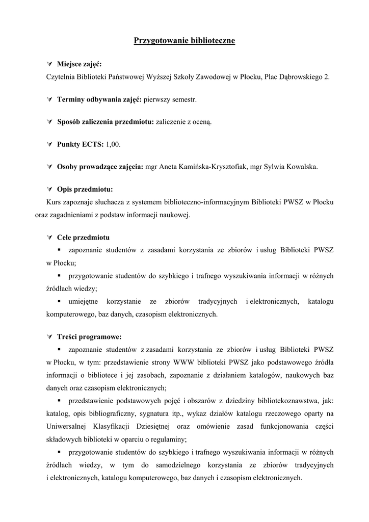 Przygotowanie biblioteczne Miejsce zajęć: Czytelnia Biblioteki Państwowej Wyższej Szkoły Zawodowej w Płocku, Plac Dąbrowskiego 2. Terminy odbywania zajęć: pierwszy semestr. Sposób zaliczenia przedmiotu: zaliczenie z oceną. Punkty ECTS: 1,00. Osoby prowadzące zajęcia: mgr Aneta Kamińska-Krysztofiak, mgr Sylwia Kowalska. Opis przedmiotu: Kurs zapoznaje słuchacza z systemem biblioteczno-informacyjnym Biblioteki PWSZ w Płocku oraz zagadnieniami z podstaw informacji naukowej. Cele przedmiotu zapoznanie studentów z zasadami korzystania ze zbiorów i usług Biblioteki PWSZ w Płocku; przygotowanie studentów do szybkiego i trafnego wyszukiwania informacji w różnych źródłach wiedzy; umiejętne korzystanie ze zbiorów tradycyjnych i elektronicznych, katalogu komputerowego, baz danych, czasopism elektronicznych. Treści programowe: zapoznanie studentów z zasadami korzystania ze zbiorów i usług Biblioteki PWSZ w Płocku, w tym: przedstawienie strony WWW biblioteki PWSZ jako podstawowego źródła informacji o bibliotece i jej zasobach, zapoznanie z działaniem katalogów, naukowych baz danych oraz czasopism elektronicznych; przedstawienie podstawowych pojęć i obszarów z dziedziny bibliotekoznawstwa, jak: katalog, opis bibliograficzny, sygnatura itp., wykaz działów katalogu rzeczowego oparty na Uniwersalnej Klasyfikacji Dziesiętnej oraz omówienie zasad funkcjonowania części składowych biblioteki w oparciu o regulaminy; przygotowanie studentów do szybkiego i trafnego wyszukiwania informacji w różnych źródłach wiedzy, w tym do samodzielnego korzystania ze zbiorów tradycyjnych i elektronicznych, katalogu komputerowego, baz danych i czasopism elektronicznych.