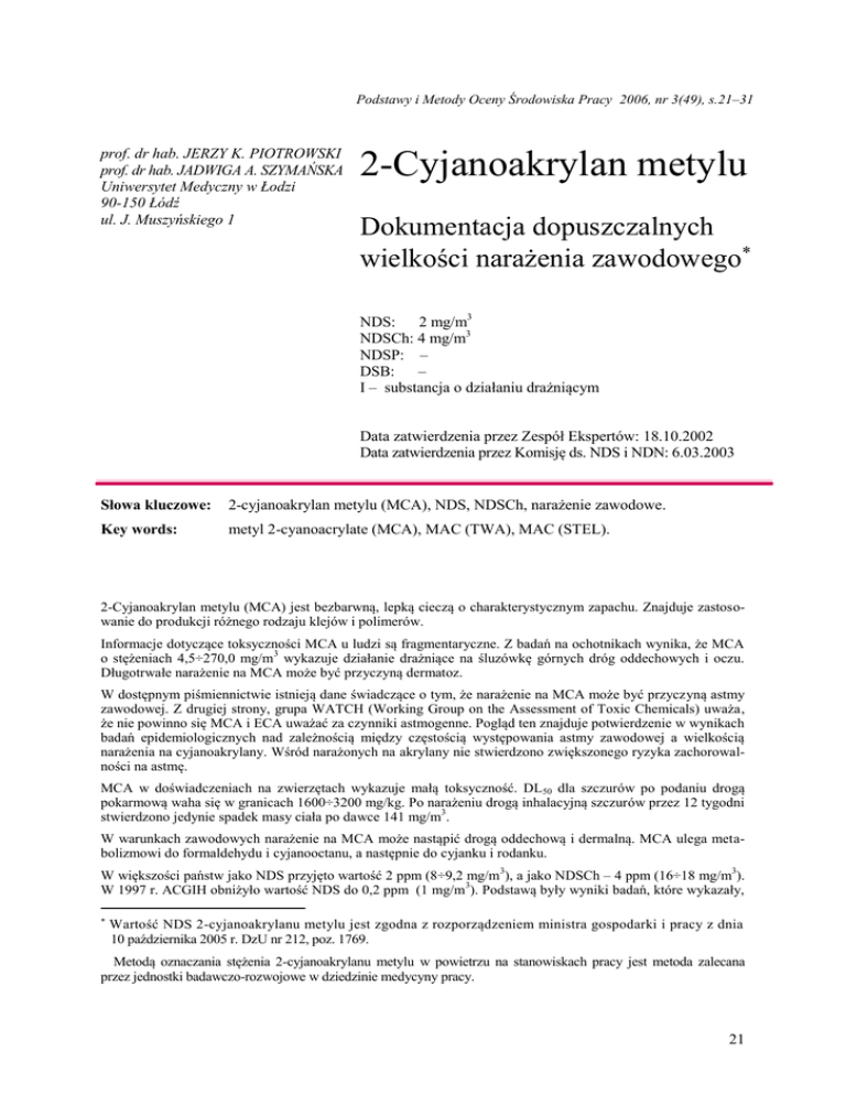 Podstawy i Metody Oceny Środowiska Pracy 2006, nr 3(49), s.21–31 prof. dr hab. JERZY K. PIOTROWSKI prof. dr hab. JADWIGA A. SZYMAŃSKA Uniwersytet Medyczny w Łodzi 90-150 Łódź ul. J. Muszyńskiego 1 2-Cyjanoakrylan metylu Dokumentacja dopuszczalnych wielkości narażenia zawodowego NDS: 2 mg/m3 NDSCh: 4 mg/m3 NDSP: – DSB: – I – substancja o działaniu drażniącym Data zatwierdzenia przez Zespół Ekspertów: 18.10.2002 Data zatwierdzenia przez Komisję ds. NDS i NDN: 6.03.2003 Słowa kluczowe: 2-cyjanoakrylan metylu (MCA), NDS, NDSCh, narażenie zawodowe. Key words: metyl 2-cyanoacrylate (MCA), MAC (TWA), MAC (STEL). 2-Cyjanoakrylan metylu (MCA) jest bezbarwną, lepką cieczą o charakterystycznym zapachu. Znajduje zastosowanie do produkcji różnego rodzaju klejów i polimerów. Informacje dotyczące toksyczności MCA u ludzi są fragmentaryczne. Z badań na ochotnikach wynika, że MCA o stężeniach 4,5÷270,0 mg/m3 wykazuje działanie drażniące na śluzówkę górnych dróg oddechowych i oczu. Długotrwałe narażenie na MCA może być przyczyną dermatoz. W dostępnym piśmiennictwie istnieją dane świadczące o tym, że narażenie na MCA może być przyczyną astmy zawodowej. Z drugiej strony, grupa WATCH (Working Group on the Assessment of Toxic Chemicals) uważa, że nie powinno się MCA i ECA uważać za czynniki astmogenne. Pogląd ten znajduje potwierdzenie w wynikach badań epidemiologicznych nad zależnością między częstością występowania astmy zawodowej a wielkością narażenia na cyjanoakrylany. Wśród narażonych na akrylany nie stwierdzono zwiększonego ryzyka zachorowalności na astmę. MCA w doświadczeniach na zwierzętach wykazuje małą toksyczność. DL50 dla szczurów po podaniu drogą pokarmową waha się w granicach 1600÷3200 mg/kg. Po narażeniu drogą inhalacyjną szczurów przez 12 tygodni stwierdzono jedynie spadek masy ciała po dawce 141 mg/m3. W warunkach zawodowych narażenie na MCA może nastąpić drogą oddechową i dermalną. MCA ulega metabolizmowi do formaldehydu i cyjanooctanu, a następnie do cyjanku i rodanku. W większości państw jako NDS przyjęto wartość 2 ppm (8÷9,2 mg/m3), a jako NDSCh – 4 ppm (16÷18 mg/m3). W 1997 r. ACGIH obniżyło wartość NDS do 0,2 ppm (1 mg/m 3). Podstawą były wyniki badań, które wykazały, Wartość NDS 2-cyjanoakrylanu metylu jest zgodna z rozporządzeniem ministra gospodarki i pracy z dnia 10 października 2005 r. DzU nr 212, poz. 1769. Metodą oznaczania stężenia 2-cyjanoakrylanu metylu w powietrzu na stanowiskach pracy jest metoda zalecana przez jednostki badawczo-rozwojowe w dziedzinie medycyny pracy. 21 że przy stężeniu 2 ppm u badanych ochotników widoczne było działanie drażniące MCA na błony śluzowe nosa i gardła. Opierając się na tych badaniach proponuje się przyjąć dla 2-cyjanoakrylanu metylu wartość NDS równą 2 mg/m3 i wartość NDSCh – 4 mg/m3. Proponuje się również oznakowanie normatywu symbolem „I”. Nie ma podstaw do ustalenia wartości DSB. CHARAKTERYSTYKA SUBSTANCJI, ZASTOSOWANIE, NARAŻENIE ZAWODOWE Ogólna charakterystyka substancji Ogólne informacje charakteryzujące 2-cyjanoakrylan metylu (ACGIH 2001, Goodman i in. 2000, HSDB 2001, Rozporządzenie... 2003): – wzór sumaryczny C5H5NO2 – wzór strukturalny COOCH3 H2C C CN – nazwa zwyczajowa 2-cyjanoakrylan metylu – nazwa chemiczna wg CAS 2-cyanoacrylic acid methyl ester (ester metylowy kwasu 2-cyjanoakrylowego) – numer w rejestrze CAS 137-05-3 – numer w rejestrze RTECS AS 7000000 – oznakowanie wg rozporządzenia (2003) Xi – substancja drażniąca; R36/37/38 – działa drażniąco na oczy, układ oddechowy i skórę – synonimy ester metylowy kwasu 2-cyjano-2-propenowego, ester metylowy kwasu 2-cyjanoakrylowego, ester metylowy kwasu alfacyjanoakrylowego, alfa-cyjanoakrylan metylu, cyjanoakrylan metylu, mekrylat, MCA – nazwy handlowe ADHERE, Borden Ad/Here, Cemedine 3000, COAPT, CYANOLIT, EASTMAN 910, Krazy-Glue, MECRILAT Właściwości fizykochemiczne 2-Cyjanoakrylan metylu charakteryzują następujące właściwości (ACGIH 2001, Goodman i in. 2000, HSDB 2001, Rozporządzenie... 2003): – wygląd bezbarwna, lepka ciecz o charakterystycznym zapachu – próg zapachu 4,53÷22,65 mg/m3 (1÷5 ppm), (Goodman i in. 2000, HSDB 2001) 4,53 ÷13,59 mg/m3 (1÷3 ppm), (ACGIH 2000) 9,97 mg/m3 (2,2 ppm), (CHEMINFO 2002) – masa cząsteczkowa 111,1 – temperatura wrzenia 48÷49 oC (ACGIH 2000, Goodman i in. 2000) 47÷49 oC (ciśn. 1,8 mmHg), (HSDB 2001) – temperatura topnienia 2,5 oC (ACGIH 2000) 22 – temperatura zapłonu – masa właściwa – prężność par – rozpuszczalność – współczynniki przeliczeniowe (temp. 25 oC) 79 oC (metoda tygla zamkniętego), (CHEMINFO 2002) 82,8 oC (metoda tygla zamkniętego), (ACGIH 2000) 1,10 (temp. 20 oC), (ACGIH 2000) 0,80 mmHg (temp. 25 oC), (HSDB 2001) 0,20 mmHg (0,0267 kPA), (temp. 25 oC), (CHEMINFO 2002) rozpuszcza się w ketonie metylo-etylowym, toluenie, acetonitrylu, acetonie, N,N-dimetyloformamidzie, chlorku metylenu i nitrometanie (ACGIH 2000, CHEMINFO 2002) 1 ppm = 4,53 mg/m3, 1 mg/m3 = 0,22 ppm (ACGIH 2000). Otrzymywanie, zastosowanie, produkcja, narażenie zawodowe Synteza 2-cyjanoakrylanu metylu (MCA) przebiega dwuetapowo. W pierwszym etapie następuje kondensacja formaldehydu z metylocyjanooctanem, a w drugim otrzymany poli(metylo)2-cyjanoakrylan jest poddawany pirolizie (HSDB 2001). MCA znajduje zastosowanie do produkcji różnego rodzaju klejów (superglues) i polimerów. Spotykane na rynku kleje zawierają najczęściej ok. 90% estru etylowego kwasu 2-cyjanoakrylowego. Zawartość MCA w klejach ciągle maleje. Kleje zawierające estry kwasu 2-cyjanoakrylowego służą do sklejania m.in. szkła, metali, mas plastycznych, gumy, a także tkanek (ACGIH 2000, HSDB 2001). W Polsce produkowany jest zawierający MCA klej do powierzchni szklanych i metalowych – cyjanopan B4. MCA stanowi również dodatek (ślado