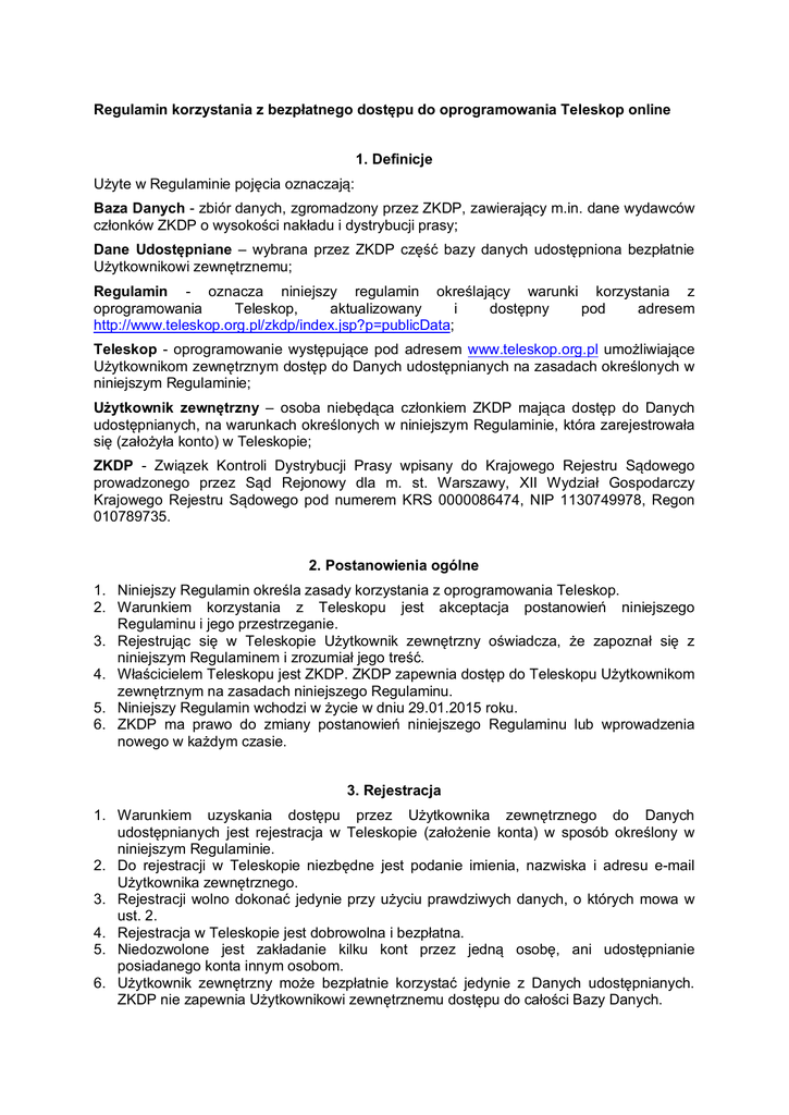Regulamin korzystania z bezp atnego dost pu do oprogramowania Teleskop online 1. Definicje yte w Regulaminie poj cia oznaczaj : Baza Danych - zbiór danych, zgromadzony przez ZKDP, zawieraj cy m.in. dane wydawców cz onków ZKDP o wysoko ci nak adu i dystrybucji prasy; Dane Udost pniane – wybrana przez ZKDP cz ytkownikowi zewn trznemu; bazy danych udost pniona bezp atnie Regulamin - oznacza niniejszy regulamin okre laj cy warunki korzystania z oprogramowania Teleskop, aktualizowany i dost pny pod adresem http://www.teleskop.org.pl/zkdp/index.jsp?p=publicData; Teleskop - oprogramowanie wyst puj ce pod adresem www.teleskop.org.pl umo liwiaj ce ytkownikom zewn trznym dost p do Danych udost pnianych na zasadach okre lonych w niniejszym Regulaminie; ytkownik zewn trzny – osoba nieb ca cz onkiem ZKDP maj ca dost p do Danych udost pnianych, na warunkach okre lonych w niniejszym Regulaminie, która zarejestrowa a si (za a konto) w Teleskopie; ZKDP - Zwi zek Kontroli Dystrybucji Prasy wpisany do Krajowego Rejestru S dowego prowadzonego przez S d Rejonowy dla m. st. Warszawy, XII Wydzia Gospodarczy Krajowego Rejestru S dowego pod numerem KRS 0000086474, NIP 1130749978, Regon 010789735. 2. Postanowienia ogólne 1. Niniejszy Regulamin okre la zasady korzystania z oprogramowania Teleskop. 2. Warunkiem korzystania z Teleskopu jest akceptacja postanowie niniejszego Regulaminu i jego przestrzeganie. 3. Rejestruj c si w Teleskopie U ytkownik zewn trzny o wiadcza, e zapozna si z niniejszym Regulaminem i zrozumia jego tre . 4. W cicielem Teleskopu jest ZKDP. ZKDP zapewnia dost p do Teleskopu U ytkownikom zewn trznym na zasadach niniejszego Regulaminu. 5. Niniejszy Regulamin wchodzi w ycie w dniu 29.01.2015 roku. 6. ZKDP ma prawo do zmiany postanowie niniejszego Regulaminu lub wprowadzenia nowego w ka dym czasie. 3. Rejestracja 1. Warunkiem uzyskania dost pu przez U ytkownika zewn trznego do Danych udost pnianych jest rejestracja w Teleskopie (za enie konta) w sposób okre lony w niniejszym Regulaminie. 2. Do rejestracji w Teleskopie niezb dne jest podanie imienia, nazwiska i adresu e-mail ytkownika zewn trznego. 3. Rejestracji wolno dokona jedynie przy u yciu prawdziwych danych, o których mowa w ust. 2. 4. Rejestracja w Teleskopie jest dobrowolna i bezp atna. 5. Niedozwolone jest zak adanie kilku kont przez jedn osob , ani udost pnianie posiadanego konta innym osobom. 6. U ytkownik zewn trzny mo e bezp atnie korzysta jedynie z Danych udost pnianych. ZKDP nie zapewnia U ytkownikowi zewn trznemu dost pu do ca ci Bazy Danych. 7. Niedozwolone jest stosowanie zautomatyzowanych narz dzi wysy aj cych dane do serwerów ZKDP lub pobieraj cych z nich dane. 4. Sposób korzystania z Danych udost pnionych 1. Baza danych i Dane udost pniane stanowi baz danych w rozumieniu przepisów prawa. 2. Baza Danych i Dane udost pniane chronione s przepisami: a. ustawy z dnia 27 lipca 2001 r. o ochronie baz danych (Dz.U. z 2001 r. Nr 128, poz. 1402); b. ustawy z dnia 4 lutego 1994 r. o prawie autorskim i prawach pokrewnych (Dz.U. z 2006 r. Nr 90 poz. 631). 3. U ytkownik zewn trzny korzysta z Danych udost pnianych jedynie za pomoc Teleskopu. 4. U ywanie Danych udost pnianych (w tym pobieranie danych i wtórne wykorzystanie Bazy Danych) w okresie 15 lat od ich udost pnienia lub upublicznienia, je eli nie udzielono dodatkowych zezwole , jest mo liwe jedynie do u ytku osobistego lub do celów dydaktycznych i badawczych (z podaniem ród a). 5. Naruszenie wy ej podanych ogranicze spowoduje odpowiedzialno karn przewidzian w ustawie o ochronie baz danych i ustawie o prawie autorskim i prawach pokrewnych. 6. Osoba naruszaj ca ograniczenia zobowi zana b dzie tak e do zwrotu uzyskanych korzy ci finansowych oraz naprawienia wyrz dzonej szkody na zasadach ogólnych. adne z postanowie niniejszego Regulaminu nie stanowi licencji na rozpowszechnianie Bazy danych lub Danych udost pnianych w jakiejkolwiek postaci. Baza Danych i Dane udost pniane stanowi wy czn w asno ZKDP. 7. U ytkownik zewn trzny zobowi zuje si powstrzyma od wszelkich dzia mog cych utrudni b destabilizowa funkcjonowanie Teleskopu. 5. Dane osobowe 1. Rejestracja w Teleskopie odbywa si przy u yciu danych osobowych U ytkownika zewn trznego. 2. Podawane przez U ytkownika zewn trznego dane osobowe s niezb dne do zapewnienia mu dost pu do oprogramowania Teleskop. 3. Administratorem danych osobowych, o których mowa w ust. 1, jest Zwi zek Kontroli Dystrybucji Prasy, wpisany do Krajowego Rejestru S dowego prowadzonego przez S d Rejonowy dla m. st. Warszawy, XII Wydzia Gospodarczy Krajowego Rejestru S dowego pod numerem KRS: 0000086474, NIP: 1130749978, Regon: 010789735 (ZKDP). 4. Dane osobowe s przetwarzane przez ZKDP w celu i zakresie, w jakim U ytkownik zewn trzny wyrazi na to zgod . ZKDP nie udost pnia danych osobowych stronom trzecim. 5. ZKDP zapewnia bezpiecze stwo danych osobowych U ytkowników zewn trznych, stosuj c niezb dne rodki ochrony ich danych osobowych, zgodne z wymogami ustawy z dnia 29 sierpnia 1997 r. o ochronie danych osobowych oraz aktów wykonawczych. Ponadto ZKDP zapewnia rodki techniczne zapobiegaj ce pozyskiwaniu i modyfikowaniu przez osoby nieuprawnione danych osobowych przesy anych drog elektroniczn . 6. U ytkownik zewn trzny ma prawo wgl du i modyfikacji danych osobowych za pomoc Teleskopu. 7. U ytkownik zewn trzny mo e za da usuni cia lub udzielenia mu informacji o tre ci i zakresie przetwarzania swoich danych osobowych w ka dym czasie. 8. Kontakt z administratorem danych osobowych (ZKDP) odbywa si poprzez adres poczty elektronicznej: [email protected]. 6. Odpowiedzialno ZKDP 1. ZKDP nie ponosi odpowiedzialno ci za brak mo liwo ci dost pu do Teleskopu wynikaj cy z przyczyn od niego niezale nych. 2. ZKDP nie ponosi odpowiedzialno ci za przerwy i zak ócenia dzia ania Teleskopu spowodowane dzia aniem si y wy szej b nieuprawnionym dzia aniem podmiotów trzecich. 3. ZKDP zastrzega sobie prawo do zaprzestania udost pniania Danych udost pnianych lub ograniczenia 