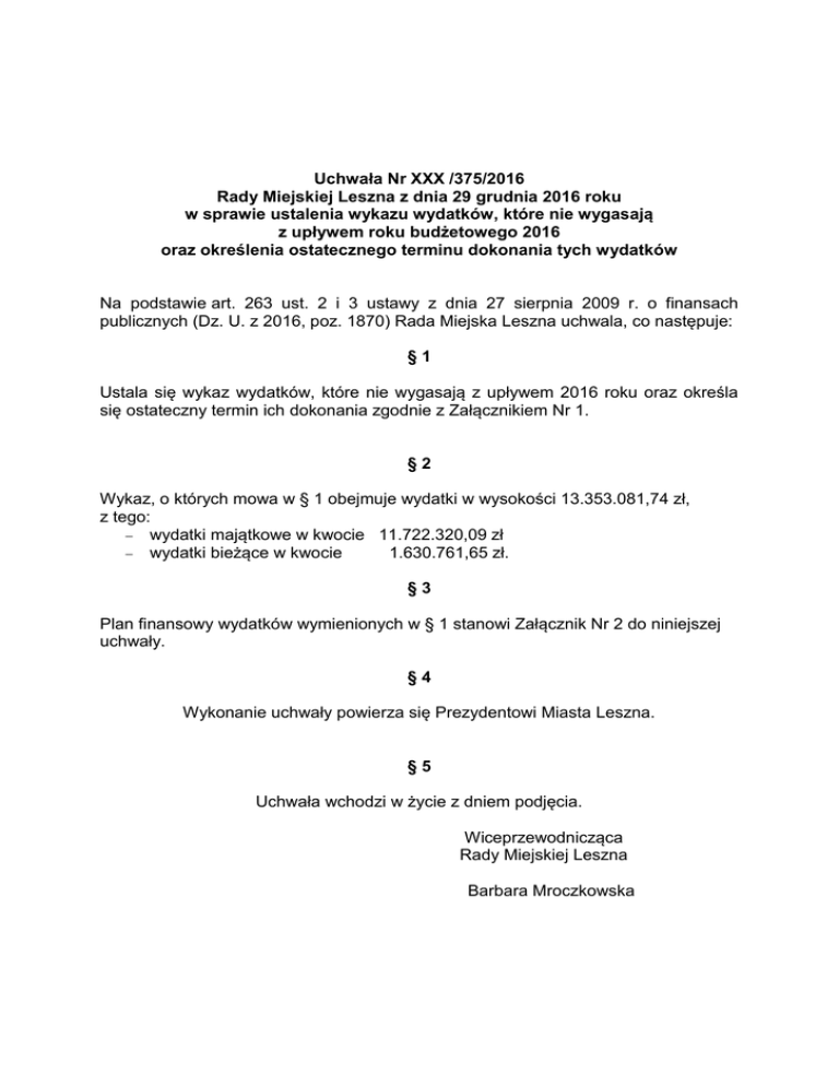 Uchwała Nr XXX /375/2016 Rady Miejskiej Leszna z dnia 29 grudnia 2016 roku w sprawie ustalenia wykazu wydatków, które nie wygasają z upływem roku budżetowego 2016 oraz określenia ostatecznego terminu dokonania tych wydatków Na podstawie art. 263 ust. 2 i 3 ustawy z dnia 27 sierpnia 2009 r. o finansach publicznych (Dz. U. z 2016, poz. 1870) Rada Miejska Leszna uchwala, co następuje: §1 Ustala się wykaz wydatków, które nie wygasają z upływem 2016 roku oraz określa się ostateczny termin ich dokonania zgodnie z Załącznikiem Nr 1. §2 Wykaz, o których mowa w § 1 obejmuje wydatki w wysokości 13.353.081,74 zł, z tego: wydatki majątkowe w kwocie 11.722.320,09 zł wydatki bieżące w kwocie 1.630.761,65 zł. §3 Plan finansowy wydatków wymienionych w § 1 stanowi Załącznik Nr 2 do niniejszej uchwały. §4 Wykonanie uchwały powierza się Prezydentowi Miasta Leszna. §5 Uchwała wchodzi w życie z dniem podjęcia. Wiceprzewodnicząca Rady Miejskiej Leszna Barbara Mroczkowska Uzasadnienie do uchwały Nr XXX /375/2016 Rady Miejskiej Leszna z dnia 29 grudnia 2016 roku w sprawie ustalenia wykazu wydatków, które nie wygasają z upływem roku budżetowego 2016 oraz określenia ostatecznego terminu dokonania tych wydatków Prezydent Miasta Leszna przedkłada Wysokiej Radzie projekt uchwały o wydatkach, które nie wygasają z upływem roku budżetowego 2016. Konieczność określenia takiego wykazu wynika z potrzeby wydatkowania kwot na zadania, które ujęte są w planie na rok 2016, a nie ma możliwości wydatkowania ich do dnia 31 grudnia 2016 r. Prezydent Miasta oszacował wysokość tych wydatków na kwotę 13.353.081,74 zł. Poniżej przedstawia się szczegółowe uzasadnienie dotyczące poszczególnych zadań, przy czym przyjmuje się, że ostateczny termin dokonania wydatków na wszystkich zadaniach określa się na dzień 30 czerwca 2017 r. I. Zadania miasta na kwotę 9.972.249,81 zł, w tym: 1. Wydatki bieżące w kwocie 1.166.691,54 zł, z tego: a) dz. 600 rozdz. 60016 – drogi publiczne gminne w kwocie 273.872,97 zł Kwota wynika z konieczności zabezpieczenia nw. środków finansowych na bieżące utrzymanie dróg gminnych: 1) kwota 9.335,70 zł za monitoring - monitorowanie i konserwacja 46 parkomatów na terenie miasta Leszna w Strefie Płatnego Parkowania w oparciu o umowę nr MZD-BS.272.2.2016 z dnia 04.01.2016 zawartą z Firmą Produkcyjno-Usługowo-Handlową "WATRA", 2) kwota 23.000,00 zł za wykonanie remontów cząstkowych nawierzchni bitumicznych dróg i ulic miasta Leszna w 2016 roku w oparciu o umowę nr Mad.272.02.2016 z dnia 15.01.2016 r. zawartą z Przedsiębiorstwem Dróg i Ulic Leszno Sp. z o.o. w Lesznie, 3) kwota 8.000,00 zł za dostawę i montaż części zamiennych do parkomatów w oparciu o umowę nr MZD-BS.277.1.2016 z dnia 04.01.2016 r., zawartą z firmą SIEMENS Sp. z o.o., 4) kwota 3.690,00 zł za pełnienie "Nadzoru nad bieżącym utrzymaniem dróg i ulic Miasta Leszna w 2016 r." w oparciu o umowę nr MZD.272.52.2015 z dnia 31.12.2015 r. zawartą z Firmą Projektowo-Usługową Krzysztof Marchwicki z siedzibą w Lesznie, 5) kwota 615,00 zł za autorski nadzór informatyczny nad programem "SOP" dla obsługi Biura Strefy Płatnego Parkowania w Lesznie w oparciu o umowę nr MZD-BS.272.3.2016 z dnia 04.01.2016 zawartą z firmą Usługi informatyczne Grzegorz Urbaniak z siedzibą w Poznaniu, 6) kwota 200,00 zł za wprowadzenie i obsługę rozliczenia rzeczywistego czasu postoju w SPP w oparciu o umowę nr MZD-BS.272.4.2016 z dnia 01.03.2016 zawartą z Mobile-Traffic-Date Sp. z o.o. z siedzibą w Poznaniu, 7) kwota 144,53 zł za dzierżawę urządzeń mobilnych w oparciu o umowę nr MZD-BS.272.5.2016 z dnia 09.03.2016 zawartą z Mobile-Traffic-Date Sp. z o.o. z siedzibą w Poznaniu, 8) kwota 250,- zł za wynagrodzenie za świadczenie usługi w oparciu o umowę nr MZD-BS.272.4.2015 z dnia 12.08.2015 zawartą z Pango Polska Spółka, 9) kwota 1.500,00 zł za usługi telekomunikacyjne w oparciu o umowy zbiorcze zarejestrowane pod nr 14770155 zawarte z POLKOMTEL Sp. z o.o. z siedzibą w Warszawie, 10) kwota 615,00 zł za usunięcie i sfrezowanie 1 pnia drzewa z gatunku lipa krymska rosnących przy ulicy Gabriela Narutowicza w oparciu o umowę nr MZD.6131.87-1.2015 zawartą z Miejskim Zakładem Zieleni w Lesznie, 11) kwota 100.000,00 zł za remonty i konserwacje ulic za wykonane w grudniu 2016 r. remonty i konserwacje dróg miejskich w oparciu o porozumienie z dnia 02.01.2002 r. Zawarte z Miejskim Zakładem Komunikacji w Lesznie, 12) kwota 25.000,00 zł za wykonywanie robót związanych z bieżącym utrzymaniem nawierzchni gruntowych dróg i ulic miasta Leszna w 2016 roku w oparciu o umowę nr MZD.272.03.2016 r. z dnia 03.02.2016 r. zawartą z Latan Marcin Latanowicz z siedzibą w Lesznie, 13) kwota 1.291,50 zł za najem wywrotki do 15 ton w oparciu o umowę nr MZD. 7229.Z.76.2016 z dnia 25.10.2016 r. zawartą z Miejskim Przedsiębiorstwem Energetyki Cieplnej Sp. z o.o. w Lesznie, 14) kwota 100.000,00 zł za zimowe utrzymanie w oparciu o umowę nr MZD.272.35.2014 z dnia 20.10.2014 r. zawartą z Przedsiębiorstwem Dróg i Ulic z siedzibą w Lesznie, 15) kwota 231,24 zł za autorski nadzór informatyczny nad programem SOP dla obsługi Biura Strefy Płatnego Parkowania w Lesznie zgodnie z umową MZD-BS.272.3.2016. za 2 licencje na dwa jednoczesne dostępy do programu mobilnego EXEX w oparciu o umowę nr MZD-BS.272.3.2016 z dnia 04.01.2016 r. i z aneksem z dnia 31.05.2016 r. zawartą z firmą Usługi informatyczne Grzegorz Urbaniak z siedzibą w Poznaniu. b) dz. 710 rozdz. 71004 – opracowania planistyczne w kwocie 275.847,14 zł Kwota wynika z konieczności na realizację nw. zadań: zabezpieczenia środków finansowych 1) miejscowy plan zagospodarowania przestrzennego w rejonie ul. Ewarysta Estkowskiego, Alei Konstytucji 3 Maja, Ludwika Zamenhofa oraz granic miasta w oparciu o umowę nr AP.271.01.2.2015 z dnia 20.08.2015 r. zawartą z INTEGRA Sp. z 