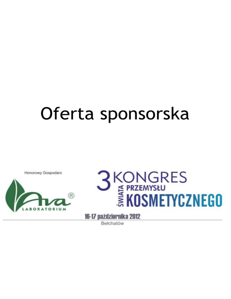 Oferta sponsorska Szanowni Państwo, Wydawnictwo Farmacom z redakcją kwartalnika „Świat Przemysłu Farmaceutycznego” oraz Honorowym Gospodarzem – Laboratorium Kosmetycznym AVA® mają zaszczyt zaproponować Państwu współpracę przy organizacji 3 KONGRESU ŚWIATA PRZEMYSŁU KOSMETYCZNEGO, który odbędzie się w dniach 16 – 17 października 2012 roku w Bełchatowie. Kolejny, trzeci już Kongres będzie kontynuacją poprzednich 2 edycji, których Honorowymi Gospodarzami byli: Laboratorium Kosmetyczne Dr Irena Eris i NIVEA Polska Sp. z o.o. Grupa Beiersdorf. W spotkaniu wezmą udział przedstawiciele producentów kosmetyków: prezesi, dyrektorzy ds. badań i rozwoju, specjaliści d/s utrzymania ruchu, technolodzy, automatycy, szefowie działów produkcji, kontroli i zapewnienia jakości, szefowie działów logistyki i zaopatrzenia w firmach zajmujących się produkcją kosmetyków. Uczestnikami Kongresu będą również przedstawiciele firm z otoczenia branży, które zaprezentują urządzenia, technologie i rozwiązania techniczne niezbędne do funkcjonowania nowoczesnego zakładu. 3 Kongres Świata Przemysłu Kosmetycznego zorganizowany zostanie w połączeniu z 4 Kongresem Świata Przemysłu Farmaceutycznego, którego Honorowym Gospodarzem będzie Medana Pharma S.A. Połączenie to stworzy dodatkową okazję na spotkanie się z przedstawicielami branży farmaceutycznej. Wysoki poziom merytoryczny Kongresu zapewnią eksperci z uczelni wyższych i organizacji związanych z przemysłem kosmetycznym. Zakres tematyczny programu Kongresu obejmuje wszystkie główne etapy produkcji kosmetycznej, od zaopatrzenia w surowce po magazynowanie gotowych wyrobów i ich spedycję. Serdecznie zapraszamy do współpracy. Z przyjemnością spotkamy się z Państwem i odpowiemy na Państwa pytania. Z wyrazami szacunku Robert Miller Redaktor Naczelny Wydawnictwa Farmacom Oferta dla SPONSORA : Status SPONSORA „Kongresu Świata Przemysłu Kosmetycznego” Pełny udział przedstawicieli SPONSORA – 3 osoby Stoisko o powierzchni 8 m2 w najatrakcyjniejszym miejscu 30 minutowy wykład SPONSORA, zgodny z tematyką bloku tematycznego 5. Wpis SPONSORA (2 strony) w Katalogu Kongresowym, wręczanym każdemu uczestnikowi konferencji 6. Reklama SPONSORA (2 strony) w Katalogu Kongresowym, wręczanym każdemu uczestnikowi konferencji 7. Skierowanie imiennych zaproszeń do wytypowanych przez SPONSORA specjalistów z firm i zakładów farmaceutycznych 8. Zamieszczenie logo SPONSORA na Certyfikatach 9. Eksponowanie logo SPONSORA na wszystkich materiałach promocyjnych: (pismach, zaproszeniach, tablicach informacyjnych, plakatach i transparentach) oraz eksponowanie logo SPONSORA podczas trwania Kongresu 10.Zamieszczenie logo SPONSORA na stronie internetowej Kongresu wraz z przekierowaniem na Jego stronę internetową 11.Możliwość dołączenia materiałów promocyjnych SPONSORA do materiałów kongresowych 12.Sponsorski pokaz slajdów w przerwach pomiędzy sesjami tematycznymi w sali konferencyjnej 13.Logo SPONSORA w pokazie slajdów w sali ze stoiskami 14.Logo SPONSORA z informacją o sponsoringu na okładce Katalogu Kongresowego 15.Baner (548 x 100 piks.) na stronie internetowej Kongresu 1. 2. 3. 4. Status SPONSORA to koszt 25.000 zł netto Oferta dla SPONSORA Wieczornej Gali: Status SPONSORA GALI „Kongresu Świata Przemysłu Kosmetycznego” Pełny udział przedstawicieli SPONSORA GALI – 3 osoby Stoisko o powierzchni 6 m2 w najatrakcyjniejszym miejscu 15 minutowe wystąpienie SPONSORA GALI podczas wykładów i 15 minutowe wystąpienie podczas Wieczornej Gali 5. Wpis SPONSORA GALI (2 strony) w Katalogu Kongresowym, wręczanym każdemu uczestnikowi Kongresu 6. Reklama SPONSORA GALI (2 strony) w Katalogu Kongresowym, wręczanym każdemu uczestnikowi Kongresu 7. Skierowanie imiennych zaproszeń do wytypowanych przez SPONSORA GALI specjalistów z firm i zakładów farmaceutycznych 8. Zamieszczenie logo SPONSORA GALI na Certyfikatach 9. Eksponowanie logo SPONSORA GALI na wszystkich materiałach promocyjnych: (pismach, zaproszeniach, tablicach informacyjnych, plakatach i transparentach) oraz wyłączne eksponowanie logo SPONSORA GALI podczas trwania Gali 10.Zamieszczenie logo SPONSORA GALI na stronie internetowej Kongresu wraz z przekierowaniem na Jego stronę internetową 11.Możliwość dołączenia materiałów promocyjnych SPONSORA GALI do materiałów kongresowych 12.Informacja o Kongresie wraz z informacją o sponsoringu rozesłana do mediów (lokalna prasa, internet) 13.Sponsorski pokaz slajdów w przerwach pomiędzy sesjami tematycznymi w sali konferencyjnej 14.Logo SPONSORA GALI w pokazie slajdów w sali ze stoiskami 15.Logo SPONSORA GALI z informacją o sponsoringu na okładce Katalogu Kongresowego 16.Baner (548 x 100 piks.) na stronie internetowej Kongresu 1. 2. 3. 4. Status SPONSORA Wieczornej Gali to koszt 20.000 zł netto PROGRAM RAMOWY* 15 października 2012 r. - poniedziałek Wycieczka techniczna zwiedzanie wybranych wydziałów produkcyjnych Colep Polska Sp. z o.o. i Medana Pharma S.A. Przygotowanie przez wystawców stoisk wystawowych 16 października 2012 r. - wtorek Od 7.00 Rejestracja uczestników Kongresu 9.00 – 9.15 Uroczyste otwarcie Kongresu 9.15 – 9.45 Prezentacja Honorowego Gospodarza – Laboratorium Kosmetyczne AVA® 9.45 – 10.00 Prezentacja Partnera Kongresu – Colep Polska Sp. z o.o. 10.00 – 11.45 I Blok Tematyczny – Nowe wyzwania prawne dla przemysłu kosmetycznego 11.45 – 12.15 Przerwa kawowa – rozmowy biznesowe przy stoiskach 12.15 – 14. 00 II Blok Tematyczny – Surowce w przemyśle kosmetycznym 14.00 – 15.00 Obiad 15.00 – 16.45 III Blok Tematyczny – Procesy technologiczne i produkcja 16.45 – 17.15 Przerwa kawowa – rozmowy biznesowe przy stoiskach 17.15 – 19.00 IV Blok Tematyczny – Międzyoperacyjna kontrola jakości 19.30 – 24.00 Uroczysta Gala Świata Przemysłu Kosmetycznego 17 października 2012 r. - środa 7.00 – 9.00 Śniadanie 10.00 