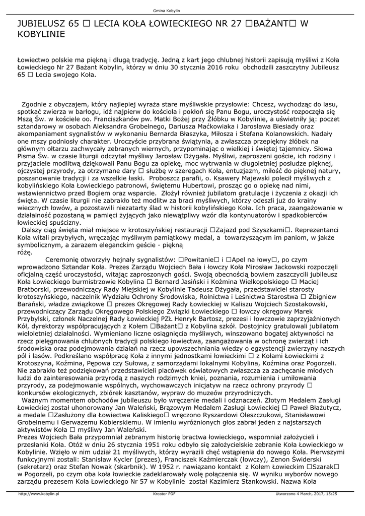 Gmina Kobylin JUBIELUSZ 65 LECIA KOŁA ŁOWIECKIEGO NR 27 BAŻANT W KOBYLINIE Łowiectwo polskie ma piękną i długą tradycję. Jedną z kart jego chlubnej historii zapisują myśliwi z Koła Łowieckiego Nr 27 Bażant Kobylin, którzy w dniu 30 stycznia 2016 roku obchodzili zaszczytny Jubileusz 65 Lecia swojego Koła. Zgodnie z obyczajem, który najlepiej wyraża stare myśliwskie przysłowie: Chcesz, wychodząc do lasu, spotkać zwierza w barłogu, idź najpierw do kościoła i pokłoń się Panu Bogu, uroczystość rozpoczęła się Mszą Św. w kościele oo. Franciszkanów pw. Matki Bożej przy Żłóbku w Kobylinie, a uświetniły ją: poczet sztandarowy w osobach Aleksandra Grobelnego, Dariusza Maćkowiaka i Jarosława Biesiady oraz akompaniament sygnalistów w wykonaniu Bernarda Błaszyka, Miłosza i Stefana Kolanowskich. Nadały one mszy podniosły charakter. Uroczyście przybrana świątynia, a zwłaszcza przepiękny żłóbek na głównym ołtarzu zachwycały zebranych wiernych, przypominając o wielkiej i świętej tajemnicy. Słowa Pisma Św. w czasie liturgii odczytał myśliwy Jarosław Dżygała. Myśliwi, zaproszeni goście, ich rodziny i przyjaciele modlitwą dziękowali Panu Bogu za opiekę, moc wytrwania w długoletniej posłudze pięknej, ojczystej przyrody, za otrzymane dary służbę w szeregach Koła, entuzjazm, miłość do pięknej natury, poszanowanie tradycji i za wszelkie łaski. Proboszcz parafii, o. Ksawery Majewski polecił myśliwych z kobylińskiego Koła Łowieckiego patronowi, świętemu Hubertowi, prosząc go o opiekę nad nimi, wstawiennictwo przed Bogiem oraz wsparcie. Złożył również jubilatom gratulacje i życzenia z okazji ich święta. W czasie liturgii nie zabrakło też modlitw za braci myśliwych, którzy odeszli już do krainy wiecznych łowów, a pozostawili niezatarty ślad w historii kobylińskiego Koła. Ich praca, zaangażowanie w działalność pozostaną w pamięci żyjących jako niewątpliwy wzór dla kontynuatorów i spadkobierców łowieckiej spuścizny. Dalszy ciąg święta miał miejsce w krotoszyńskiej restauracji Zajazd pod Szyszkami. Reprezentanci Koła witali przybyłych, wręczając myśliwym pamiątkowy medal, a towarzyszącym im paniom, w jakże symbolicznym, a zarazem eleganckim geście - piękną różę. Ceremonię otworzyły hejnały sygnalistów: Powitanie i Apel na łowy, po czym wprowadzono Sztandar Koła. Prezes Zarządu Wojciech Bała i łowczy Koła Mirosław Jackowski rozpoczęli oficjalną część uroczystości, witając zaproszonych gości. Swoją obecnością bowiem zaszczycili jubileusz Koła Łowieckiego burmistrzowie Kobylina Bernard Jasiński i Koźmina Wielkopolskiego Maciej Bratborski, przewodniczący Rady Miejskiej w Kobylinie Tadeusz Dżygała, przedstawiciel starosty krotoszyńskiego, naczelnik Wydziału Ochrony Środowiska, Rolnictwa i Leśnictwa Starostwa Zbigniew Barański, władze związkowe prezes Okręgowej Rady Łowieckiej w Kaliszu Wojciech Szostakowski, przewodniczący Zarządu Okręgowego Polskiego Związki Łowieckiego łowczy okręgowy Marek Przybylski, członek Naczelnej Rady Łowieckiej PZŁ Henryk Bartosz, prezesi i łowczowie zaprzyjaźnionych Kół, dyrektorzy współpracujących z Kołem Bażant z Kobylina szkół. Dostojnicy gratulowali jubilatom wieloletniej działalności. Wymieniano liczne osiągnięcia myśliwych, winszowano bogatej aktywności na rzecz pielęgnowania chlubnych tradycji polskiego łowiectwa, zaangażowania w ochronę zwierząt i ich środowiska oraz podejmowania działań na rzecz upowszechniania wiedzy o egzystencji zwierzyny naszych pól i lasów. Podkreślano współpracę Koła z innymi jednostkami łowieckimi z Kołami Łowieckimi z Krotoszyna, Koźmina, Pępowa czy Sułowa, z samorządami lokalnymi Kobylina, Koźmina oraz Pogorzeli. Nie zabrakło też podziękowań przedstawicieli placówek oświatowych zwłaszcza za zachęcanie młodych ludzi do zainteresowania przyrodą z naszych rodzimych kniei, poznania, rozumienia i umiłowania przyrody, za podejmowanie wspólnych, wychowawczych inicjatyw na rzecz ochrony przyrody konkursów ekologicznych, zbiórek kasztanów, wypraw do muzeów przyrodniczych. Ważnym momentem obchodów jubileuszu było wręczenie medali i odznaczeń. Złotym Medalem Zasługi Łowieckiej został uhonorowany Jan Waleński, Brązowym Medalem Zasługi Łowieckiej Paweł Błażutycz, a medale Zasłużony dla Łowiectwa Kaliskiego wręczono Ryszardowi Oleszczukowi, Stanisławowi Grobelnemu i Gerwazemu Kobierskiemu. W imieniu wyróżnionych głos zabrał jeden z najstarszych aktywistów Koła myśliwy Jan Waleński. Prezes Wojciech Bała przypomniał zebranym historię bractwa łowieckiego, wspomniał założycieli i przesłanki Koła. Otóż w dniu 26 stycznia 1951 roku odbyło się założycielskie zebranie Koła Łowieckiego w Kobylinie. Wzięło w nim udział 21 myśliwych, którzy wyrazili chęć wstąpienia do nowego Koła. Pierwszymi funkcyjnymi zostali: Stanisław Kycler (prezes), Franciszek Kaźmierczak (łowczy), Zenon Świderski (sekretarz) oraz Stefan Nowak (skarbnik). W 1952 r. nawiązano kontakt z Kołem Łowieckim Szarak w Pogorzeli, po czym oba koła łowieckie zadeklarowały wolę połączenia się. W wyniku wyborów nowego zarządu prezesem Koła Łowieckiego Nr 57 w Kobylinie został Kazimierz Stankowski. Nazwa Koła http://www.kobylin.pl Kreator PDF Utworzono 4 March, 2017, 15:25 Gmina Kobylin przetrwała do 1976 r. i wtedy to uległa zmianie na Koło Łowieckie nr 27 Bażant w Kobylinie. Od tego momentu obszar łowisk Koła obejmuje tereny gminy Krotoszyn, Koźmin, Kobylin i Pogorzela dwa obwody łowieckie, obecnie o ogólnej powierzchni 7940 ha, w tym 221 ha lasu. Od pierwszych dni powstania Koła kobylińskim myśliwym przyświecała zasada Temu bór darzy, kto dobrze gospodarzy. Dbałość o zwierzynę, jej stan i kondycję była i jest nakazem na każdy dzień dla każdego myśliwego, dla których dobre za
