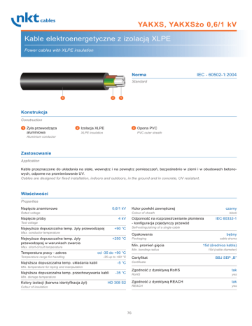 YAKXS, YAKXSżo 0,6/1 kV Kable elektroenergetyczne z izolacją XLPE Power cables with XLPE insulation Norma IEC - 60502-1:2004 Standard 3 2 1 Konstrukcja Construction 1 Żyła przewodząca aluminiowa 2 Izolacja XLPE 3 XLPE insulation Opona PVC PVC outer sheath Aluminium conductor Zastosowanie Application Kable przeznaczone do układania na stałe, wewnątrz i na zewnątrz pomieszczeń, bezpośrednio w ziemi i w obudowach betonowych, odporne na promieniowanie UV. Cables are designed for fixed installation, indoors and outdoors, in the ground and in concrete, UV resistant. Właściwości Properties Napięcie znamionowe 0,6/1 kV Kolor powłoki zewnętrznej Rated voltage Napięcie próby 4 kV Najwyższa dopuszczalna temp. żyły przewodzącej Max. conductor temperature Opakowania +250 °C Packaging Min. promień gięcia Max. short-circuit temperature Temperature range for handling Min. bending radius od -35 do +90 °C -35 up to +90 °C Najniższa dopuszczalna temp. układania kabli Certyfikat Min. temperature for laying and manipulation -35 °C Min. storage temperature Kolory izolacji (barwna identyfikacja żył) bębny cable drums 15d (średnica kabla) 15d (cable diameter) BBJ SEP „B” Certificate -5 °C Najniższa dopuszczalna temp. przechowywania kabli IEC 60332-1 Self-extinguishing of a single cable +90 °C Najwyższa dopuszczalna temp. żyły przewodzącej w warunkach zwarcia black Odporność na rozprzestrzenianie płomienia - konfiguracja pojedynczy przewód Test voltage Temperatura pracy - zakres czarny Colour of sheath HD 308 S2 Colour of insulation 76 Zgodność z dyrektywą RoHS tak RoHS yes Zgodność z dyrektywą REACH tak REACH yes YAKXS, YAKXSżo 0,6/1 kV Dane techniczne Technical data Liczba i przekrój znamionowy żył No. of cores and cross-section Kształt / konstrukcja żyły przewodzącej Shape of conductor mm² Grubość znamionowa izolacji Nominal insulation thickness Grubość znamionowa opony Nominal sheath thickness Średnica zewnętrzna kabla wartość obliczeniowa Outer diameter approx. Orientacyjna masa kabla o długości 1km Cable mass approx. mm mm mm kg/km 1x25 RE 0,9 1,4 11 154 1x35 RE 0,9 1,4 12 190 1x50 RMC 1,0 1,4 14 244 1x70 RMC 1,1 1,4 16 324 1x95 RMC 1,1 1,5 17 419 1x120 RMC 1,2 1,5 19 506 1x150 RMC 1,4 1,6 21 628 1x185 RMC 1,6 1,7 24 778 1x240 RMC 1,7 1,8 26 983 1x300 RMC 1,8 1,9 29 1200 1x400 RMC 2,0 2,0 32 1512 1x500 RMC 2,2 2,1 36 1898 1x630 RMC 2,4 2,3 41 2412 4x10 RE 0,7 1,8 17 382 4x16 RE 0,7 1,8 20 517 4x16 RMC 0,7 1,8 20 533 4x25 RE 0,9 1,8 24 707 4x25 RMC 0,9 1,8 24 793 4x25 SE 0,9 1,8 20 536 4x35 RE 0,9 1,8 26 879 4x35 SE 0,9 1,8 22 666 4x35 SM 0,9 1,8 24 716 4x50 SE 1,0 1,8 25 856 4x50 SM 1,0 1,8 27 916 4x70 SE 1,1 1,9 29 1161 77 YAKXS, YAKXSżo 0,6/1 kV Dane techniczne Technical data Liczba i przekrój znamionowy żył No. of cores and cross-section Kształt / konstrukcja żyły przewodzącej Shape of conductor mm² Grubość znamionowa izolacji Nominal insulation thickness Grubość znamionowa opony Nominal sheath thickness Średnica zewnętrzna kabla wartość obliczeniowa Outer diameter approx. Orientacyjna masa kabla o długości 1km Cable mass approx. mm mm mm kg/km 4x70 SM 1,1 1,9 31 1233 4x95 SE 1,1 2,0 32 1523 4x95 SM 1,1 2,1 35 1625 4x120 SE 1,2 2,1 36 1882 4x120 SM 1,2 2,2 38 1993 4x150 SE 1,4 2,2 40 2287 4x150 SM 1,4 2,3 43 2447 4x185 SE 1,6 2,4 45 2862 4x185 SM 1,6 2,5 48 3034 4x240 SE 1,7 2,6 50 3626 4x240 SM 1,7 2,7 54 3872 5x10 RE 0,7 1,8 19 446 5x16 RE 0,7 1,8 22 609 5x16 RMC 0,7 1,8 22 627 5x25 RE 0,9 1,8 26 893 5x35 RE 0,9 1,9 29 1126 5x50 SM 1,0 1,9 30 1184 5x70 SM 1,1 2,1 36 1627 5x95 SM 1,1 2,2 39 2066 5x120 SM 1,2 2,4 44 2578 78 YAKXS, YAKXSżo 0,6/1 kV Parametry elektryczne Electrical parameters Liczba i przekrój znamionowy żył No. of cores and cross-section Max. rezystancja żył w temp. 20 °C Effective resistance of conductor Stała czasowa nagrzewania żyły Time heating constant Indukcyjność Inductivity Prąd zwarciowy 1-sekundowy Short circuit current-equiv. Obciążalność prądowa kabla ułożonego w powietrzu Current carrying cap. in air Obciążalność prądowa kabla ułożonego w ziemi Current carrying cap. in ground Dopuszczalna siła ciągnięcia podczas instalacji Max. permitted pulling force during installation mm² Ω/km s mH/km kA A A N 1x25 1,20 131 0,309 2,364 138 187 750 1x35 0,868 170 0,295 3,309 169 225 1050 1x50 0,641 227 0,281 4,728 209 270 1500 1x70 0,443 277 0,271 6,619 265 334 2100 1x95 0,320 338 0,264 8,983 326 400 2850 1x120 0,253 399 0,260 11,346 379 456 3600 1x150 0,206 471 0,259 14,183 436 511 4500 1x185 0,164 529 0,257 17,492 507 580 5550 1x240 0,125 626 0,253 22,693 605 674 7200 1x300 0,100 728 0,250 28,366 701 767 9000 1x400 0,0778 933 0,246 37,821 826 877 12000 1x500 0,0605 1061 0,243 47,276 968 1007 15000 1x630 0,0469 1184 0,239 59,568 1155 1172 18900 4x10 3,08 112 0,279 0,946 60 74 1200 4x16 1,91 157 0,265 1,513 81 96 1920 4x16 1,91 153 0,263 1,513 81 97 1920 4x25 1,20 208 0,267 2,364 109 126 3000 4x25 1,20 205 0,265 2,364 110 126 3000 4x25 1,20 228 0,242 2,364 104 123 3000 4x35 0,868 271 0,259 3,309 134 150 4200 4x35 0,868 299 0,234 3,309 128 147 4200 4x35 0,868 286 0,231 3,309 131 149 4200 4x50 0,641 409 0,226 4,728 156 175 6000 4x50 0,641 389 0,228 4,728 160 177 6000 4x70 0,443 498 0,227 6,619 198 215 8400 79 YAKXS, YAKXSżo 0,6/1 kV Parametry elektryczne Electrical parameters Liczba i przekrój znamionowy żył No. of cores and cross-section Max. rezystancja żył w temp. 20 °C Effective resistance of conductor Stała czasowa nagrzewania żyły Time heating constant Indukcyjność Inductivity Prąd zwarciowy 1-sekundowy Short circuit current-equiv. Obciążalność prądowa kabla ułożonego w powietrzu Current carrying cap. in air Obciążalność prądowa kabla ułożonego w ziemi Current carrying cap. in ground Dopuszczalna siła ciągnięcia podczas instalacji Max. permitted pulling force during installation mm² Ω/km s mH/km kA A A N 4x70 0,443 476 0,224 6,619