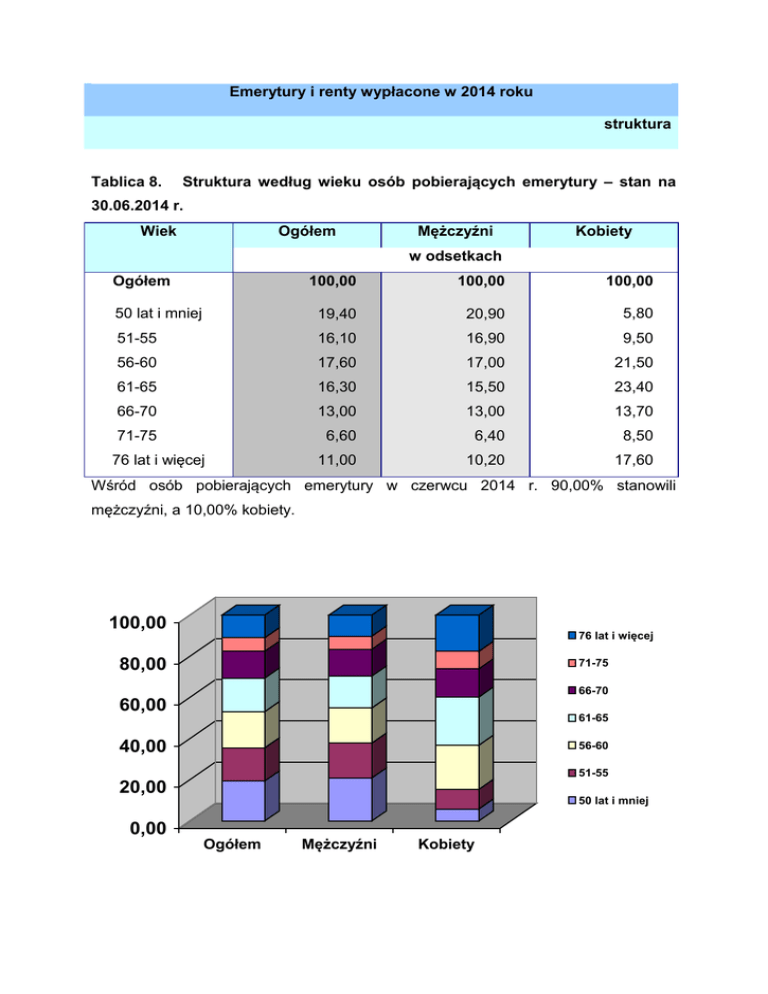 Emerytury i renty wypłacone w 2014 roku struktura Tablica 8. Struktura według wieku osób pobierających emerytury – stan na 30.06.2014 r. Ogółem Wiek Mężczyźni Kobiety w odsetkach Ogółem 100,00 100,00 100,00 50 lat i mniej 19,40 20,90 5,80 51-55 16,10 16,90 9,50 56-60 17,60 17,00 21,50 61-65 16,30 15,50 23,40 66-70 13,00 13,00 13,70 71-75 6,60 6,40 8,50 11,00 10,20 17,60 76 lat i więcej Wśród osób pobierających emerytury w czerwcu 2014 r. 90,00% stanowili mężczyźni, a 10,00% kobiety. 100,00 76 lat i więcej 80,00 71-75 66-70 60,00 61-65 40,00 56-60 51-55 20,00 0,00 50 lat i mniej Ogółem Mężczyźni Kobiety