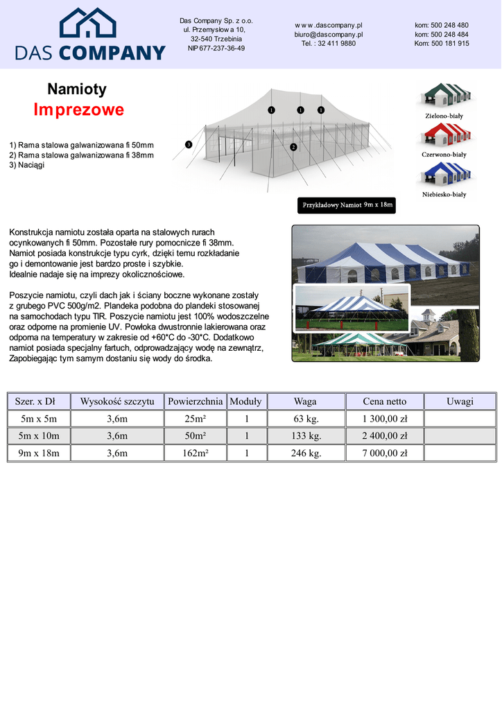 Das Company Sp. z o.o. ul. Przemysłow a 10, 32-540 Trzebinia NIP 677-237-36-49 w w w .dascompany.pl [email protected] Tel. : 32 411 9880 kom: 500 248 480 kom: 500 248 484 Kom: 500 181 915 Namioty Imprezowe 1) Rama stalowa galwanizowana fi 50mm 2) Rama stalowa galwanizowana fi 38mm 3) Naciągi Konstrukcja namiotu została oparta na stalowych rurach ocynkowanych fi 50mm. Pozostałe rury pomocnicze fi 38mm. Namiot posiada konstrukcje typu cyrk, dzięki temu rozkładanie go i demontowanie jest bardzo proste i szybkie. Idealnie nadaje się na imprezy okolicznościowe. Poszycie namiotu, czyli dach jak i ściany boczne wykonane zostały z grubego PVC 500g/m2. Plandeka podobna do plandeki stosowanej na samochodach typu TIR. Poszycie namiotu jest 100% wodoszczelne oraz odporne na promienie UV. Powłoka dwustronnie lakierowana oraz odporna na temperatury w zakresie od +60*C do -30*C. Dodatkowo namiot posiada specjalny fartuch, odprowadzający wodę na zewnątrz, Zapobiegając tym samym dostaniu się wody do środka. Szer. x Dł Wysokość szczytu Powierzchnia Moduły Waga Cena netto 5m x 5m 3,6m 25m² 1 63 kg. 1 300,00 zł 5m x 10m 3,6m 50m² 1 133 kg. 2 400,00 zł 9m x 18m 3,6m 162m² 1 246 kg. 7 000,00 zł Uwagi