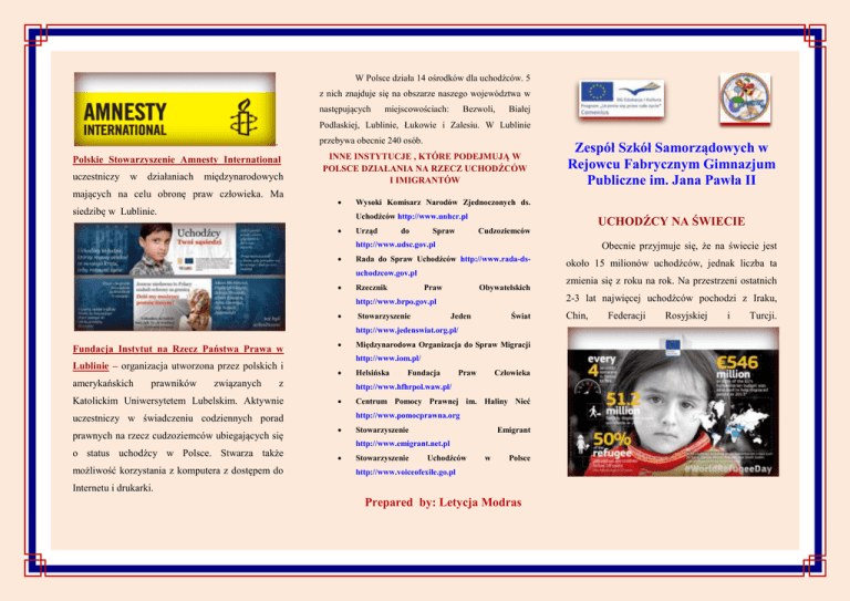 W Polsce działa 14 ośrodków dla uchodźców. 5 z nich znajduje się na obszarze naszego województwa w następujących miejscowościach: Bezwoli, Białej Podlaskiej, Lublinie, Łukowie i Zalesiu. W Lublinie przebywa obecnie 240 osób. . Polskie Stowarzyszenie Amnesty International uczestniczy w działaniach międzynarodowych mających na celu obronę praw człowieka. Ma siedzibę w Lublinie. INNE INSTYTUCJE , KTÓRE PODEJMUJĄ W POLSCE DZIAŁANIA NA RZECZ UCHODŹCÓW I IMIGRANTÓW Zespół Szkół Samorządowych w Rejowcu Fabrycznym Gimnazjum Publiczne im. Jana Pawła II Wysoki Komisarz Narodów Zjednoczonych ds. Uchodźców http://www.unhcr.pl Urząd do Spraw UCHODŹCY NA ŚWIECIE Cudzoziemców Obecnie przyjmuje się, że na świecie jest http://www.udsc.gov.pl Rada do Spraw Uchodźców http://www.rada-dsuchodzcow.gov.pl Rzecznik Praw Obywatelskich Stowarzyszenie Jeden Świat http://www.jedenswiat.org.pl/ Fundacja Instytut na Rzecz Państwa Prawa w Lublinie – organizacja utworzona przez polskich i amerykańskich prawników związanych Katolickim Uniwersytetem Lubelskim. Aktywnie o status uchodźcy w Polsce. Stwarza także możliwość korzystania z komputera z dostępem do Helsińska Fundacja Praw Człowieka http://www.hfhrpol.waw.pl/ Centrum Pomocy Prawnej im. Haliny Nieć http://www.pomocprawna.org uczestniczy w świadczeniu codziennych porad prawnych na rzecz cudzoziemców ubiegających się Międzynarodowa Organizacja do Spraw Migracji http://www.iom.pl/ z Stowarzyszenie Emigrant http://www.emigrant.net.pl Stowarzyszenie zmienia się z roku na rok. Na przestrzeni ostatnich 2-3 lat najwięcej uchodźców pochodzi z Iraku, http://www.brpo.gov.pl około 15 milionów uchodźców, jednak liczba ta Uchodźców w Polsce http://www.voiceofexile.go.pl Internetu i drukarki. Prepared by: Letycja Modras Chin, Federacji Rosyjskiej i Turcji. ORGANIZACJE POMAGAJĄCE SKĄD POCHODZĄ EMIGRANCI I UCHODŹCY MIESZKAJĄCY W POLSCE ? UCHODŹCOM I IMIGRANTOM Według statystyk w Polsce znajduje się W NASZYM REGIONIE .Zdecydowana W większość uchodźców pochodzi z terytorium organizacje Federacji Rosyjskiej. Około 98-99% to mieszkańcy uchodźcom i emigrantom, gdyż jesteśmy małym Czeczenii, Inguszetii, Dagestanu i Osetii. Pozostałe miasteczkiem, ale są takie instytucje w najbliższej 1-2 % to osoby z takich krajów jak: Białoruś, okolicy - w Chełmie Ukraina, Gruzja, Turcja, Wietnam, Chiny, Indie, Lublinie. około 25 tysięcy uchodźców Rejowcu Fabrycznym nie działają pozarządowe niosące pomoc i stolicy województwa Caritas Polska jest organizacją charytatywną Kościoła Rzymskokatolickiego. Organizuje działania niosące pomoc osobom bezrobotnym, Armenia, Irak, Afganistan, Pakistan, Somalia, bezdomnym, chorym, ubogim. Caritas udziela Sudan, Kamerun. pomocy ofiarom wojen i kataklizmów na terenie Polski i poza jej granicami, a także uchodźcom. Oddział tej organizacji znajduje się w mieście Chełm. Polski Czerwony Krzyż jest najstarszą polską organizacją pozarządowa działającą w Polsce od 1919 roku. Od lat dziewięćdziesiątych, kiedy nasz kraj stał się miejscem tranzytowym dla uchodźców PCK ŚWIATOWY DZIEŃ UCHODŹCY Coroczne święto obchodzone jest na świecie 20 czerwca. Upamiętnia odwagę i siłę uchodźców na całym świecie. zajmuje się udzielaniem im pomocy. Najbliższa siedziba znajduje się w naszym mieście Lubelskie Centrum Wolontariatu – to blisko 60- powiatowym - Chełmie osobowa grupa ochotników działających od 2001 roku. Łączą swoje siły by pomagać uchodźcom w ramach programu „Pomocy Uchodźcom”. W lubelskim Ośrodku dla Cudzoziemców każdego dnia dają nadzieję, pokazują czym jest polska solidarność i ludzka gościnność. In Poland there are 14 centers for refugees. 5 of them are in the area of our province in the cities of: Bezwola, Biała Podlaska, Lublin, Łuków and Zalesie. In . Polish Association Amnesty participates International in international activities aimed at defending human rights. It Lublin reside currently 240 people. OTHER INSTYTUTIONS IN POLAND, WHICH TAKE Zespół Szkół Samorządowych w Rejowcu Fabrycznym Gimnazjum Publiczne im. Jana Pawła II ACTIONS FOR REFUGEES AND IMMIGRANTS has the office in Lublin. Wysoki Komisarz Narodów Zjednoczonych ds. Uchodźców http://www.unhcr.pl Urząd do Spraw Cudzoziemców Currently, it is assumed that on the whole world there are about 15 million http://www.udsc.gov.pl REFUGEES IN THE WORLD Rada do Spraw Uchodźców http://www.rada-ds- refugees, but this number is changing every uchodzcow.gov.pl Rzecznik Praw Obywatelskich refugees have come from: Iraq, China, the http://www.brpo.gov.pl Stowarzyszenie Jeden Świat http://www.jedenswiat.org.pl/ The Rule of Law Institute Foundation in Lublin – organization created by Polish and American lawyers connected with Catholic applying for refugee status in Poland. It also gives a possibility to use a computer with an Helsińska Fundacja Praw Człowieka http://www.hfhrpol.waw.pl/ University of Lublin. It actively involved in giving daily legal advice for foreigners Międzynarodowa Organizacja do Spraw Migracji http://www.iom.pl/ Centrum Pomocy Prawnej im. Haliny Nieć http://www.pomocprawna.org Stowarzyszenie Emigrant http://www.emigrant.net.pl Stowarzyszenie year. Over the last 2-3 years, most of the Uchodźców w Polsce http://www.voiceofexile.go.pl access to the Internet and a printer. Prepared by: Letycja Modras Russian Federation and Turkey. WHERE DO THE EMIGRANTS AND REFUGEES LIVING IN POLAND COME FROM ? According to the statistics, there are about 25 thousand refugees in Poland. The vast majority of refugees come from the Russian Federation. About 98-99% of them are the ORGANIZATIONS HELPING REFUGEES AND IMMIGRANTS IN OUR REGION In Rejowiec Fabryczny there aren’t any non-governmental organizations providing aid for refugees and immigrants, because our town is small, but such institutions are in our nighbourhood – in 