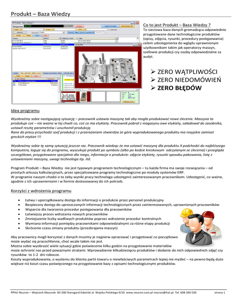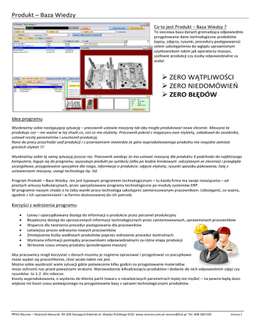 Produkt – Baza Wiedzy Co to jest Produkt – Baza Wiedzy ? To sieciowa baza danych gromadząca odpowiednio przygotowane dane technologiczne produktów (opisy, zdjęcia, rysunki, procedury postępowania) celem udostępnienia do wglądu uprawnionym użytkownikom takim jak operatorzy maszyn, szefowie produkcji czy osoby odpowiedzialne za audyt. ZERO WĄTPLIWOŚCI ZERO NIEDOMÓWIEŃ ZERO BŁĘDÓW Idea programu Wyobraźmy sobie następującą sytuację – pracownik ustawia maszynę tak aby mogła produkować nowe zlecenie. Maszyna ta produkuje coś – nie ważne w tej chwili co, coś co ma etykiety. Pracownik pobrał z magazynu owe etykiety, załadował do zasobnika, ustawił resztę parametrów i uruchomił produkcję. Rano do pracy przychodzi szef produkcji i z przerażeniem stwierdza że góra wyprodukowanego produktu ma rosyjskie zamiast greckich etykiet !!! Wyobraźmy sobie tę samą sytuację jeszcze raz. Pracownik wiedząc że ma ustawić maszynę dla produktu X podchodzi do najbliższego komputera, loguje się do programu, wyszukuje produkt po symbolu (albo po kodzie kreskowym odczytanym ze zlecenia) i przegląda szczegółowe, przygotowane specjalnie dla niego, informacje o produkcie: zdjęcie etykiety, rysunki sposobu pakowania, listę z ustawieniami maszyny, uwagi technologa itp. itd. Program Produkt – Baza Wiedzy nie jest typowym programem technologicznym – tu każda firma ma swoje rozwiązania – od prostych arkuszy kalkulacyjnych, przez specjalizowane programy technologiczne po moduły systemów ERP. W programie naszym chodzi o to żeby wyniki pracy technologa udostępnić zainteresowanym pracownikom. Udostępnić, co ważne, zgodnie z ich uprawnieniami i w formie dostosowanej do ich potrzeb. Korzyści z wdrożenia programu Łatwy i uporządkowany dostęp do informacji o produkcie przez personel produkcyjny Bezpieczny dostęp do uproszczonych informacji technologicznych przez zainteresowanych, uprawnionych pracowników Wsparcie dla tworzenia procedur postępowania dla pracowników Łatwiejszy proces wdrażania nowych pracowników Zmniejszenie liczby wadliwych produktów poprzez wdrożenie procedur kontrolnych Wymiana informacji pomiędzy pracownikami odpowiedzialnymi za różne etapy produkcji Skrócenie czasu zmiany produktu (przezbrajania maszyn) Aby pracownicy mogli korzystać z danych musimy je najpierw opracować i przygotować co początkowo może wydać się pracochłonne, choć wcale takim nie jest. Można sobie wyobrazić wiele sytuacji gdzie poświecenie kilku godzin na przygotowanie materiałów może ochronić nas przed poważnymi stratami. Wprowadzenie kilkudziesięciu produktów i dodanie do nich odpowiednich zdjęć czy rysunków to 1-2 dni robocze. Koszty wyprodukowania, o wysłaniu do klienta partii towaru o niewłaściwych parametrach lepiej nie myśleć – na pewno będą dużo większe niż koszt czasu poświęconego na przygotowanie bazy z opisami technologicznymi produktów. PPHU Neuron – Wojciech Mazurek 83-200 Starogard Gdański al. Wojska Polskiego 9/10 www.neuron.com.pl [email protected] Tel. 608 260 530 strona 1 Produkt – Baza Wiedzy Praca w sieci Oprogramowanie jest oprogramowaniem sieciowym opartym o serwer SQL. Oznacza to że dostęp do programu jest możliwy z wielu komputerów pracujących w sieci zakładowej. Oczywiście dostęp do programu a co za tym idzie do zawartych w nim informacji obwarowany jest systemem haseł. Ważny jest też fakt że nie pobieramy opłat za ilość stanowisk – licencja odnosi się do dowolnej ilości programów podłączonych do jednej bazy danych. Tryb edycji, tryb odczytu Program można przełączać w tryb edycji lub tryb pozwalający tylko na przeglądanie zgromadzonych danych. Jednak aby była możliwa edycja danych aktualnie zalogowany do programu pracownik musi posiadać stosowne uprawnienie. Możliwe też jest ustalenie konfiguracji danego programu (kopii programu zainstalowanej na danym komputerze) tak aby umożliwiał dostęp tylko do danych określonego wydziału albo nie były na nim dostępne niektóre elementy. Baza produktów Podstawą jest lista produktów. Produkty na liście możemy podzielić na grupy i możemy przypisać im kilka kodów, w tym kody kreskowe. Lista może być w dowolny sposób sortowana i filtrowana z wyszukiwaniem za pomocą czytnika kodów włącznie. Do każdego z produktów możemy przypisać dalsze elementy – listy specjalnych notatek mogących zawierać grafiki, pliki, linki i komentarze. Opisy, parametry, zdjęcia Dla każdego produktu możemy dodać dowolną ilość specjalnie przygotowanych notatek. Poza nazwą możemy wybrać ikonę i jedną z czterech kategorii: Technologia Produkcja Utrzymanie ruchu Inne Kategorie są o tyle ważne że pozwalają na ich przydzielenie poszczególnym pracownikom. Pracownik może mieć np. dostęp do kategorii produkcja ale nie mieć dostępu (nie widzieć) pozostałych kategorii. Następnym elementem jest notatnik ze specjalnym sposobem formatowania tekstu pozwalający na robienie list, opisów, uwag etc. Do każdej notatki możemy dodać 4 zdjęcia lub rysunki które zapisywane są w bazie danych. Najważniejszą jednak funkcjonalnością jest możliwość dodania do każdej notatki czterech zdjęć lub rysunków. Mogą to być zdjęcia produktu, etykiet, rysunki pokazujące sposób pakowania produktu. Można też pokusić się o przygotowanie graficznych instrukcji – rysunków czy zdjęć z nałożonymi za pomocą programu graficznego opisami. Ciekawą możliwością jest umieszczanie w bazie zdjęcia z ekranu z programów do edycji dokumentów, np. Excela czy Worda. Wykorzystujemy fakt że system pozwala na zapis widoku ekranu (PrtScr – cały ekran lub Alt+ PrtScr – aktywne okno) oraz narzędzie dzięki któremu możemy dodać grafikę ze schowka uprzednio ją kadrując. Otwieramy dokument, robimy PrintScreen, w oknie dodawania grafiki wybieramy opcję ładuj ze schowka, przycinamy obraz tak aby nie było widać