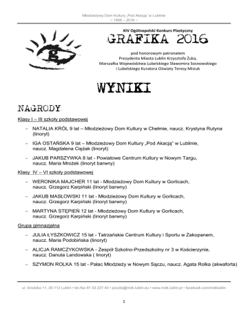 Młodzieżowy Dom Kultury „Pod Akacją” w Lublinie ~ 1956 – 2016 ~ XIV Ogólnopolski Konkurs Plastyczny GRAFIKA 2016 pod honorowym patronatem Prezydenta Miasta Lublin Krzysztofa Żuka, Marszałka Województwa Lubelskiego Sławomira Sosnowskiego i Lubelskiego Kuratora Oświaty Teresy Misiuk WYNIKI NAGRODY Klasy I – III szkoły podstawowej NATALIA KRÓL 9 lat – Młodzieżowy Dom Kultury w Chełmie, naucz. Krystyna Rutyna (linoryt) IGA OSTAŃSKA 9 lat – Młodzieżowy Dom Kultury „Pod Akacją” w Lublinie, naucz. Magdalena Ciężak (linoryt) JAKUB PARSZYWKA 8 lat - Powiatowe Centrum Kultury w Nowym Targu, naucz. Maria Mrożek (linoryt barwny) Klasy IV – VI szkoły podstawowej WERONIKA MAJCHER 11 lat - Młodzieżowy Dom Kultury w Gorlicach, naucz. Grzegorz Karpiński (linoryt barwny) JAKUB MASŁOWSKI 11 lat - Młodzieżowy Dom Kultury w Gorlicach, naucz. Grzegorz Karpiński (linoryt barwny) MARTYNA STĘPIEŃ 12 lat - Młodzieżowy Dom Kultury w Gorlicach, naucz. Grzegorz Karpiński (linoryt barwny) Grupa gimnazjalna JULIA ŁYSZKOWICZ 15 lat - Tatrzańskie Centrum Kultury i Sportu w Zakopanem, naucz. Maria Podobińska (linoryt) ALICJA RAMCZYKOWSKA - Zespół Szkolno-Przedszkolny nr 3 w Kościerzynie, naucz. Danuta Landowska ( linoryt) SZYMON ROLKA 15 lat - Pałac Młodzieży w Nowym Sączu, naucz. Agata Rolka (akwaforta) ul. Grodzka 11, 20-112 Lublin • tel./fax 81 53 227 40 • [email protected] • www.mdk.lublin.pl • facebook.com/mdklublin 1 Młodzieżowy Dom Kultury „Pod Akacją” w Lublinie ~ 1956 – 2016 ~ Grupa ponadgimnazjalna MARTYNA ĆWIERTNIA 17 lat - Młodzieżowy Dom Kultury w Rybniku, Pracownia Plastyczna „Creatio”, naucz. Aldona Kaczmarczyk-Kołucka (linoryt) KINGA MAMZER 17 lat - Młodzieżowy Dom Kultury w Kluczborku, naucz. Józef Zając (sucha igła) HANNA WRÓBLEWSKA 17 lat - Młodzieżowy Dom Kultury w Rybniku, Pracownia Plastyczna „Creatio”, naucz. Aldona Kaczmarczyk-Kołucka (linoryt barwny) WYRÓŻNIENIA Klasy I - III szkoły podstawowej MAJA GRZEGORCZYK 7 lat - Powiatowe Centrum Kultury w Nowym Targu, naucz. Maria Mrożek (linoryt barwny) BARTŁOMIEJ SYK 7 lat - Młodzieżowy Dom Kultury w Chełmie, naucz. Krystyna Rutyna (linoryt) NADIA TARSA 9 lat - Młodzieżowy Dom Kultury w Gorlicach, naucz. Grzegorz Karpiński (linoryt barwny) HANNA WÓJCIK 9 lat – Młodzieżowy Dom Kultury „Pod Akacją” w Lublinie, naucz. Magdalena Ciężak (linoryt) Klasy IV - VI szkoły podstawowej MONIKA ŚCIBIORSKA 10 lat - Młodzieżowy Dom Kultury „Pod Akacją” w Lublinie, naucz. Magdalena Ciężak (linoryt) MAJA KACZOR 11 lat - Młodzieżowy Dom Kultury w Rybniku, Pracownia Plastyczna „Creatio”, naucz. Aldona Kaczmarczyk-Kołucka (linoryt barwny) MAŁGORZATA MANDEL - Młodzieżowy Dom Kultury w Rybniku, Pracownia Plastyczna „Creatio”, naucz. Aldona Kaczmarczyk-Kołucka (linoryt barwny) AGATA SAGUŁA 11 lat - Tatrzańskie Centrum Kultury i Sportu w Zakopanem, naucz. Maria Podobińska (linoryt) ul. Grodzka 11, 20-112 Lublin • tel./fax 81 53 227 40 • [email protected] • www.mdk.lublin.pl • facebook.com/mdklublin 2 Młodzieżowy Dom Kultury „Pod Akacją” w Lublinie ~ 1956 – 2016 ~ Grupa gimnazjalna ADRIAN NABOŻNY 14 lat - Młodzieżowy Dom Kultury w Gorlicach, naucz. Grzegorz Karpiński (linoryt barwny) ANTONI LITERA 15 lat - Młodzieżowy Dom Kultury w Rybniku, Pracownia Plastyczna „Creatio”, naucz. Aldona Kaczmarczyk-Kołucka (linoryt barwny) JULIA SOBIECKA 15 lat - Młodzieżowy Dom Kultury w Rybniku, Pracownia Plastyczna „Creatio”, naucz. Aldona Kaczmarczyk-Kołucka (linoryt barwny) PAWEŁ OSZCZYPKO 15 lat - Młodzieżowy Dom Kultury w Kluczborku, naucz. Józef Zając (druk wklęsły) Grupa ponadgimnazjalna JAROGNIEW BARCISZEWSKI-KOZIOŁ 16 lat - Pałac Młodzieży w Nowym Sączu, naucz. Agata Rolka ( sucha igła) EWA SZREDER 18 lat - Młodzieżowy Dom Kultury w Rybniku, Pracownia Plastyczna „Creatio”, naucz. Aldona Kaczmarczyk-Kołucka (linoryt barwny) ZUZANNA SZMAJDUCH 18 lat - Młodzieżowy Dom Kultury w Rybniku, Pracownia Plastyczna „Creatio”, naucz. Aldona Kaczmarczyk-Kołucka (linoryt barwny) ŁUKASZ MROŻEK 18lat - Powiatowe Centrum Kultury w Nowym Targu, naucz. Maria Mrożek (drzeworyt) ALEKSANDRA BŁASZCZAK 18 lat - Młodzieżowy Dom Kultury nr 2 w Lublinie, naucz. Anna Staniak (linoryt) UDZIAŁ W WYSTAWIE POKONKURSOWEJ Powiatowe Centrum Kultury w Nowym Targu, naucz. Maria Mrożek RÓŻA CIĘŻAK 7 lat (linoryt barwny) JAKUB PARSZYWKA 8 lat (linoryt barwny) TOMEK KURKOWSKI 8 lat (linoryt barwny) OLGA JARÓG 8 lat (linoryt barwny) ESTERA TROCHIMIUK 8 lat (linoryt barwny) JULIA PAJĄK 9 lat (linoryt barwny) ul. Grodzka 11, 20-112 Lublin • tel./fax 81 53 227 40 • [email protected] • www.mdk.lublin.pl • facebook.com/mdklublin 3 Młodzieżowy Dom Kultury „Pod Akacją” w Lublinie ~ 1956 – 2016 ~ JUDYTA WAWRZON 9 lat (linoryt barwny) PAWEŁ BATKIEWICZ 9 lat (linoryt barwny) NIKOLA WÓJCIAK 9 lat (linoryt barwny) ILONA MARKOWICZ 10 lat (linoryt barwny) MATEUSZ FRYŹLEWICZ 10 lat (linoryt barwny) ŁUKASZ MROŻEK 18lat (linoryt barwny) Młodzieżowy Dom Kultury w Rybniku, Pracownia Plastyczna „Creatio”, naucz. Aldona Kaczmarczyk-Kołucka MARIA ZIMOŃCZYK 7 lat (linoryt barwny) FRANCISZEK ZAKRZEWSKI 8 lat (linoryt barwny) EMILIA KOTAS 11 lat (linoryt barwny) MIKOŁAJ KOTAS 11 lat (linoryt barwny) JULIA KONSEK 11 lat (linoryt barwny) MARTYNA ZAKRZEWSKA 12 lat (linoryt barwny) KINGA NOWAK 16 lat (linoryt barwny) KAROLINA ZIELONKA 18 lat (linoryt barwny) Młodzieżowy Dom Kultury w Gorlicach, naucz. Grzegorz Karpiński ZUZANNA PRZYBYŁO 10 lat (linoryt barwny) JAKUB ROLAK 11 lat (linoryt barwny) ZUZANNA KOPKA 12 lat (linoryt barwny) IGA PAWŁOWSKA 12 lat (linoryt barwny) ZUZANNA CISOWSKA 12 lat (linoryt barwny) IZABELA ODUNCU 13 lat (linoryt barwny) ANNA KULIŃSKA 15 ( sucha igła) ul. Grodzka 11, 20-112 Lublin • tel./fax 81 53 227 40 • [email protected] • www.mdk.lublin.pl • facebook.com