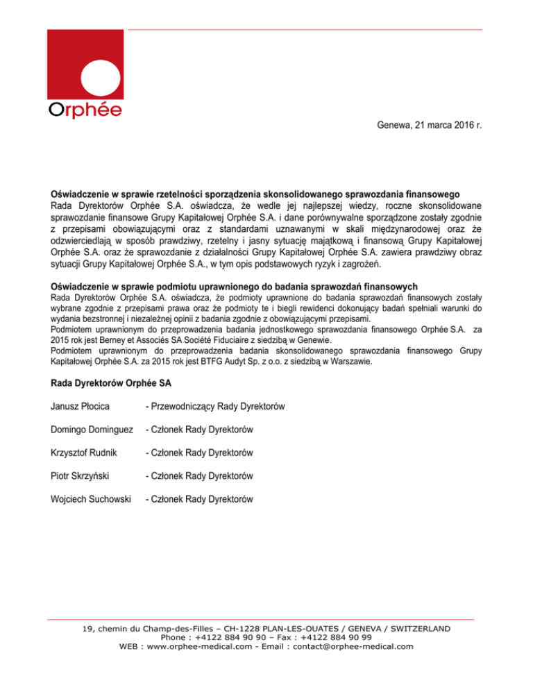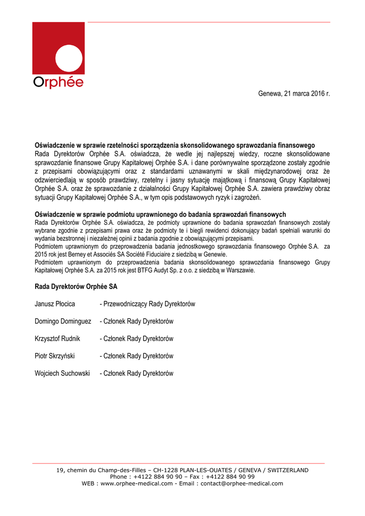 Genewa, 21 marca 2016 r. Oświadczenie w sprawie rzetelności sporządzenia skonsolidowanego sprawozdania finansowego Rada Dyrektorów Orphée S.A. oświadcza, że wedle jej najlepszej wiedzy, roczne skonsolidowane sprawozdanie finansowe Grupy Kapitałowej Orphée S.A. i dane porównywalne sporządzone zostały zgodnie z przepisami obowiązującymi oraz z standardami uznawanymi w skali międzynarodowej oraz że odzwierciedlają w sposób prawdziwy, rzetelny i jasny sytuację majątkową i finansową Grupy Kapitałowej Orphée S.A. oraz że sprawozdanie z działalności Grupy Kapitałowej Orphée S.A. zawiera prawdziwy obraz sytuacji Grupy Kapitałowej Orphée S.A., w tym opis podstawowych ryzyk i zagrożeń. Oświadczenie w sprawie podmiotu uprawnionego do badania sprawozdań finansowych Rada Dyrektorów Orphée S.A. oświadcza, że podmioty uprawnione do badania sprawozdań finansowych zostały wybrane zgodnie z przepisami prawa oraz że podmioty te i biegli rewidenci dokonujący badań spełniali warunki do wydania bezstronnej i niezależnej opinii z badania zgodnie z obowiązującymi przepisami. Podmiotem uprawnionym do przeprowadzenia badania jednostkowego sprawozdania finansowego Orphée S.A. za 2015 rok jest Berney et Associés SA Société Fiduciaire z siedzibą w Genewie. Podmiotem uprawnionym do przeprowadzenia badania skonsolidowanego sprawozdania finansowego Grupy Kapitałowej Orphée S.A. za 2015 rok jest BTFG Audyt Sp. z o.o. z siedzibą w Warszawie. Rada Dyrektorów Orphée SA Janusz Płocica - Przewodniczący Rady Dyrektorów Domingo Dominguez - Członek Rady Dyrektorów Krzysztof Rudnik - Członek Rady Dyrektorów Piotr Skrzyński - Członek Rady Dyrektorów Wojciech Suchowski - Członek Rady Dyrektorów 19, chemin du Champ-des-Filles – CH-1228 PLAN-LES-OUATES / GENEVA / SWITZERLAND Phone : +4122 884 90 90 – Fax : +4122 884 90 99 WEB : www.orphee-medical.com - Email : [email protected]