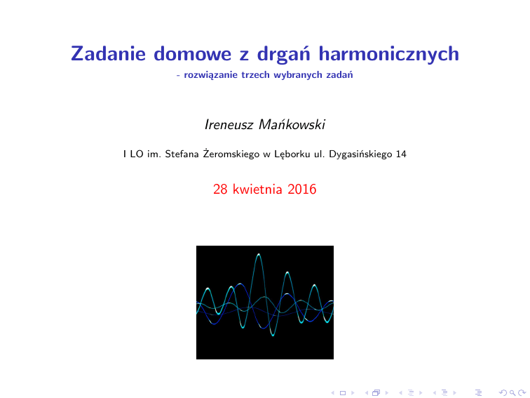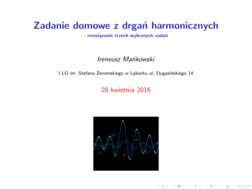 Zadanie domowe z drgań harmonicznych - rozwiązanie trzech wybranych zadań Ireneusz Mańkowski I LO im. Stefana Żeromskiego w Lęborku ul. Dygasińskiego 14 28 kwietnia 2016 Zadanie 5.4.4 Zadanie 5.4.5 Zadanie 5.4.6 Wybrane zadania domowe 1 Zadanie 5.4.4 Rozwiązanie zadania 5.4.4 2 Zadanie 5.4.5 Rozwiązanie zadania 5.4.5 3 Zadanie 5.4.6 Rozwiązanie zadania 5.4.6 Ireneusz Mańkowski Zadanie domowe z drgań harmonicznych I LO im. Stefana Żeromskiego w Lęborku ul. Dygasińskiego 14 Zadanie 5.4.4 Zadanie 5.4.5 Zadanie 5.4.6 Zadanie domowe Zadanie 5.4.4 Na lekcji fizyki uczniowie przywiązali cienki nierozciągliwy sznurek do ogonka jabłka. Otrzymali model wahadła matematycznego. Po wychyleniu z położenia równowagi o niewielki kąt jabłko wykonywało drgania harmoniczne o stałej amplitudzie. Oblicz stosunek energii potencjalnej grawitacji EP i energii kinetycznej EK drgającego na sznurku jabłka, gdy jest ono wychylone z położenia równowagi o x = 14 A Ireneusz Mańkowski Zadanie domowe z drgań harmonicznych I LO im. Stefana Żeromskiego w Lęborku ul. Dygasińskiego 14 Zadanie 5.4.4 Zadanie 5.4.5 Zadanie 5.4.6 Rozwiązanie zadania 5.4.4 W rozwiązaniu zadania skorzystamy ze wzoru na energię całkowitą i energię kinetyczną ruchu harmonicznego naszego modelu wahadła. x(t) = Asin(ωt) x(t) − wychylenie 1 mω 2 A2 2 1 EP = mω 2 x 2 2 EC = EK + EP = (1) (2) (3) Mając wyrażenie (3) opisujące energię potencjalną możemy wyznaczyć energię kinetyczną wahadła jako różnicę energii całkowitej i energii potencjalnej czyli: EK = Ireneusz Mańkowski Zadanie domowe z drgań harmonicznych 1 1 1 mω 2 A2 − mω 2 x 2 = mω 2 (A2 − x2 ) 2 2 2 1 x= A 4 (4) (5) I LO im. Stefana Żeromskiego w Lęborku ul. Dygasińskiego 14 Zadanie 5.4.4 Zadanie 5.4.5 Zadanie 5.4.6 Rozwiązanie zadania 5.4.4 Korzystając z warunków zadania dla x = 14 A uzyskujemy podstawiając do (4) wyrażenie na energię kinetyczną EK w postaci: EK = 1 1 A2 15 mω 2 (A2 − x 2 ) = mω 2 (A2 − )= mω 2 A2 2 2 16 32 (6) A ponadto po podstawieniu x = 14 A do (3) dostajemy: EP = 1 1 A2 1 mω 2 x 2 = mω 2 = mω 2 A2 2 2 16 32 (7) Ostatecznie z dwóch ostatnich wyrażeń wyznaczymy szukany stosunek energii EP do EK . EP = EK Ireneusz Mańkowski Zadanie domowe z drgań harmonicznych 1 2 2 32 mω A 15 2 2 32 mω A = 1 15 (8) I LO im. Stefana Żeromskiego w Lęborku ul. Dygasińskiego 14 Zadanie 5.4.4 Zadanie 5.4.5 Zadanie 5.4.6 Zadanie domowe Zadanie 5.4.5 Metalowa nakrętka o masie m = 0, 05 kg zawieszona na nierozciągliwym cienkim sznurku stanowi wahadło matematyczne, które wykonuje drgania o amplitudzie A = 5 cm i częstotliwości f = 2 Hz. Oblicz energię potencjalną grawitacji i energię kinetyczną metalowej nakrętki, gdy wychyla się ona z położenia równowagi o x = 3 cm. Ireneusz Mańkowski Zadanie domowe z drgań harmonicznych I LO im. Stefana Żeromskiego w Lęborku ul. Dygasińskiego 14 Zadanie 5.4.4 Zadanie 5.4.5 Zadanie 5.4.6 Rozwiązanie zadania 5.4.5 Podobnie jak przy rozwiązaniu pierwszego zadania korzystamy z wyrażeń opisujących energię dla ruchu harmonicznego prostego. Dla drgań harmonicznych wahadła matematycznego energia potencjalna grawitacji jest wprost proporcjonalna do kwadratu wychylenia masy z położenia równowagi co wyraża wzór: EP (x) = 1 mω 2 x 2 2 (9) Przekształcając wzór (9) otrzymamy wyrażenie w postaci: EP (x) = 1 m(2πf )2 x 2 = 2mπ 2 f 2 x2 2 (10) Podobnie dla energii kinetycznej otrzymamy wyrażenie w postaci: EK (x) = Ireneusz Mańkowski Zadanie domowe z drgań harmonicznych 1 mω 2 (A2 − x 2 ) = 2mπ 2 f 2 (A2 − x2 ) 2 (11) I LO im. Stefana Żeromskiego w Lęborku ul. Dygasińskiego 14 Zadanie 5.4.4 Zadanie 5.4.5 Zadanie 5.4.6 Rozwiązanie zadania 5.4.5 Korzystając z danych zadania wyznaczamy szukane energie podstawiając do wzorów (10) i (11): Ostateczne wyniki rozwiązania zadania EP ≈ 2 · 3, 142 · 0, 05 kg · 22 EK ≈ 2 · 3, 142 · 0, 05 kg · 22 Ireneusz Mańkowski Zadanie domowe z drgań harmonicznych 1 · (5 · 10−2 )2 m2 ≈ 3, 55 · 10−3 J s2 1 2 (5 − 32 ) · 10−4 m2 ≈ 6, 32 · 10−3 J s2 I LO im. Stefana Żeromskiego w Lęborku ul. Dygasińskiego 14 Zadanie 5.4.4 Zadanie 5.4.5 Zadanie 5.4.6 Zadanie domowe Zadanie 5.4.6 Huśtawkę wykonaną ze zużytej opony zawieszonej na linie żeglarskiej przywiązanej do poziomego konara drzewa wychylono z położenia równowagi. Wyznacz stosunek energii kinetycznej i energii całkowitej drgań huśtawki po upływie czasu t = T8 od momentu jej przejścia przez położenie równowagi. Ireneusz Mańkowski Zadanie domowe z drgań harmonicznych I LO im. Stefana Żeromskiego w Lęborku ul. Dygasińskiego 14 Zadanie 5.4.4 Zadanie 5.4.5 Zadanie 5.4.6 Rozwiązanie zadania 5.4.6 W rozwiązaniu zadania skorzystamy z zasady zachowania energii dla ruchu harmonicznego. Wiemy, że całkowita energia ruchu harmonicznego jest proporcjonalna do kwadratu amplitudy tzn. 1 mω 2 A2 2 1 2π 1 EP = mω 2 A2 sin2 (ωt) = mω 2 A2 sin2 ( t) 2 2 T EC = EK + EP = Po wstawieniu za t = EP = T 8 (12) (13) do (2) dostajemy: 1 2π T 1 π mω 2 A2 sin2 ( ) = mω 2 A2 sin2 ( ) 2 T 8 2 4 √ 1 2 1 EP = mω 2 A2 ( )2 = mω 2 A2 2 2 4 Mając EP wyznaczymy EK czyli ostatecznie szukany stosunek wynosi: EK EC − EP 1 = = EC EC 2 Ireneusz Mańkowski Zadanie domowe z drgań harmonicznych (14) I LO im. Stefana Żeromskiego w Lęborku ul. Dygasińskiego 14