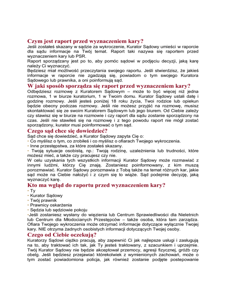 Czym jest raport przed wyznaczeniem kary? Jeśli zostałeś skazany w sądzie za wykroczenie, Kurator Sądowy umieści w raporcie dla sądu informacje na Twój temat. Raport taki nazywa się raportem przed wyznaczeniem kary lub PSR. Raport sporządzany jest po to, aby pomóc sądowi w podjęciu decyzji, jaką karę należy Ci wyznaczyć. Będziesz miał możliwość przeczytania swojego raportu. Jeśli stwierdzisz, że jakieś informacje w raporcie nie zgadzają się, powiadom o tym swojego Kuratora Sądowego lub prawnika, a oni poinformują sąd. W jaki sposób sporządza się raport przed wyznaczeniem kary? Odbędziesz rozmowę z Kuratorem Sądowym – może to być więcej niż jedna rozmowa, 1 w biurze kuratorium, 1 w Twoim domu. Kurator Sądowy ustali datę i godzinę rozmowy. Jeśli jesteś poniżej 18 roku życia, Twoi rodzice lub opiekun będzie obecny podczas rozmowy. Jeśli nie możesz przyjść na rozmowę, musisz skontaktować się ze swoim Kuratorem Sądowym lub jego biurem. Od Ciebie zależy czy stawisz się w biurze na rozmowie i czy raport dla sądu zostanie sporządzony na czas. Jeśli nie stawiłeś się na rozmowę i z tego powodu raport nie mógł zostać sporządzony, kurator musi poinformować o tym sąd. Czego sąd chce się dowiedzieć? Sąd chce się dowiedzieć, a Kurator Sądowy zapyta Cię o: • Co myślisz o tym, co zrobiłeś i co myślisz o ofiarach Twojego wykroczenia. • Inne przestępstwa, za które zostałeś skazany. • Twoją sytuacje osobistą, np.: Twoją rodzinę, uzależnienia lub trudności, które możesz mieć, a także czy pracujesz czy nie. W celu uzyskania tych wszystkich informacji Kurator Sądowy może rozmawiać z innymi ludźmi, którzy Cię znają. Zostaniesz poinformowany, z kim muszą porozmawiać. Kurator Sądowy porozmawia z Tobą także na temat różnych kar, jakie sąd może na Ciebie nałożyć i z czym się to wiąże. Sąd podejmie decyzję, jaką wyznaczyć karę. Kto ma wgląd do raportu przed wyznaczeniem kary? • Ty • Kurator Sądowy • Twój prawnik • Prawnicy oskarżenia • Sędzia lub sędziowie pokoju •Jeśli zostaniesz wysłany do więzienia lub Centrum Sprawiedliwości dla Nieletnich lub Centrum dla Młodocianych Przestępców – także osoba, która tam zarządza. Ofiara Twojego wykroczenia może otrzymać informacje dotyczące wyłącznie Twojej kary. NIE otrzyma żadnych osobistych informacji dotyczących Twojej osoby. Czego od Ciebie oczekują? Kuratorzy Sądowi ciężko pracują, aby zapewnić Ci jak najlepsze usługi i zasługują na to, aby traktować ich tak, jak Ty jesteś traktowany, z szacunkiem i uprzejmie. Twój Kurator Sądowy nie będzie akceptował przemocy, agresji fizycznej, gróźb czy obelg. Jeśli będziesz przejawiać którekolwiek z wymienionych zachowań, może o tym zostać powiadomiona policja, jak również zostanie podjęte postepowanie prawne. Rozmowa może zostać odwołana, jeśli uznamy, że osoba zachowuje się w nieakceptowalny sposób lub jest pod wpływem alkoholu lub narkotyków. Co możesz zrobić, jeśli nie jesteś zadowolony ze sposobu, w jaki potraktowała Cię Rada Kuratorium? Możesz porozmawiać z Kuratorem Sądowym, jego menadżerem lub skontaktować się z Urzędnikiem ds. Zażaleń: The Complaints Officer, PBNI Headquarters 80/90 North St, Belfast, BT1 1LD T: 028 90262400 Urzędnik ds. Zażaleń skontaktuje się z Tobą w ciągu 5 dni pracujących. © PBNI June 2013 80/90 North Street BELFAST, BT1 1LD PBNI Headquarters T: 028 9026 2400 F: 0300 123 3290 E: [email protected] www.pbni.org.uk Użyteczne dane kontaktowe Biura w Belfaście Assessment Unit, HQ 028 9026 2400 Inspire Project, North Street 028 9026 2515 ISU, Alderwood 028 9064 4953 ISU, Great Patrick Street 028 9029 6010 Programme Delivery Unit 028 9033 3332 Public Protection Team 028 9025 9576 Victim Information Scheme 028 9032 1972 North - Antrim Road 028 9075 7631 East - Newtownards Road 028 9073 9445 South - Ormeau Road 028 9064 7156 West - Andersonstown Road 028 9060 2988 Biura poza Belfastem Armagh 028 3752 5243 Ballymena 028 2565 2549 Coleraine 028 7035 3141 Dungannon 028 8772 2866 Enniskillen 028 6632 4383 Lisburn (Zespół ds. Nieletnich ) 028 9267 4211 Crawford Square, Londonderry 028 7126 4774 Limavady Road, Londonderry 028 7134 6701 Magherafelt 028 7963 3341 Newry 028 3026 3955 Newtownards 028 9181 7778 Omagh 028 8224 6051 Portadown 028 3833 3301 Zespoły pracujące w więieniach H M P Maghaberry 028 9261 6772 H M P Magilligan 028 7775 0434 H M YOC & P Hydebank 028 9049 4100