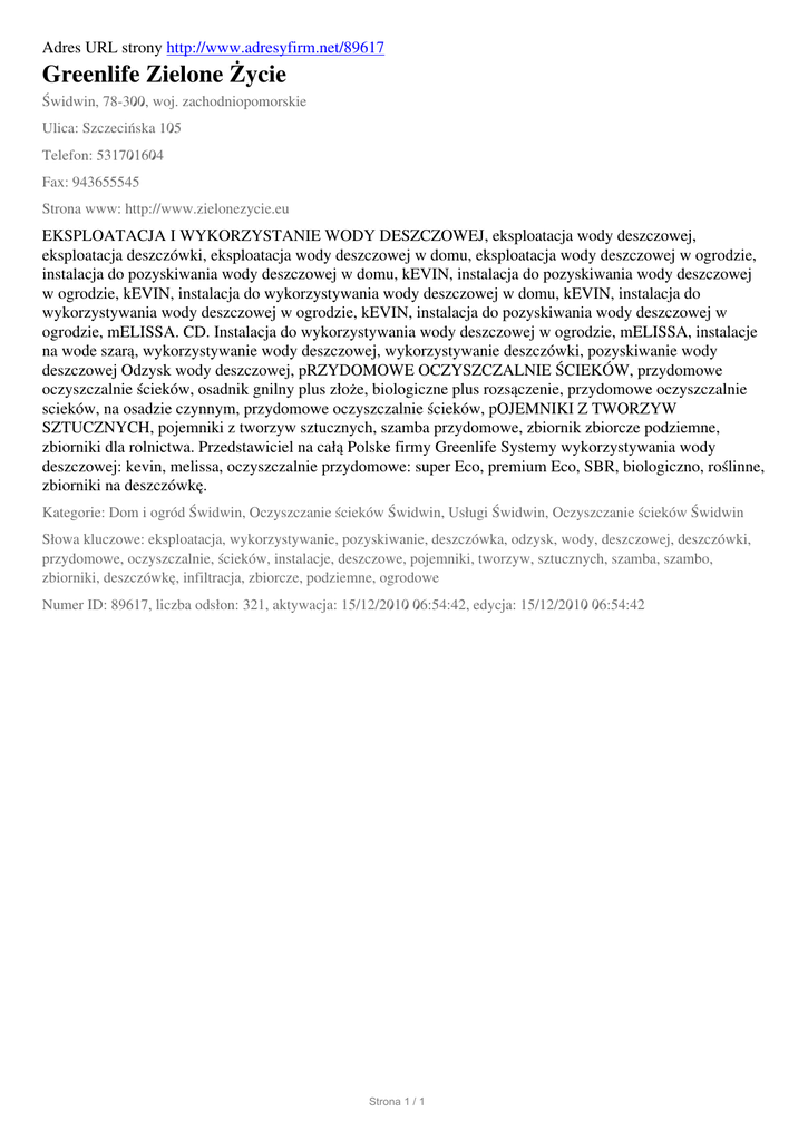 Adres URL strony http://www.adresyfirm.net/89617 Greenlife Zielone Życie Świdwin, 78-300, woj. zachodniopomorskie Ulica: Szczecińska 105 Telefon: 531701604 Fax: 943655545 Strona www: http://www.zielonezycie.eu EKSPLOATACJA I WYKORZYSTANIE WODY DESZCZOWEJ, eksploatacja wody deszczowej, eksploatacja deszczówki, eksploatacja wody deszczowej w domu, eksploatacja wody deszczowej w ogrodzie, instalacja do pozyskiwania wody deszczowej w domu, kEVIN, instalacja do pozyskiwania wody deszczowej w ogrodzie, kEVIN, instalacja do wykorzystywania wody deszczowej w domu, kEVIN, instalacja do wykorzystywania wody deszczowej w ogrodzie, kEVIN, instalacja do pozyskiwania wody deszczowej w ogrodzie, mELISSA. CD. Instalacja do wykorzystywania wody deszczowej w ogrodzie, mELISSA, instalacje na wode szarą, wykorzystywanie wody deszczowej, wykorzystywanie deszczówki, pozyskiwanie wody deszczowej Odzysk wody deszczowej, pRZYDOMOWE OCZYSZCZALNIE ŚCIEKÓW, przydomowe oczyszczalnie ścieków, osadnik gnilny plus złoże, biologiczne plus rozsączenie, przydomowe oczyszczalnie scieków, na osadzie czynnym, przydomowe oczyszczalnie ścieków, pOJEMNIKI Z TWORZYW SZTUCZNYCH, pojemniki z tworzyw sztucznych, szamba przydomowe, zbiornik zbiorcze podziemne, zbiorniki dla rolnictwa. Przedstawiciel na całą Polske firmy Greenlife Systemy wykorzystywania wody deszczowej: kevin, melissa, oczyszczalnie przydomowe: super Eco, premium Eco, SBR, biologiczno, roślinne, zbiorniki na deszczówkę. Kategorie: Dom i ogród Świdwin, Oczyszczanie ścieków Świdwin, Usługi Świdwin, Oczyszczanie ścieków Świdwin Słowa kluczowe: eksploatacja, wykorzystywanie, pozyskiwanie, deszczówka, odzysk, wody, deszczowej, deszczówki, przydomowe, oczyszczalnie, ścieków, instalacje, deszczowe, pojemniki, tworzyw, sztucznych, szamba, szambo, zbiorniki, deszczówkę, infiltracja, zbiorcze, podziemne, ogrodowe Numer ID: 89617, liczba odsłon: 321, aktywacja: 15/12/2010 06:54:42, edycja: 15/12/2010 06:54:42 Strona 1 / 1