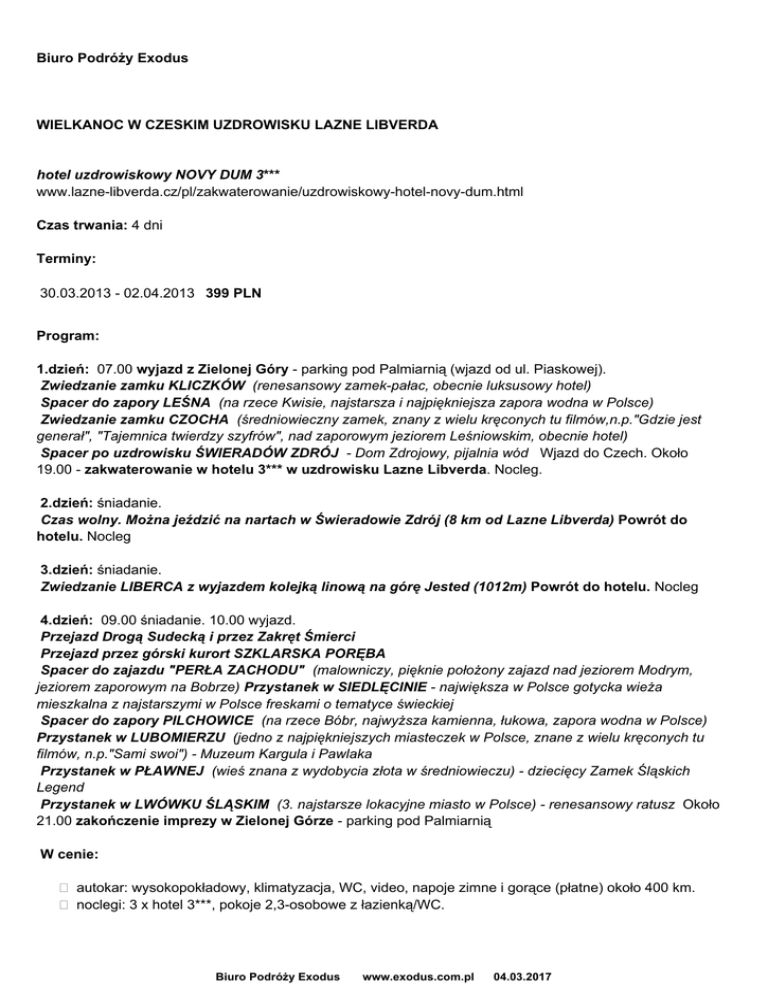 Biuro Podróży Exodus WIELKANOC W CZESKIM UZDROWISKU LAZNE LIBVERDA hotel uzdrowiskowy NOVY DUM 3*** www.lazne-libverda.cz/pl/zakwaterowanie/uzdrowiskowy-hotel-novy-dum.html Czas trwania: 4 dni Terminy: 30.03.2013 - 02.04.2013 399 PLN Program: 1.dzień: 07.00 wyjazd z Zielonej Góry - parking pod Palmiarnią (wjazd od ul. Piaskowej). Zwiedzanie zamku KLICZKÓW (renesansowy zamek-pałac, obecnie luksusowy hotel) Spacer do zapory LEŚNA (na rzece Kwisie, najstarsza i najpiękniejsza zapora wodna w Polsce) Zwiedzanie zamku CZOCHA (średniowieczny zamek, znany z wielu kręconych tu filmów,n.p."Gdzie jest generał", "Tajemnica twierdzy szyfrów", nad zaporowym jeziorem Leśniowskim, obecnie hotel) Spacer po uzdrowisku ŚWIERADÓW ZDRÓJ - Dom Zdrojowy, pijalnia wód Wjazd do Czech. Około 19.00 - zakwaterowanie w hotelu 3*** w uzdrowisku Lazne Libverda. Nocleg. 2.dzień: śniadanie. Czas wolny. Można jeździć na nartach w Świeradowie Zdrój (8 km od Lazne Libverda) Powrót do hotelu. Nocleg 3.dzień: śniadanie. Zwiedzanie LIBERCA z wyjazdem kolejką linową na górę Jested (1012m) Powrót do hotelu. Nocleg 4.dzień: 09.00 śniadanie. 10.00 wyjazd. Przejazd Drogą Sudecką i przez Zakręt Śmierci Przejazd przez górski kurort SZKLARSKA PORĘBA Spacer do zajazdu "PERŁA ZACHODU" (malowniczy, pięknie położony zajazd nad jeziorem Modrym, jeziorem zaporowym na Bobrze) Przystanek w SIEDLĘCINIE - największa w Polsce gotycka wieża mieszkalna z najstarszymi w Polsce freskami o tematyce świeckiej Spacer do zapory PILCHOWICE (na rzece Bóbr, najwyższa kamienna, łukowa, zapora wodna w Polsce) Przystanek w LUBOMIERZU (jedno z najpiękniejszych miasteczek w Polsce, znane z wielu kręconych tu filmów, n.p."Sami swoi") - Muzeum Kargula i Pawlaka Przystanek w PŁAWNEJ (wieś znana z wydobycia złota w średniowieczu) - dziecięcy Zamek Śląskich Legend Przystanek w LWÓWKU ŚLĄSKIM (3. najstarsze lokacyjne miasto w Polsce) - renesansowy ratusz Około 21.00 zakończenie imprezy w Zielonej Górze - parking pod Palmiarnią W cenie: autokar: wysokopokładowy, klimatyzacja, WC, video, napoje zimne i gorące (płatne) około 400 km. noclegi: 3 x hotel 3***, pokoje 2,3-osobowe z łazienką/WC. Biuro Podróży Exodus www.exodus.com.pl 04.03.2017 wyżywienie: 3 śniadania (bufet) zabiegi lecznicze: 3 x dziennie (2. i 3.dzień) konsultacja lekarska pilot BP EXODUS ubezpieczenie NW, KL, bagaż. podatek VAT Dodatkowe opłaty: 3 obiadokolacje (na życzenie) - 90 zł wejściówki - około 25 zł kolej linowa na dórę Jested, w obie strony - 120 Kc zniżka za własny dojazd - 50 zł/osobę Biuro Podróży Exodus www.exodus.com.pl 04.03.2017