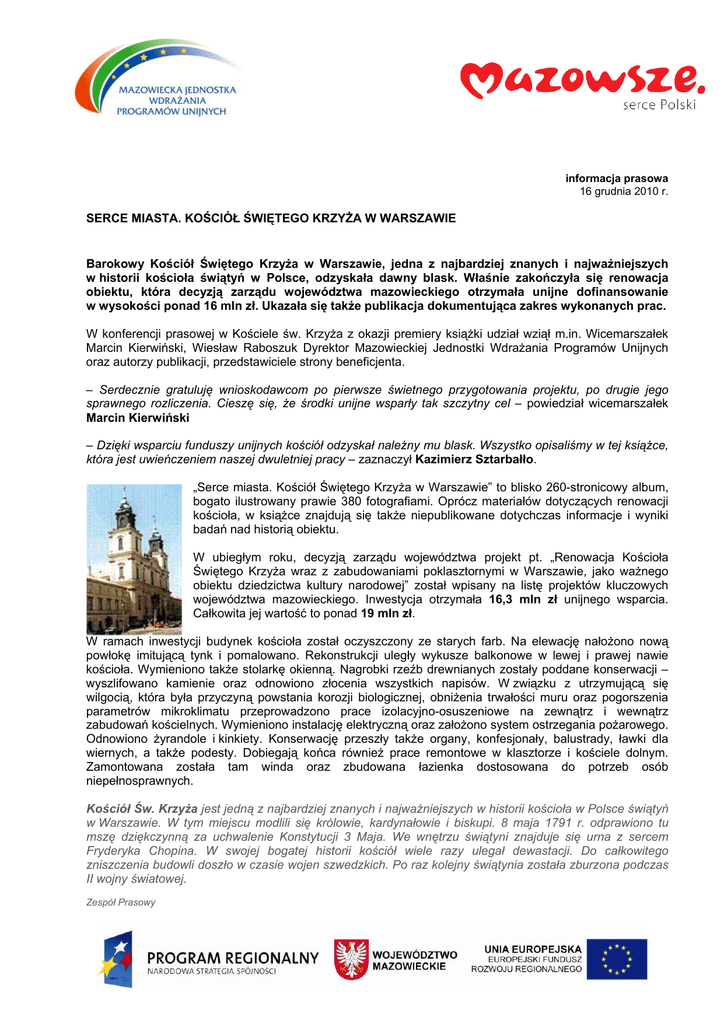 informacja prasowa 16 grudnia 2010 r. SERCE MIASTA. KOŚCIÓŁ ŚWIĘTEGO KRZYŻA W WARSZAWIE Barokowy Kościół Świętego Krzyża w Warszawie, jedna z najbardziej znanych i najważniejszych w historii kościoła świątyń w Polsce, odzyskała dawny blask. Właśnie zakończyła się renowacja obiektu, która decyzją zarządu województwa mazowieckiego otrzymała unijne dofinansowanie w wysokości ponad 16 mln zł. Ukazała się także publikacja dokumentująca zakres wykonanych prac. W konferencji prasowej w Kościele św. Krzyża z okazji premiery książki udział wziął m.in. Wicemarszałek Marcin Kierwiński, Wiesław Raboszuk Dyrektor Mazowieckiej Jednostki Wdrażania Programów Unijnych oraz autorzy publikacji, przedstawiciele strony beneficjenta. – Serdecznie gratuluję wnioskodawcom po pierwsze świetnego przygotowania projektu, po drugie jego sprawnego rozliczenia. Cieszę się, że środki unijne wsparły tak szczytny cel – powiedział wicemarszałek Marcin Kierwiński – Dzięki wsparciu funduszy unijnych kościół odzyskał należny mu blask. Wszystko opisaliśmy w tej książce, która jest uwieńczeniem naszej dwuletniej pracy – zaznaczył Kazimierz Sztarbałło. „Serce miasta. Kościół Świętego Krzyża w Warszawie” to blisko 260-stronicowy album, bogato ilustrowany prawie 380 fotografiami. Oprócz materiałów dotyczących renowacji kościoła, w książce znajdują się także niepublikowane dotychczas informacje i wyniki badań nad historią obiektu. W ubiegłym roku, decyzją zarządu województwa projekt pt. „Renowacja Kościoła Świętego Krzyża wraz z zabudowaniami poklasztornymi w Warszawie, jako ważnego obiektu dziedzictwa kultury narodowej” został wpisany na listę projektów kluczowych województwa mazowieckiego. Inwestycja otrzymała 16,3 mln zł unijnego wsparcia. Całkowita jej wartość to ponad 19 mln zł. W ramach inwestycji budynek kościoła został oczyszczony ze starych farb. Na elewację nałożono nową powłokę imitującą tynk i pomalowano. Rekonstrukcji uległy wykusze balkonowe w lewej i prawej nawie kościoła. Wymieniono także stolarkę okienną. Nagrobki rzeźb drewnianych zostały poddane konserwacji – wyszlifowano kamienie oraz odnowiono złocenia wszystkich napisów. W związku z utrzymującą się wilgocią, która była przyczyną powstania korozji biologicznej, obniżenia trwałości muru oraz pogorszenia parametrów mikroklimatu przeprowadzono prace izolacyjno-osuszeniowe na zewnątrz i wewnątrz zabudowań kościelnych. Wymieniono instalację elektryczną oraz założono system ostrzegania pożarowego. Odnowiono żyrandole i kinkiety. Konserwację przeszły także organy, konfesjonały, balustrady, ławki dla wiernych, a także podesty. Dobiegają końca również prace remontowe w klasztorze i kościele dolnym. Zamontowana została tam winda oraz zbudowana łazienka dostosowana do potrzeb osób niepełnosprawnych. Kościół Św. Krzyża jest jedną z najbardziej znanych i najważniejszych w historii kościoła w Polsce świątyń w Warszawie. W tym miejscu modlili się królowie, kardynałowie i biskupi. 8 maja 1791 r. odprawiono tu mszę dziękczynną za uchwalenie Konstytucji 3 Maja. We wnętrzu świątyni znajduje się urna z sercem Fryderyka Chopina. W swojej bogatej historii kościół wiele razy ulegał dewastacji. Do całkowitego zniszczenia budowli doszło w czasie wojen szwedzkich. Po raz kolejny świątynia została zburzona podczas II wojny światowej. Zespół Prasowy Mazowiecka Jednostka Wdrażania Programów Unijnych tel. 022 542 22 23, kom. 506 047 917 e-mail: [email protected] Biuro Prasowe Urząd Marszałkowski Województwa Mazowieckiego tel. 22 59 07 602, kom. 510 591 974 e-mail: [email protected] SERCE MIASTA. KOŚCIÓŁ ŚWIĘTEGO KRZYŻA W WARSZAWIE Tom studiów pod redakcją Kazimierza Sztarbałło i Michała Wardzyńskiego, Warszawa 2010, ss. 256, 365 il. Projekt i opracowanie graficzne: Lech Majewski i Eugeniusz Łukasiak Wydawca: Mazowiecka Jednostka Wdrażania Funduszy Unijnych Prezentowana książka, poświęcona zabytkowej Bazylice Świętokrzyskiej Księży Misjonarzy w Warszawie – znanemu na całym świecie miejscu złożenia serca Fryderyka Chopina – ważnego ośrodka życia religijnego i obywatelskiego historycznego centrum i zarazem symbolu Warszawy – to pierwszy w Polsce i wśród varsavianów przykład twórczego połączenia zbiorowego albumu fotografii artystycznej i dokumentalnej, uzupełnionego o popularyzatorskie eseje, z częścią o charakterze naukowym, na którą składa się trzynaście nowatorskich artykułów poświęconych samej świątyni i jej cennemu zabytkowemu wyposażeniu. Dzięki środkom finansowym pozyskanym z Mazowieckiej Jednostki Wdrażania Funduszy Unijnych w r. 2010 – roku Jubileuszu 200-lecia urodzin Fryderyka Chopina – zespół kilkudziesięciu konserwatorów i wykonawców dokonał przy współudziale grona historyków sztuki niemającej w Warszawie precedensu wieloetapowej kompleksowej restauracji wnętrza oraz części elewacji zewnętrznych kościoła świętokrzyskiego. Wykonano również szereg prac prowadzących do kompletnej rekonstrukcji barokowego wystroju ołtarzowego, zniszczonego w 1944 i 1945 r., w tym najcenniejszego jego elementu – monumentalnego ołtarza transeptowego Trójcy Świętej i Najświętszego Sakramentu – Ołtarza Ojczyzny. Szczegółowe omówienie wszystkich tych wysiłków i prac znalazło się w wielu miejscach tej książki. Wiedza chopinistów, varsavianistów i badaczy sztuki połączona z niezwykle bogatym przekazem ilustracyjnym zawartym w części albumowej i naukowej zyskała odpowiednią oprawę graficzną dzięki nowatorskiej koncepcji projektu graficznego tomu autorstwa prof. Lecha Majewskiego i Eugeniusza Łukasiaka z warszawskiej Akademii Sztuk Pięknych. Książka ta zatem to nie tylko ważna pozycja varsavianistyczna i dowód, wręcz probierz współczesnych możliwości polskiego 