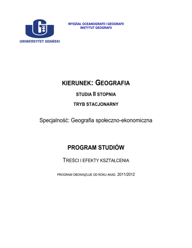 WYDZIAŁ OCEANOGRAFII I GEOGRAFII INSTYTUT GEOGRAFII KIERUNEK: GEOGRAFIA STUDIA II STOPNIA TRYB STACJONARNY Specjalność: Geografia społeczno-ekonomiczna PROGRAM STUDIÓW TREŚCI I EFEKTY KSZTAŁCENIA PROGRAM OBOWIĄZUJE OD ROKU AKAD. 2011/2012 Geografia − studia stacjonarne II stopnia Geografia społeczno-ekonomiczna Przedmioty ogólnokierunkowe − podstawowe i kierunkowe Nazwa przedmiotu: Metodologia badań geograficznych Nazwa jednostki prowadzącej kierunek: Wydział Oceanografii i Geografii Kod ECTS: Nazwa kierunku: Geografia Nazwa specjalności: Geografia społeczno-ekonomiczna; Geomorfologia z kształtowaniem i ochroną środowiska; Hydrologia i ochrona wód; Meteorologia i klimatologia Nazwiska osób prowadzących: prof. UG dr hab. Andrzej Rachocki, dr Lucyna Przybylska Liczba godzin zajęć: 30, w tym: wykładów − 30 godzin Liczba punktów ECTS: 4 Rodzaj studiów: stacjonarne, II stopnia Rok i semestr studiów: I, 1 Status przedmiotu: obligatoryjny Język wykładowy: polski Metody dydaktyczne: Formy i warunki zaliczania przedmiotu: wykład z wykorzystaniem prezentacji Wykład – egzamin testowy: pytania otwarte i zamknięte multimedialnej; dyskusja moderowana Określenie wymagań wstępnych Wiedza z zakresu: podstawowych pojęć filozofii Umiejętności: wykazuje umiejętność krytycznej analizy i selekcji informacji, zwłaszcza ze źródeł elektronicznych; ZałoŜenia i cele przedmiotu: Poznanie i zrozumienie psychologicznych i filozoficznych podstaw gromadzenia i przetwarzania informacji fizycznogeograficznych i społecznogeograficznych przez człowieka. OdróŜnienie metodologii nauk geograficznych (filozofia nauki) od metod gromadzenia informacji stosowanych w poszczególnych naukach geograficznych (praktyka badawcza) oraz procedur ich analizy (matematyzacja geografii) i weryfikacji poprawności interpretacji i wnioskowania (metody statystyczne).wiadomość wagi metod badawczych w pracy naukowej, znajomość literatury z zakresu metod badawczych w geografii, wiedza na temat metod i źródeł informacji geograficznej. Treści programowe: Nauka jako zjawisko i jej znaczenie w Ŝyciu społeczeństw. Wieloznaczność pojęcia „nauka”. Filozofia nauki a metodologia. Rozwój nauki według Poppera i Kuhna, wybrane elementy ogólnej metodologii nauk, rozwój geografii a metody badań, źródła informacji i główne uwarunkowania metod badań w geografii, cechy stylu naukowego. Indukcja i dedukcja w nauce. Filozofia a nauki szczegółowe. Nauki formalne i realne. Nauki humanistyczne i przyrodnicze. Status metodologiczny i poznawczy hipotez i teorii naukowych. Postęp w nauce i jej rozwój, granice rozwoju. Umiejętności i kompetencje: Wiedza z zakresu metod geograficznych, umiejętność pisania w stylu naukowym, umiejętność tworzenia konstrukcji pisemnej pracy naukowej, umiejętność analizy zjawisk i procesów czasoprzestrzennych, w tym interakcji człowiek - środowisko oraz wiedza z etyki naukowej. Wykaz literatury Podstawowej: − Chojnicki Z., 2000, Filozofia nauki. Orientacje, koncepcje, krytyki, Bogucki Wydawnictwo Naukowe, Poznań. − Heller, M., 2009, Filozofia nauki. Wyd. Petrus. Kraków − Przybyłowski J., 1995, Logika z ogólną metodologią nauk. Podręcznik dla humanistów, Wyd. UG, Gdańsk − Runge J., 2006, Metody badań w geografii społeczno-ekonomicznej – elementy metodologii, wybrane narzędzia badawcze, Uniwersytet Śląski, Katowice. Uzupełniającej: − Chojnicki Z., 1984, Dylematy metodologiczne geografii, Przegląd Geograficzny, T. LXI, Z. 3/4, s. 3–18. − Chojnicki, Z., 1999, Podstawy metodologiczne i teoretyczne w geografii. Wyd. Nauk. Bogucki, Poznań. − Przybylska R, 2003,Wstęp do nauki o języku polskim. Podręcznik dla szkół wyŜszych, Wyd. Literackie, Kraków. 2 Geografia − studia stacjonarne II stopnia Geografia społeczno-ekonomiczna Nazwa przedmiotu: Geografia regionalna − Pomorze Nazwa jednostki prowadzącej kierunek: Wydział Oceanografii i Geografii Kod ECTS: Nazwa kierunku: Geografia Nazwa specjalności: Geografia społeczno-ekonomiczna; Geomorfologia z kształtowaniem i ochroną środowiska; Hydrologia i ochrona wód; Meteorologia i klimatologia Nazwisko osoby prowadzącej: dr Lucyna Przybylska Liczba godzin zajęć: 15, w tym: wykładów − 15 godzin Liczba punktów ECTS: 2 Rodzaj studiów: stacjonarne, II stopnia Rok i semestr studiów: I, 1 Status przedmiotu: obligatoryjny Język wykładowy: polski Metody dydaktyczne: Formy i warunki zaliczania przedmiotu: wykład z wykorzystaniem prezentacji zaliczenie – test z pytaniami otwartymi i zamkniętymi multimedialnej; dyskusja moderowana; metoda przypadków Określenie wymagań wstępnych Wiedza z zakresu: interakcyjnych powiązań między poszczególnymi komponentami środowiska geograficznego oraz wpływu zróŜnicowania komponentów środowiska na wykształcenie struktury społecznogospodarczej; przestrzennego zróŜnicowania struktury środowiska przyrodniczego oraz struktury społecznogospodarczej Polski. Umiejętności: synteza informacji pochodzących z wielu źródeł; identyfikacji interakcji w systemie przyroda – człowiek. ZałoŜenia i cele przedmiotu: Poznanie struktury środowiska geograficznego Pomorza; umiejętność identyfikowania relacji między człowiekiem a środowiskiem oraz wskazywania obszarów problemowych na Pomorzu; Treści programowe: Fizycznogeograficzne i społeczno-ekonomiczne granice Pomorza i ich zmienność czasowa; podział na jednostki fizycznogeograficzne; charakterystyka środowiska przyrodniczego (budowa i rzeźba terenu, surowce mineralne, stosunki wodne, świat roślinny i zwierzęcy); historyczne uwarunkowania rozwoju społecznoekonomicznego; podział administracyjny; struktura i rozmieszczenie ludności; przemiany narodowościowe i językowe; struktura wyznaniowa; mniejszości narodowe; struktura i przekształcenia systemu osadniczego; rozwój infrastruktury transportu; obszary problemowe z punktu widzenia re