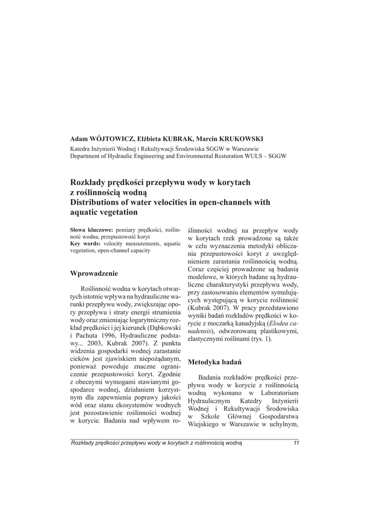Adam WÓJTOWICZ, Elżbieta KUBRAK, Marcin KRUKOWSKI Katedra Inżynierii Wodnej i Rekultywacji Środowiska SGGW w Warszawie Department of Hydraulic Engineering and Environmental Restoration WULS – SGGW Rozkłady prędkości przepływu wody w korytach z roślinnością wodną Distributions of water velocities in open-channels with aquatic vegetation Słowa kluczowe: pomiary prędkości, roślinność wodna, przepustowość koryt Key words: velocity measurements, aquatic vegetation, open-channel capacity Wprowadzenie Roślinność wodna w korytach otwartych istotnie wpływa na hydrauliczne warunki przepływu wody, zwiększając opory przepływu i straty energii strumienia wody oraz zmieniając logarytmiczny rozkład prędkości i jej kierunek (Dąbkowski i Pachuta 1996, Hydrauliczne podstawy... 2003, Kubrak 2007). Z punktu widzenia gospodarki wodnej zarastanie cieków jest zjawiskiem niepożądanym, ponieważ powoduje znaczne ograniczenie przepustowości koryt. Zgodnie z obecnymi wymogami stawianymi gospodarce wodnej, działaniem korzystnym dla zapewnienia poprawy jakości wód oraz stanu ekosystemów wodnych jest pozostawienie roślinności wodnej w korycie. Badania nad wpływem ro- ślinności wodnej na przepływ wody w korytach rzek prowadzone są także w celu wyznaczenia metodyki obliczania przepustowości koryt z uwzględnieniem zarastania roślinnością wodną. Coraz częściej prowadzone są badania modelowe, w których badane są hydrauliczne charakterystyki przepływu wody, przy zastosowaniu elementów symulujących występującą w korycie roślinność (Kubrak 2007). W pracy przedstawiono wyniki badań rozkładów prędkości w korycie z moczarką kanadyjską (Elodea canadensis), odwzorowaną plastikowymi, elastycznymi roślinami (rys. 1). Metodyka badań Badania rozkładów prędkości przepływu wody w korycie z roślinnością wodną wykonano w Laboratorium Hydraulicznym Katedry Inżynierii Wodnej i Rekultywacji Środowiska w Szkole Głównej Gospodarstwa Wiejskiego w Warszawie w uchylnym, Rozkłady prędkości przepływu wody w korytach z roślinnością wodną 11 RYSUNEK 1. Moczarka kanadyjska (Elodea canadensis) FIGURE 1. Plant of Elodea canadensis prostoliniowym korycie długości 16 m, szerokości 0,58 m oraz wysokości 0,60 m (rys. 2). Roślinność wodną w korycie stanowiły rośliny wykonane z elastycznego PCV, wysokości 0,11 m, geometrycznie odwzorowujące rośliny moczarki kanadyjskiej (rys. 3), które zamocowano do dna koryta w równych odstępach, w węzłach naniesionej kwadratowej siatki. Pomiary poziomych składowych prędkości wykonywane były za pomocą elektrosondy PEMS z czujnikiem w kształcie elipsoidy o wymiarach 0,011 × 0,033 m, zainstalowaną na wózku, połączoną z komputerowym rejestratorem danych. Prędkości mierzono w trzech pionach hydrometrycznych umieszczonych w osi koryta oraz symetrycznie po obu stronach, w odległości 0,045 m od osi (rys. 4). W każdym z pionów hydrometrycznych prędkości rejestrowano w punktach położonych od wysokości 0,0024 m nad dnem aż do wysokości położonej oko- RYSUNEK 2. Schemat koryta laboratoryjnego (Kubrak 2007) FIGURE 2. The layout of the experimental flume (Kubrak 2007) 12 A. Wójtowicz, E. Kubrak, M. Krukowski RYSUNEK 3. Roślinność wodna zastosowana w badaniach (fot. M. Krukowski) FIGURE 3. Aquatic plants used in laboratory flume experiment (fot. M. Krukowski) RYSUNEK 4. Położenie elektrosondy PEMS w planie koryta FIGURE General view of the PEMS probe position ło 0,005 m poniżej zwierciadła wody – co 0,01 m. Wartości dwóch poziomych składowych prędkości przepływu w punktach pomiarowych rejestrowano co 0,1 s, przez 20 s, w każdym punkcie pomiarowym. Pomiary prędkości przepływu wykonywano w warunkach ruchu ustalonego jednostajnego, w którym głębokości i natężenie przepływu wody są niezmienne w czasie i na długości koryta. Sprawdzenia równoległego względem dna położenia zwierciadła wody dokonywano za pomocą dwóch wodowskazów szpilkowych z dokładnością 0,0001 m (rys. 5). Wyniki badań i ich analiza Pomiary prędkości przepływu w korycie z udziałem roślinności wodnej przeprowadzono przy zmiennych głębokościach przepływu w trzech wariantach (Wójtowicz 2009): y wariant 1.1 – rośliny moczarki kanadyjskiej rozmieszczone na dnie koryta w węzłach kwadratowej siatki o wymiarach 0,045 × 0,045 m, przy spadku dna koryta i = 0,0087, y wariant 1.2 – rośliny moczarki kanadyjskiej rozmieszczone na dnie koryta, podobnie jak w wariancie Rozkłady prędkości przepływu wody w korytach z roślinnością wodną 13 RYSUNEK 5. Schemat stanowiska badawczego FIGURE 5. Sheme of the laboratory setup 1.1, lecz przy spadku dna koryta i = 0,0174, y wariant 2.1 – rośliny moczarki kanadyjskiej rozmieszczone na dnie koryta w węzłach kwadratowej siatki o wymiarach 0,090 × 0,090 m, przy spadku dna koryta i = 0,0087. Zestawienie doświadczeń przeprowadzonych w poszczególnych wariantach zamieszczono w tabeli 1. W wariantach 1.1 i 1.2 umieszczono na dnie prostokątnego koryta łącznie 884 roślin moczarki kanadyjskiej (507 elementów na 1 m2), a w wariancie 2.1 – 238 roślin (140 elementów na 1 m2). Dla pomierzonych za pomocą elektrosondy PEMS chwilowych wartości składowych prędkości przepływu wody obliczono średnie wartości prędkości w każdym punkcie pomiarowym. Na ich podstawie sporządzono rozkłady prędkości przepływu wody w funkcji głębokości w każdym z pionów hydrometrycznych pokazane na rysunkach 6, 7 i 8. Sporządzono także krzywe przepustowości koryta dla każdego z wariantów badań (rys. 9). Na podstawie wyników pomiarów stwierdzono, że w wariancie 1.1 badań rozkład prędkości na głębokości prze14 pływu w korycie z moczarką kanadyjską posiada wyraźny podział na strefę stałych wartości prędkości w obszarze zajmowanym przez roślinność oraz strefę prędkości ponad roślinnością (rys. 6). Obszar stałych pr