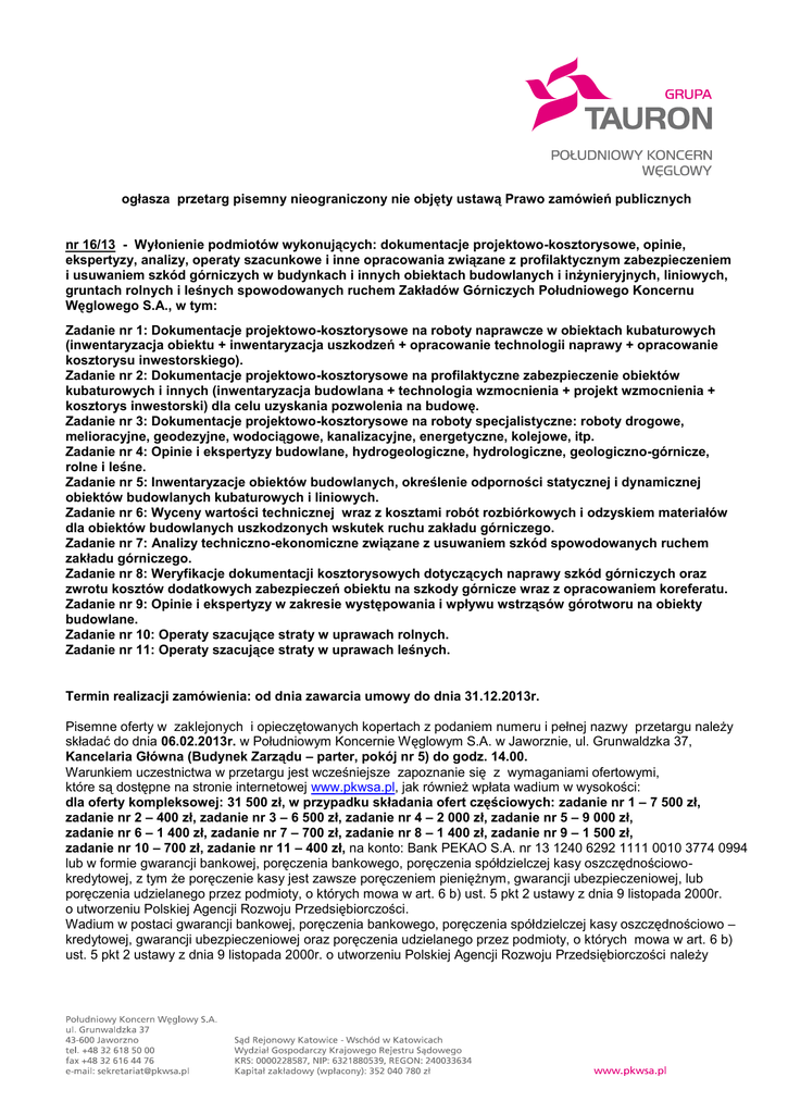 ogłasza przetarg pisemny nieograniczony nie objęty ustawą Prawo zamówień publicznych nr 16/13 - Wyłonienie podmiotów wykonujących: dokumentacje projektowo-kosztorysowe, opinie, ekspertyzy, analizy, operaty szacunkowe i inne opracowania związane z profilaktycznym zabezpieczeniem i usuwaniem szkód górniczych w budynkach i innych obiektach budowlanych i inżynieryjnych, liniowych, gruntach rolnych i leśnych spowodowanych ruchem Zakładów Górniczych Południowego Koncernu Węglowego S.A., w tym: Zadanie nr 1: Dokumentacje projektowo-kosztorysowe na roboty naprawcze w obiektach kubaturowych (inwentaryzacja obiektu + inwentaryzacja uszkodzeń + opracowanie technologii naprawy + opracowanie kosztorysu inwestorskiego). Zadanie nr 2: Dokumentacje projektowo-kosztorysowe na profilaktyczne zabezpieczenie obiektów kubaturowych i innych (inwentaryzacja budowlana + technologia wzmocnienia + projekt wzmocnienia + kosztorys inwestorski) dla celu uzyskania pozwolenia na budowę. Zadanie nr 3: Dokumentacje projektowo-kosztorysowe na roboty specjalistyczne: roboty drogowe, melioracyjne, geodezyjne, wodociągowe, kanalizacyjne, energetyczne, kolejowe, itp. Zadanie nr 4: Opinie i ekspertyzy budowlane, hydrogeologiczne, hydrologiczne, geologiczno-górnicze, rolne i leśne. Zadanie nr 5: Inwentaryzacje obiektów budowlanych, określenie odporności statycznej i dynamicznej obiektów budowlanych kubaturowych i liniowych. Zadanie nr 6: Wyceny wartości technicznej wraz z kosztami robót rozbiórkowych i odzyskiem materiałów dla obiektów budowlanych uszkodzonych wskutek ruchu zakładu górniczego. Zadanie nr 7: Analizy techniczno-ekonomiczne związane z usuwaniem szkód spowodowanych ruchem zakładu górniczego. Zadanie nr 8: Weryfikacje dokumentacji kosztorysowych dotyczących naprawy szkód górniczych oraz zwrotu kosztów dodatkowych zabezpieczeń obiektu na szkody górnicze wraz z opracowaniem koreferatu. Zadanie nr 9: Opinie i ekspertyzy w zakresie występowania i wpływu wstrząsów górotworu na obiekty budowlane. Zadanie nr 10: Operaty szacujące straty w uprawach rolnych. Zadanie nr 11: Operaty szacujące straty w uprawach leśnych. Termin realizacji zamówienia: od dnia zawarcia umowy do dnia 31.12.2013r. Pisemne oferty w zaklejonych i opieczętowanych kopertach z podaniem numeru i pełnej nazwy przetargu należy składać do dnia 06.02.2013r. w Południowym Koncernie Węglowym S.A. w Jaworznie, ul. Grunwaldzka 37, Kancelaria Główna (Budynek Zarządu – parter, pokój nr 5) do godz. 14.00. Warunkiem uczestnictwa w przetargu jest wcześniejsze zapoznanie się z wymaganiami ofertowymi, które są dostępne na stronie internetowej www.pkwsa.pl, jak również wpłata wadium w wysokości: dla oferty kompleksowej: 31 500 zł, w przypadku składania ofert częściowych: zadanie nr 1 – 7 500 zł, zadanie nr 2 – 400 zł, zadanie nr 3 – 6 500 zł, zadanie nr 4 – 2 000 zł, zadanie nr 5 – 9 000 zł, zadanie nr 6 – 1 400 zł, zadanie nr 7 – 700 zł, zadanie nr 8 – 1 400 zł, zadanie nr 9 – 1 500 zł, zadanie nr 10 – 700 zł, zadanie nr 11 – 400 zł, na konto: Bank PEKAO S.A. nr 13 1240 6292 1111 0010 3774 0994 lub w formie gwarancji bankowej, poręczenia bankowego, poręczenia spółdzielczej kasy oszczędnościowokredytowej, z tym że poręczenie kasy jest zawsze poręczeniem pieniężnym, gwarancji ubezpieczeniowej, lub poręczenia udzielanego przez podmioty, o których mowa w art. 6 b) ust. 5 pkt 2 ustawy z dnia 9 listopada 2000r. o utworzeniu Polskiej Agencji Rozwoju Przedsiębiorczości. Wadium w postaci gwarancji bankowej, poręczenia bankowego, poręczenia spółdzielczej kasy oszczędnościowo – kredytowej, gwarancji ubezpieczeniowej oraz poręczenia udzielanego przez podmioty, o których mowa w art. 6 b) ust. 5 pkt 2 ustawy z dnia 9 listopada 2000r. o utworzeniu Polskiej Agencji Rozwoju Przedsiębiorczości należy Strona 2 z 2 złożyć w oryginale w tej samej kopercie, która zawiera ofertę, a kserokopię dokumentu należy załączyć do oferty (jako integralną część oferty), przed upływem terminu składania ofert określonego powyżej. Ponadto dopuszczalne jest zaliczenie (przeksięgowanie) na poczet wadium, wymagalnych na dzień wniesienia wadium, zobowiązań Południowego Koncernu Węglowego SA wobec oferenta, na podstawie oświadczenia oferenta o wyborze tej formy wniesienia wadium. W przypadku pobrania wymagań ofertowych w wersji papierowej w Wydziale Umów, Budynek Centrali Telefonicznej – pok. nr 12, wymagany jest wykup wymagań ofertowych w kwocie 100 zł, płatne w Kasie Głównej Południowego Koncernu Węglowego S.A. czynnej codziennie od 11.00-14.00; w środę od 7.30-10.00 i 12.00-14.00, lub przelewem na konto j.w. Komisyjne otwarcie ofert nastąpi w dniu 07.02.2013r. w Sali Narad - I piętro, Budynek Zarządu o godz. 10.20. Informacji udziela w sprawach: proceduralnych: Wydział Umów - tel. (32) 618 56 80, fax. (32) 618 50 78. technicznych: Zakład Górniczy Janina - Dział Mierniczo-Geologiczny – Oddział Szkód Górniczych mgr inż. Mirosława Engelhardt - tel. 32 627 05 38 Zakład Górniczy Sobieski - Dział Mierniczo-Geologiczny – Oddział Szkód Górniczych mgr inż. Krzysztof Czaicki - tel. 32 618 53 61.