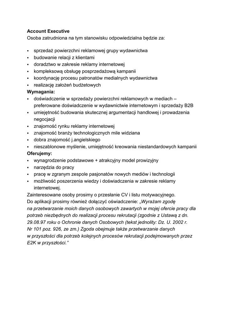 Account Executive Osoba zatrudniona na tym stanowisku odpowiedzialna będzie za: sprzedaż powierzchni reklamowej grupy wydawnictwa budowanie relacji z klientami doradztwo w zakresie reklamy internetowej kompleksową obsługę posprzedażową kampanii koordynację procesu patronatów medialnych wydawnictwa realizację założeń budżetowych Wymagania: doświadczenie w sprzedaży powierzchni reklamowych w mediach – preferowane doświadczenie w wydawnictwie internetowym i sprzedaży B2B umiejętność budowania skutecznej argumentacji handlowej i prowadzenia negocjacji znajomość rynku reklamy internetowej znajomość branży technologicznych mile widziana dobra znajomość j.angielskiego nieszablonowe myślenie, umiejętność kreowania niestandardowych kampanii Oferujemy: wynagrodzenie podstawowe + atrakcyjny model prowizyjny narzędzia do pracy pracę w zgranym zespole pasjonatów nowych mediów i technologii możliwość poszerzenia wiedzy i doświadczenia w zakresie reklamy internetowej. Zainteresowane osoby prosimy o przesłanie CV i listu motywacyjnego. Do aplikacji prosimy również dołączyć oświadczenie: „Wyrażam zgodę na przetwarzanie moich danych osobowych zawartych w mojej ofercie pracy dla potrzeb niezbędnych do realizacji procesu rekrutacji (zgodnie z Ustawą z dn. 29.08.97 roku o Ochronie danych Osobowych (tekst jednolity: Dz. U. 2002 r. Nr 101 poz. 926, ze zm.) Zgoda obejmuje także przetwarzanie danych w przyszłości dla potrzeb kolejnych procesów rekrutacji podejmowanych przez E2K w przyszłości.”