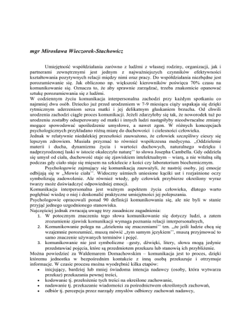 mgr Mirosława Wieczorek-Stachowicz Umiejętność współdziałania zarówno z ludźmi z własnej rodziny, organizacji, jak i partnerami zewnętrznymi jest jednym z najważniejszych czynników efektywności kształtowania pozytywnych relacji między nimi oraz pracy. Do współdziałania niezbędne jest porozumiewanie się. Jak obliczono np. większość kierowników poświęca 70% czasu na komunikowanie się. Oznacza to, że aby sprawnie zarządzać, trzeba znakomicie opanować sztukę porozumiewania się z ludźmi. W codziennym życiu komunikacja interpersonalna zachodzi przy każdym spotkaniu co najmniej dwu osób. Dziecko już przed urodzeniem w 7-9 miesiącu ciąży uspakaja się dzięki rytmicznym uderzeniom serca matki i jej delikatnym głaskaniem brzucha. Od chwili urodzenia zachodzi ciągle proces komunikacji. Jeżeli zdarzyłoby się tak, że noworodek tuż po urodzeniu zostałby odseperowany od matki i innych ludzi nastąpiłyby nieodwracalne zmiany mogące spowodować upośledzenie umysłowe, a nawet zgon. W różnych koncepcjach psychologicznych przykładano różną miarę do duchowości i cielesności człowieka. Jednak w relatywnie niedalekiej przeszłości zauważono, że człowiek szczęśliwy cieszy się lepszym zdrowiem. Musiała przyznać to również współczesna medycyna. ,,Oddzielenie materii i ducha, dynamizmu życia i wartości duchowych, naturalnego wdzięku i nadprzyrodzonej łaski w istocie okaleczyło naturę’’ to słowa Josepha Cambella. Gdy oddziela się umysł od ciała, duchowość staje się zjawiskiem intelektualnym – wiarą, a nie witalną siłą podczas gdy ciało staje się mięsem na szkielecie z kości czy laboratorium biochemicznym. Psychologowie zajmujący się komunikacją zauważyli, że nastrój osoby, jej emocje odbijają się w ,,Mowie ciała’’. Widoczny uśmiech uniesione kąciki ust i rozjaśnione oczy symbolizują zadowolenie. Ale również wtedy, gdy człowiek przybierze określony wyraz twarzy może doświadczyć odpowiedniej emocji. Komunikacja interpersonalna jest ważnym aspektem życia człowieka, dlatego warto pogłębiać wiedzę o niej i doskonalić praktyczne umiejętności jej polepszania. Psychologowie opracowali ponad 90 definicji komunikowania się, ale nie byli w stanie przyjąć jednego uzgodnionego stanowiska. Najczęściej jednak zwracają uwagę trzy zasadnicze zagadnienia: 1. W potocznym znaczeniu tego słowa komunikowanie się dotyczy ludzi, a zatem zrozumienie zjawisk komunikacji wymaga poznania relacji interpersonalnych, 2. Komunikowanie polega na ,,dzieleniu się znaczeniami’’ tzn. ,,że jeśli ludzie chcą się wzajemnie porozumieć, muszą mówić ,,tym samym językiem’’, muszą przyjmować to samo znaczenie używanych terminów i pojęć. 3. komunikowanie nie jest symboliczne –gesty, dźwięki, litery, słowa mogą jedynie przedstawiać pojęcia, które są przedmiotem przekazu lub stanowią ich przybliżenie. Można powiedzieć za Waldemarem Domachowskim – komunikacja jest to proces, dzięki któremu jednostka w bezpośrednim kontakcie z inną osobą przekazuje i otrzymuje informacje. W czasie procesu można wyodrębnić kilka etapów: inicjujący, bardziej lub mniej świadoma intencja nadawcy (osoby, która wytwarza przekaz) przekazania pewnej treści, kodowanie tj. przełożenie tych treści na określone zachowanie, nadawanie tj. przekazanie wiadomości za pośrednictwem określonych zachowań, odbiór tj. percepcja przez narządy zmysłów odbiorcy zachowań nadawcy, odkodowywanie tj. przełożenie odebranych sygnałów na wiadomość, interpretacja wiadomości tj. przypisanie jej przez odbiorcę znaczenia w kontekście jego ogólnej wiedzy o świecie. Mówiąc o komunikowaniu się, najczęściej mamy na myśli komunikację werbalną czyli porozumiewanie się za pomocą słów, tymczasem w zwykłej rozmowie ponad 65% informacji przekazujemy poprzez gesty, mimikę, spojrzenie, intonację. Jest to komunikacja niewerbalna. Dobra komunikacja występuje wówczas, gdy przekazywanie wiadomości jest dwustronne. Nadawca informacji powinien zatem dawać odbiorcy okazję do sprzężenia zwrotnego tj. do zadawania pytań i formułowania komentarzy, w celu wyjaśniania istoty przekazywanej wiadomości. Jednocześnie powinien uwzględniać właściwości osoby lub osób, do których się zwraca. Bardzo ważne jest uzyskanie z ich strony odpowiedniego odzewu lub reakcji świadczącej o tym, że nasz przekaz został zrozumiany i zaakceptowany. Można wyróżnić pięć składników skutecznej komunikacji wzajemnej: 1. Jasność celu. 2. Jasność wyrażania się. 3. Umiejętność słuchania. 4. Zwalczania złości (własnej i innych). 5. Zyskiwanie zaufania. Przed podjęciem przekazywania informacji powinniśmy wiedzieć jakie zachowania czy postawy chcemy spowodować. Mogą one dotyczyć spowodowania określonych zachowań, przekazywania wiedzy, umiejętności, zmiany postaw lub doświadczenia przyjemności z samego procesu komunikowania się. Intencje dla których podejmowana jest komunikacja mogą być bardzo różne. Człowiek może podjąć rozmowy aby zaspokoić własne potrzeby. Dzieje się tak, gdy nadawca pragnie coś osiągnąć i jest przekonany, iż rozmowa pomoże mu to uzyskać. Albo gdy mimiką pantomimiką wyraża potrzebę. Nadawca może podjąć komunikację, aby jego partner odniósł określone korzyści jeśli poprzednio sygnalizował on własne potrzeby. Człowiek może inicjować kontakt, aby zapoznać inną osobę z własnymi odczuciami, poglądami, przekonaniami. W tym przypadku nadawca przekazując partnerowi wiadomości nie zamierza wywrzeć żadnego wpływu na jego postępowanie. Nadawca może podjąć rozmowę o pewnych sprawach przede wszystkim dla rozładowania napięcia jakie się z nim wiąże. Jest to więc taka sytuacja, gdy człowiek chce wygadać się czy wyżalić co pomaga w uwolnieniu się od złości, niepokoju, poczucia skrzywdzenia. Intencja nadawcy wiąz