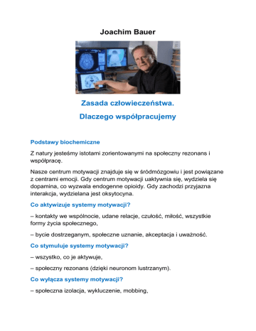 Joachim Bauer Zasada człowieczeństwa. Dlaczego współpracujemy Podstawy biochemiczne Z natury jesteśmy istotami zorientowanymi na społeczny rezonans i współpracę. Nasze centrum motywacji znajduje się w śródmózgowiu i jest powiązane z centrami emocji. Gdy centrum motywacji uaktywnia się, wydziela się dopamina, co wyzwala endogenne opioidy. Gdy zachodzi przyjazna interakcja, wydzielana jest oksytocyna. Co aktywizuje systemy motywacji? – kontakty we wspólnocie, udane relacje, czułość, miłość, wszystkie formy życia społecznego, – bycie dostrzeganym, społeczne uznanie, akceptacja i uważność. Co stymuluje systemy motywacji? – wszystko, co je aktywuje, – społeczny rezonans (dzięki neuronom lustrzanym). Co wyłącza systemy motywacji? – społeczna izolacja, wykluczenie, mobbing, – nieudane relacje powodują strach, ból, biologiczne reakcje wywołane stresem i agresję. Podstawą udanych relacji są: – dostrzeganie innych i bycie dostrzeganym, – wspólna uważność, – emocjonalny rezonans, – wspólne działania, – wzajemne zrozumienie motywów i zamiarów, – wzajemność, komplementarność.