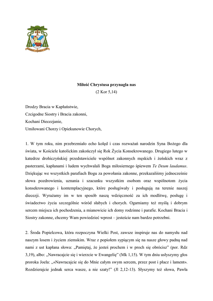 Miłość Chrystusa przynagla nas (2 Kor 5,14) Drodzy Bracia w Kapłaństwie, Czcigodne Siostry i Bracia zakonni, Kochani Diecezjanie, Umiłowani Chorzy i Opiekunowie Chorych, 1. W tym roku, nim przebrzmiało echo kolęd i czas rozważań narodzin Syna Bożego dla świata, w Kościele katolickim zakończył się Rok Życia Konsekrowanego. Drugiego lutego w katedrze drohiczyńskiej przedstawiciele wspólnot zakonnych męskich i żeńskich wraz z pasterzami, kapłanami i ludem wychwalali Boga miłosiernego śpiewem Te Deum laudamus. Dziękując we wszystkich parafiach Bogu za powołania zakonne, przekazaliśmy jednocześnie słowa pozdrowienia, uznania i szacunku wszystkim osobom oraz wspólnotom życia konsekrowanego i kontemplacyjnego, które posługiwały i posługują na terenie naszej diecezji. Wyrażamy im w ten sposób naszą wdzięczność za ich modlitwę, posługę i świadectwo życia szczególnie wśród słabych i chorych. Ogarniamy też myślą i dobrym sercem miejsca ich pochodzenia, a mianowicie ich domy rodzinne i parafie. Kochani Bracia i Siostry zakonne, chcemy Wam powiedzieć wprost – jesteście nam bardzo potrzebni. 2. Środa Popielcowa, która rozpoczyna Wielki Post, zawsze inspiruje nas do namysłu nad naszym losem i życiem ziemskim. Wraz z popiołem sypiącym się na nasze głowy padną nad nami z ust kapłana słowa: „Pamiętaj, że jesteś prochem i w proch się obrócisz” (por. Rdz 3,19), albo: „Nawracajcie się i wierzcie w Ewangelię” (Mk 1,15). W tym dniu usłyszymy głos proroka Joela: „«Nawracajcie się do Mnie całym swym sercem, przez post i płacz i lament». Rozdzierajcie jednak serca wasze, a nie szaty!” (Jl 2,12-13). Słyszymy też słowa, Pawła apostoła, że jest też czas upragniony i czas zbawienia (por. 2 Kor 6,2). W tym oto czasie Jezus Chrystus zwraca się do nas, jako swoich uczniów, mówiąc: „Strzeżcie się, żebyście uczynków pobożnych nie wykonywali przed ludźmi po to, aby was widzieli; inaczej bowiem nie będziecie mieli nagrody u Ojca waszego, który jest w niebie” (Mt 6,1). Wsłuchując się w słowa Chrystusa zawarte w Ewangelii Mateusza, otrzymujemy wiedzę o trzech uczynkach pobożnych: o modlitwie, jałmużnie i poście, które powinniśmy praktykować nie po to, by ludzie widzieli, lecz po to, aby służyły na chwałę Boga, dla dobra ludzi i naszego zbawienia. Modlitwa bowiem porządkuje i umacnia naszą więź z Panem Bogiem; jałmużna z kolei porządkuje i umacnia naszą więź z drugim człowiekiem; post natomiast porządkuje i umacnia nasze osobiste życie (por. Mt 6,1-6.16-18). Aby jednak owe uczynki pobożne były owocne, potrzebne jest czyste serce i moc ducha (por. Ps 51,12) oraz niezaniedbywanie żadnego z tych uczynków, bowiem dopiero razem wzięte prowadzą do jedności z Bogiem, z braćmi i z sobą samym. 3. Bracia i Siostry, każdy z nas ma rany, zarówno na ciele jak i na duszy. Niekiedy chcemy je ukryć jako swoją słabość, ale one pozostają z nami, dopóki nie uleczy je boski lekarz. Wspominając 1050. rocznicę Chrztu Polski, każdy chrześcijanin winien przyjąć do siebie słowa Jana apostoła: „Każdy, kto narodził się z Boga, nie grzeszy, gdyż trwa w nim nasienie Boże, taki nie może grzeszyć, bo się narodził z Boga” (1 J 3,9). Jednak „nasienie Boże” nie jest jeszcze owocem. Nasienie to, wrzucone w glebę naszego serca, powinno wydać owoc, którym będzie życie zgodne z wolą Boga. Chrzest, który przyjęliśmy, jest włączeniem nas do pracy w winnicy Pańskiej, nie na zasadzie umowy o pracę, lecz „umowy” o życie wieczne, które wysłużył nam Chrystus. Dlatego Paweł apostoł nalega, mówiąc: „W imię Chrystusa prosimy: pojednajcie się z Bogiem! On to dla nas grzechem uczynił Tego, który nie znał grzechu, abyśmy się stali w Nim sprawiedliwością Bożą” (2 Kor 5,20-21). 4. „Nawróćcie się – woła prorok Joel – do Pana Boga waszego! On bowiem jest litościwy, miłosierny, nieskory do gniewu i bogaty w łaskę, a lituje się nad niedolą” (Jl 2,13). Takie słowa mają szczególną wymowę w Roku Miłosierdzia, miłosierdzia, które nie jest znakiem słabości, lecz przejawem wszechmocy Boga. Nawróceni i umocnieni Duchem Świętym, mamy krzewić tutaj, na ziemi, królestwo niebieskie. Zachęca do tego papież Franciszek: „Jest moim gorącym życzeniem, aby chrześcijanie przemyśleli podczas Jubileuszu uczynki miłosierdzia względem ciała i względem ducha… Odkryjmy na nowo uczynki miłosierdzia względem ciała: głodnych nakarmić, spragnionych napoić, nagich przyodziać, przybyszów w dom przyjąć, więźniów pocieszać, chorych nawiedzać, umarłych grzebać. I nie zapominajmy o uczynkach miłosierdzia względem ducha: wątpiącym dobrze radzić, nieumiejętnych pouczać, grzeszących upominać, strapionych pocieszać, krzywdy cierpliwie znosić, urazy chętnie darować, modlić się za żywych i umarłych” (Misericordiae vultus, 15). 5. Następnego dnia po Środzie Popielcowej, 11 lutego, będziemy przeżywali XXIV Światowy Dzień Chorego. Proszę wszystkich kapłanów, siostry i braci zakonnych oraz wszystkie osoby świeckie, abyście w duchu miłosierdzia byli pomocą i znakiem nadziei dla wszystkich chorych. Jest to bowiem dzień szczególnej troski i miłości miłosiernej. Pamiętajmy, że „miłość Chrystusa przynagla nas” (2 Kor 5,14) do tego, aby nasze serca zjednoczone z Chrystusem miłosiernym stawały się bramą miłosierdzia dla innych. W tym dniu biskup oraz księża posługujący w instytucjach diecezjalnych udadzą się do szpitali, domów opieki społecznej i więzienia z misją niesienia miłosierdzia Bożego. 6. Wielki Post jest przygotowaniem do Triduum Paschalnego: męki, śmierci i zmartwychwstania Chrystusa – zmartwychwstania, które jest podstawą naszej wiary. W przygotowaniu tym winniśmy wspólnie budować kapitał zaufania Bogu. Słyszeliśmy dzisiaj, że szczęśliwy jest ten cz