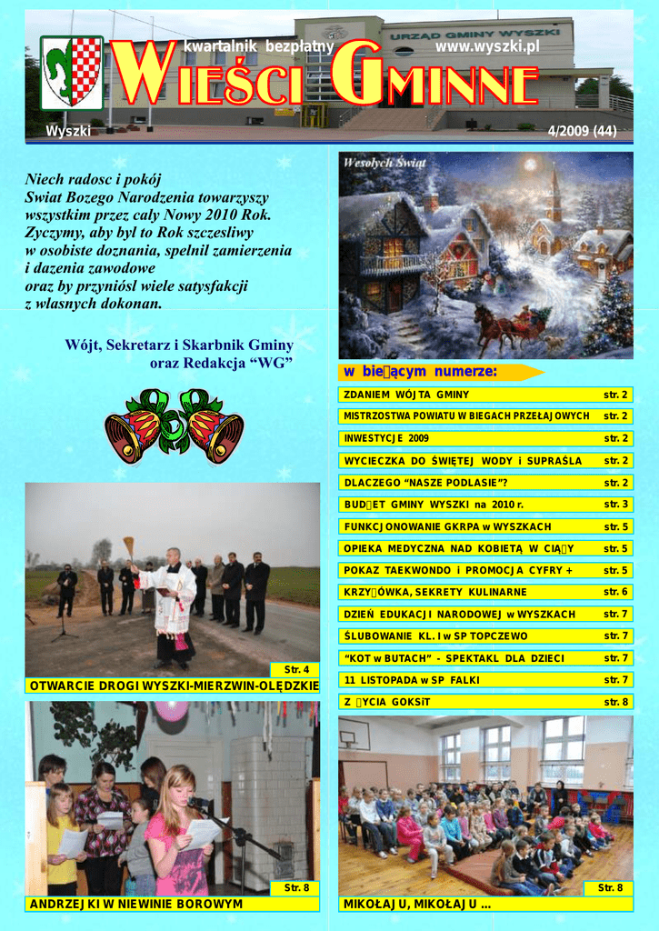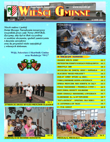 WIEŚCI GMINNE kwartalnik bezpłatny Wyszki www.wyszki.pl 4/2009 (44) Niech radosc i pokój Swiat Bozego Narodzenia towarzyszy wszystkim przez caly Nowy 2010 Rok. Zyczymy, aby byl to Rok szczesliwy w osobiste doznania, spelnil zamierzenia i dazenia zawodowe oraz by przyniósl wiele satysfakcji z wlasnych dokonan. Wójt, Sekretarz i Skarbnik Gminy oraz Redakcja “WG” w bieżącym numerze: ZDANIEM WÓJTA GMINY str. 2 MISTRZOSTWA POWIATU W BIEGACH PRZEŁAJOWYCH str. 2 INWESTYCJE 2009 str. 2 WYCIECZKA DO ŚWIĘTEJ WODY i SUPRAŚLA str. 2 DLACZEGO “NASZE PODLASIE”? str. 2 BUDŻET GMINY WYSZKI na 2010 r. str. 3 FUNKCJONOWANIE GKRPA w WYSZKACH str. 5 OPIEKA MEDYCZNA NAD KOBIETĄ W CIĄŻY str. 5 POKAZ TAEKWONDO i PROMOCJA CYFRY + str. 5 KRZYŻÓWKA, SEKRETY KULINARNE str. 6 DZIEŃ EDUKACJI NARODOWEJ w WYSZKACH str. 7 ŚLUBOWANIE KL. I w SP TOPCZEWO str. 7 “KOT w BUTACH” - SPEKTAKL DLA DZIECI str. 7 11 LISTOPADA w SP FALKI str. 7 Z ŻYCIA GOKSiT str. 8 Str. 4 OTWARCIE DROGI WYSZKI-MIERZWIN-OLĘDZKIE Str. 8 ANDRZEJKI W NIEWINIE BOROWYM Str. 8 MIKOŁAJU, MIKOŁAJU ... ZDANIEM WÓJTA GMINY WYCIECZKA DO ŚWIĘTEJ WODY i SUPRAŚLA Od 2002 roku w klasach VI szkół podstawowych przeprowadzany jest przez Centralną Komisję Egzaminacyjną sprawdzian kompetencyjny. Od 2003 roku również egzaminem kończy się nauka w gimnazjum. Zastosowane określone standardy tych egzaminów obowiązujące jednakowo dla wszystkich szkół w całym kraju pozwalają w miarę wiarygodnie porównywać wyniki nauczania między szkołami. Zbiorcze wyniki tych egzaminów otrzymują każdego roku szkoły oraz Dnia 06.10.2009 r. GOKSiT w Wyszkach i Filia GBP w Strabli zorganizowała dla Seniorów wycieczkę do Świętej Wody i Supraśla. Zwiedzanie rozpoczęliśmy od Supraśla. Przewodnik przybliżył nam historię zespołu budynków Prawosławnego Męskiego Monastyru,w skład którego wchodzą Pałac Archimandrytów, cerkiew p.w. Zwiastowania NMP oraz Muzeum Ikon, od którego rozpoczęliśmy zwiedzanie. Obejrzeliśmy wspaniałą, jedną z najbogatszych w Polsce kolekcję ikon z XVIII-XIX i XX w. organ prowadzący - wójt gminy. Analiza otrzymanych od Okręgowej Komisji Egzaminacyjnej danych dotyczących wyników nauczania w naszych szkołach oraz ich pozycja na tle innych szkół w regionie, województwie, kraju nie daje powodów do satysfakcji. Ponieważ warunki do nauki w naszych szkołach są naprawdę na dobrym a nawet na bardzo dobrym poziomie rodzi się pytanie - Gdzie tkwi problem? cd na str. 3 MISTRZOSTWA POWIATU w BIEGACH PRZEŁAJOWYCH Dnia 19 października 2009 roku w Bielsku Podlaskim odbyły się Mistrzostwa Powiatu w Drużynowych Biegach Przełajowych. Reprezentujące nasze gimnazjum drużyny dziewcząt i chłopców zajęły drugie miejsca, a tym samym zakwalifikowały się do półfinału. Obu reprezentacjom, jak również ich opiekunom serdecznie gratulujemy! (ze str.: www.szkola.wyszki.pl) INWESTYCJE 2009 REKORD DROGOWY. W tym roku padł rekord w naszej gminie pod względem ilości kilometrów wybudowanych nowych dróg. Przybyło ich w sumie ponad 11 km. Jest to wynik, z którego naprawdę można być zadowolonym. W takim tempie, w okresie 3 - 5 lat, rozwiązalibyśmy problem drogowy na naszej gminie. Nie jest to jednak takie proste. Zwłaszcza, że fundusze unijne i tak zwane „Schetynówki” wcale nie są tak łatwo dostępne, jak się to głosi w mediach. W tym roku udało się uzyskać na drogę Wyszki - Mierzwin - Olędzkie dotację ze środków Unii Europejskiej i 10 listopada uroczyście przekazaliśmy w użytkowanie prawie 8 - kilometrowy odcinek drogi. Dosyć gruntownie wyremontowaliśmy drogi żwirowe Strabla - Łyse, Ignatki w kierunku Topczewa Również w tym roku oddaliśmy do użytku 2,6 km drogi gminnej Warpechy N. - Olszanica - Mulawicze. W 2008 r. wybudowaliśmy odcinek Stacewicze - Warpechy Nowe. W tym roku udało się również zmodernizować nawierzchnię w Kamiennym Dworze. (foto) cd na str. 5 Następnie zwiedziliśmy cerkiew-najstarszy zabytek architektury sakralnej na tym terenie z lat 1503-1571. Na koniec zrobiliśmy pamiątkowe zdjęcie i wyruszyliśmy do sanktuarium w Świętej Wodzie. Tu również przewodnik zapoznał nas z historią-legendą tego cudownego miejsca, po czym nawiedziliśmy kościółek. Piękna jesienna pogoda pozwoliła zwiedzić Górę Krzyży i Pomnik III Tysiąclecia, a także uczestniczyliśmy w rozważaniach Męki Pańskiej pod przewodnictwem p. Janusza Wyszyńskiego, który był naszym przewodnikiem do sanktuarium Miłosierdzia Bożego w Białymstoku, a później do kaplicy. Tam siostra zakonna bardzo ciekawie opowiadała o bogatej osobowości kapłańskiej bł.k. W. Sopoćko, obejrzeliśmy izbę Jego pamięci i oddaliśmy należną cześć relikwiom. Ubogaceni duchowo i z niezapomnianymi przeżyciami wracaliśmy do domu ze śpiewem na ustach i z nadzieją, iż kiedyś tu wrócimy. (...) Pragnę podziękować p. Januszowi Wyszyńskiemu za sprawą, którego wycieczka nabrała charakteru pielgrzymki, zapewne wiele wniosła dla każdego z nas, a przepiękny śpiew jeszcze dziś brzmi w uszach. Zofia Oksiuta DLACZEGO “NASZE PODLASIE”? Rozmowa z Prezesem Koła Gminy Wyszki Chrześcijańsko Demokratycznego Stowarzyszenia „NASZE PODLASIE” p. Ryszardem Perkowskim Wieści Gminne: Panie Prezesie, już od dosyć dawna, ale głównie przy okazji wyborów spotykaliśmy się z Chrześcijańsko-Demokratycznym Stowarzyszeniem „Nasze Podlasie”. W ostatnich wyborach samorządowych niewiele nawet zabrakło, aby Stowarzyszenie wprowadziło do Sejmiku Województwa Podlaskiego swojego radnego. Ostatnio zauważyliśmy, że ChDS ”Nasze Podlasie” zaczyna się coraz szybciej rozwijać. Proszę przybliżyć czytelnikom działalność Stowarzyszenia, jego statutowe cele. Ryszard Perkowski: Chrześcijańsko Demokratyczne Stowarzyszenie „Nasze Podlasie” jak sama nazwa wskazuje nie jest partią polityczną. Jest stowarzyszeniem ludzi o dość zróżnicowanych