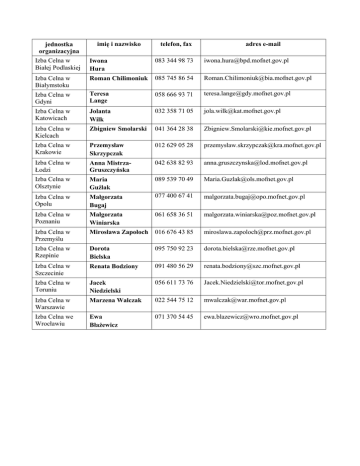 jednostka organizacyjna imię i nazwisko telefon, fax adres e-mail Izba Celna w Białej Podlaskiej Iwona Hura 083 344 98 73 [email protected] Izba Celna w Białymstoku Roman Chilimoniuk 085 745 86 54 [email protected] Izba Celna w Gdyni Teresa Lange 058 666 93 71 [email protected] Izba Celna w Katowicach Jolanta Wilk 032 358 71 05 [email protected] Izba Celna w Kielcach Zbigniew Smolarski 041 364 28 38 [email protected] Izba Celna w Krakowie Przemysław Skrzypczak 012 629 05 28 przemysł[email protected] Izba Celna w Łodzi Anna MistrzaGruszczyńska 042 638 82 93 [email protected] Izba Celna w Olsztynie Maria Guźlak 089 539 70 49 [email protected] Izba Celna w Opolu Małgorzata Bugaj 077 400 67 41 [email protected] Izba Celna w Poznaniu Małgorzata Winiarska 061 658 36 51 [email protected] Izba Celna w Przemyślu Mirosława Zapołoch 016 676 43 85 Izba Celna w Rzepinie Dorota Bielska 095 750 92 23 [email protected] Izba Celna w Szczecinie Renata Bodziony 091 480 56 29 [email protected] Izba Celna w Toruniu Jacek Niedzielski 056 611 73 76 [email protected] Izba Celna w Warszawie Marzena Walczak 022 544 75 12 [email protected] Izba Celna we Wrocławiu Ewa BłaŜewicz 071 370 54 45 [email protected] [email protected]