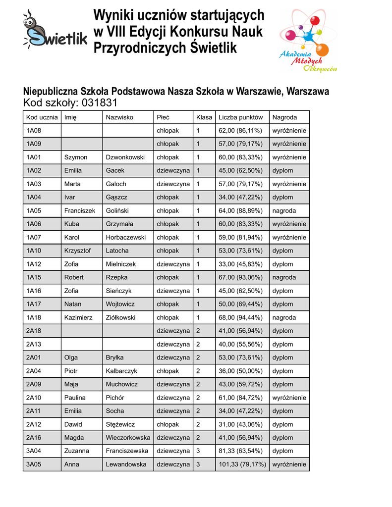 Wyniki uczniów startujących w VIII Edycji Konkursu Nauk Przyrodniczych Świetlik Niepubliczna Szkoła Podstawowa Nasza Szkoła w Warszawie, Warszawa Kod szkoły: 031831 Kod ucznia Imię Nazwisko Płeć Klasa Liczba punktów Nagroda 1A08 chłopak 1 62,00 (86,11%) wyróżnienie 1A09 chłopak 1 57,00 (79,17%) wyróżnienie 1A01 Szymon Dzwonkowski chłopak 1 60,00 (83,33%) wyróżnienie 1A02 Emilia Gacek dziewczyna 1 45,00 (62,50%) dyplom 1A03 Marta Galoch dziewczyna 1 57,00 (79,17%) wyróżnienie 1A04 Ivar Gąszcz chłopak 1 34,00 (47,22%) dyplom 1A05 Franciszek Goliński chłopak 1 64,00 (88,89%) nagroda 1A06 Kuba Grzymała chłopak 1 60,00 (83,33%) wyróżnienie 1A07 Karol Horbaczewski chłopak 1 59,00 (81,94%) wyróżnienie 1A10 Krzysztof Latocha chłopak 1 53,00 (73,61%) dyplom 1A12 Zofia Mielniczek dziewczyna 1 33,00 (45,83%) dyplom 1A15 Robert Rzepka chłopak 1 67,00 (93,06%) nagroda 1A16 Zofia Sieńczyk dziewczyna 1 45,00 (62,50%) dyplom 1A17 Natan Wojtowicz chłopak 1 50,00 (69,44%) dyplom 1A18 Kazimierz Ziółkowski chłopak 1 68,00 (94,44%) nagroda 2A18 dziewczyna 2 41,00 (56,94%) dyplom 2A13 dziewczyna 2 40,00 (55,56%) dyplom 2A01 Olga Bryłka dziewczyna 2 53,00 (73,61%) dyplom 2A04 Piotr Kalbarczyk chłopak 2 36,00 (50,00%) dyplom 2A09 Maja Muchowicz dziewczyna 2 43,00 (59,72%) dyplom 2A10 Paulina Pichór dziewczyna 2 61,00 (84,72%) wyróżnienie 2A11 Emilia Socha dziewczyna 2 34,00 (47,22%) dyplom 2A12 Dawid Stężewicz chłopak 2 31,00 (43,06%) dyplom 2A16 Magda Wieczorkowska dziewczyna 2 41,00 (56,94%) dyplom 3A04 Zuzanna Franciszewska dziewczyna 3 81,33 (63,54%) dyplom 3A05 Anna Lewandowska dziewczyna 3 101,33 (79,17%) wyróżnienie Kod ucznia Imię Nazwisko Płeć Klasa Liczba punktów Nagroda 4B04 chłopak 4 71,00 (55,47%) dyplom 4B06 chłopak 4 37,33 (29,17%) dyplom 4A13 dziewczyna 4 68,00 (53,13%) dyplom 4A01 Ziemowit Bielski chłopak 4 83,00 (64,84%) dyplom 4A03 Alan Fijał chłopak 4 78,67 (61,46%) dyplom 4B08 Natalia Jedynak dziewczyna 4 79,67 (62,24%) dyplom 4A03 Melania Kańka dziewczyna 4 76,00 (59,38%) dyplom 4B10 Kacper Krajewski chłopak 4 38,67 (30,21%) dyplom 4A05 Anna Latocha dziewczyna 4 77,67 (60,68%) dyplom 4A06 Konrad Łazęcki chłopak 4 68,33 (53,39%) dyplom 4A07 Zuzanna Łodyga dziewczyna 4 76,67 (59,90%) dyplom 4A08 Dorota Łuczyńska dziewczyna 4 68,00 (53,13%) dyplom 4B14 Maja Romanowska dziewczyna 4 49,00 (38,28%) dyplom 4B15 Kamil Skwierczyński chłopak 4 64,67 (50,52%) dyplom dziewczyna 5 50,00 (31,25%) dyplom 5B13 5A01 Aleksander Andrzejewski chłopak 5 96,00 (60,00%) dyplom 5B04 Zofia Franciszewska dziewczyna 5 67,67 (42,29%) dyplom 5A05 Jan Król chłopak 5 62,33 (38,96%) dyplom 5A07 Michał Siatkowski chłopak 5 89,67 (56,04%) dyplom 5A08 Gabriela Socha dziewczyna 5 45,67 (28,54%) dyplom 5A01 Michał Szewczak chłopak 5 113,67 (71,04%) dyplom 5B14 Adam Załuska chłopak 5 65,33 (40,83%) dyplom 5A11 Zuzanna Zimakowska dziewczyna 5 94,67 (59,17%) dyplom dziewczyna 6 120,00 (75,00%) wyróżnienie 98,67 (61,67%) dyplom 6A03 6A04 Michał Fabijanowski chłopak 6 6A08 Izabela Kaniewska dziewczyna 6 100,00 (62,50%) dyplom 6A09 Jakub Kaszycki chłopak 6 140,00 (87,50%) nagroda 6A10 Maksymilian Kuna chłopak 6 118,67 (74,17%) wyróżnienie 611 Jakub Lewandowski chłopak 6 54,67 (34,17%) dyplom 6A13 Patryk Michaś chłopak 6 98,67 (61,67%) dyplom 6A17 Karolina Żuber dziewczyna 6 77,33 (48,33%) dyplom