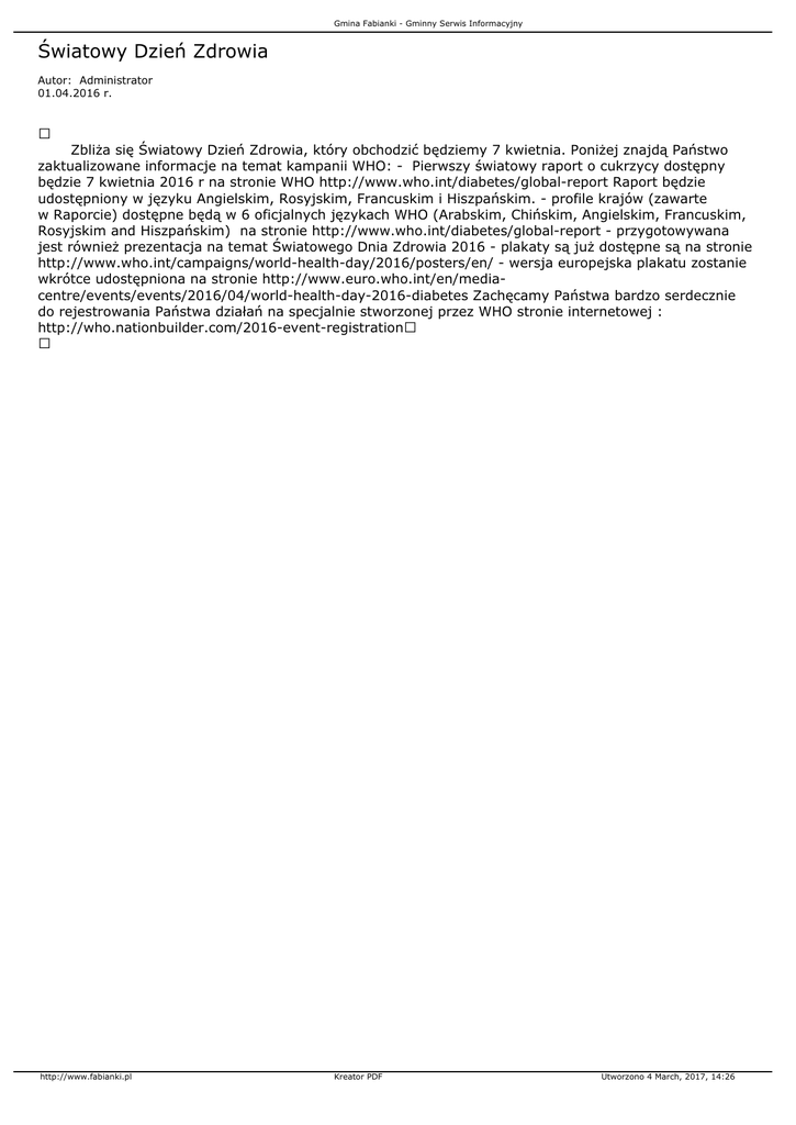 Gmina Fabianki - Gminny Serwis Informacyjny Światowy Dzień Zdrowia Autor: Administrator 01.04.2016 r. Zbliża się Światowy Dzień Zdrowia, który obchodzić będziemy 7 kwietnia. Poniżej znajdą Państwo zaktualizowane informacje na temat kampanii WHO: - Pierwszy światowy raport o cukrzycy dostępny będzie 7 kwietnia 2016 r na stronie WHO http://www.who.int/diabetes/global-report Raport będzie udostępniony w języku Angielskim, Rosyjskim, Francuskim i Hiszpańskim. - profile krajów (zawarte w Raporcie) dostępne będą w 6 oficjalnych językach WHO (Arabskim, Chińskim, Angielskim, Francuskim, Rosyjskim and Hiszpańskim) na stronie http://www.who.int/diabetes/global-report - przygotowywana jest również prezentacja na temat Światowego Dnia Zdrowia 2016 - plakaty są już dostępne są na stronie http://www.who.int/campaigns/world-health-day/2016/posters/en/ - wersja europejska plakatu zostanie wkrótce udostępniona na stronie http://www.euro.who.int/en/mediacentre/events/events/2016/04/world-health-day-2016-diabetes Zachęcamy Państwa bardzo serdecznie do rejestrowania Państwa działań na specjalnie stworzonej przez WHO stronie internetowej : http://who.nationbuilder.com/2016-event-registration http://www.fabianki.pl Kreator PDF Utworzono 4 March, 2017, 14:26