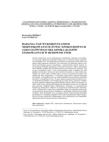 CZASOPISMO INŻYNIERII LĄDOWEJ, ŚRODOWISKA I ARCHITEKTURY JOURNAL OF CIVIL ENGINEERING, ENVIRONMENT AND ARCHITECTURE JCEEA, t. XXXI, z. 61 (3/II/14), lipiec-wrzesień 2014, s. 113-120 Bernardeta DĘBSKA1 Lech LICHOŁAI2 BADANIA NAD WYKORZYSTANIEM MODYFIKOWANYCH ŻYWIC EPOKSYDOWYCH JAKO GŁÓWNEGO SKŁADNIKA KLEJÓW STOSOWANYCH W BUDOWNICTWIE Swoiste właściwości żywic epoksydowych umożliwiają zaliczenie tych polimerów do grupy najlepszych materiałów klejowych. O wyższości klejów epoksydowych decyduje m.in. ich doskonała przyczepność do łączonych powierzchni oraz bardzo dobra odporność chemiczna. Ich stosowanie jest ułatwione poprzez możliwość prowadzenia procesu utwardzania z zastosowaniem jedynie nacisku zapewniającego dokładne przyleganie powierzchni łączonych. Złącze epoksydowe może niekiedy zastąpić takie sposoby łączenia, jak nitowanie lub spawanie. Fakt ten jest szczególnie ważny w tych zastosowaniach, gdzie wymagana jest duża gładkość powierzchni. Istotna jest także możliwość łączenia ze sobą rożnych materiałów np. metali, szkła, ceramiki, betonu, tworzyw sztucznych oraz gumy. Modyfikowane kleje epoksydowe o zwiększonej elastyczności stanowią doskonałe rozwiązanie w przypadku różnic we współczynnikach rozszerzalności materiałów łączonych i utwardzonej żywicy. W pracy opisano przeprowadzone badania żywicy epoksydowej Epidian 5 oraz kompozycji tej samej żywicy częściowo zastąpionej przez glikolizat odpadowego poli(tereftalanu etylenu) (PET). Porównano wybrane właściwości otrzymanych kompozycji, pod kątem możliwości ich aplikacji jako głównego składnika klejów budowlanych. Wykazano, że zaproponowana kompozycja epoksydowa odznacza się korzystnymi właściwościami mechanicznymi, a jednocześnie zastosowany modyfikator pełni rolę substancji poprawiającej elastyczność spoiny klejowej. Dodatkowo, modyfikator obniża koszty produkcji klejów, które postrzegane są za stosunkowo drogie. Wykorzystanie materiałów pochodzących z recyklingu (odpadowy PET) jako modyfikatorów klejów epoksydowych stwarza możliwości udoskonalenia cech technicznych tych materiałów, dając jednocześnie znaczące korzyści środowiskowe. Słowa kluczowe: odpady PET, właściwości mechaniczne, elastyczność spoiny, kleje epoksydowe ‒‒‒‒‒‒‒‒‒‒‒‒‒‒‒‒‒‒‒‒‒‒‒‒‒‒‒‒‒‒‒ 1 Autor do korespondencji: Bernardeta Dębska, Politechnika Rzeszowska, Zakład Budownictwa Ogólnego, ul. Poznańska 2, 35-959 Rzeszów, tel. 178651323, [email protected]. 2 Lech Lichołai, Politechnika Rzeszowska, Zakład Budownictwa Ogólnego, ul. Poznańska 2, 35-959 Rzeszów, tel. 178651327, [email protected] 114 B. Dębska, L. Lichołai 1. Wprowadzenie Kleje są to substancje, będące w stanie ciekłym które po wprowadzeniu pomiędzy dwie powierzchnie wykazują zdolność do trwałego połączenia tych elementów. Proces łączenia zachodzi w wyniku działania sił adhezji kleju do powierzchni klejonej oraz sił spójności wewnętrznej działających w warstwie kleju (kohezja). Klej powinien charakteryzować się dużą przyczepnością do podłoża i trwałością złącza, jednocześnie nie powodując zmian kształtu ani innych właściwości materiałów łączonych [1]. W budownictwie pierwsze substancje klejące stosowano do łączenia różnych materiałów już kilka tysięcy lat temu. Wykorzystywano wtedy siłę klejącą naturalnych substancji „kleistych”, m.in. białka, kazeiny zawartej w mleku, czy żywicy wydzielanej przez niektóre rośliny. Obecnie, ogromne znaczenie klejów wynika przede wszystkim z szerokiego rozpowszechnienia substancji wielkocząsteczkowych, czyli polimerów [2]. Polimer jako podstawowy składnik kleju nadaje mu unikalną budowę wewnętrzną, a tym samym zdolność do klejenia. Jednocześnie dzięki obecności polimerów uzyskuje się pożądaną przyczepność kleju do sklejanych powierzchni. Polimery nadają także spoinie odpowiednią wytrzymałość mechaniczną, którą osiąga się po zakończeniu procesu utwardzania oraz dobrą odporność na działanie różnych czynników korozyjnych [1]. W ostatnich latach w wielu gałęziach przemysłu można było zauważyć bardzo szerokie zastosowanie klejenia jako sposobu łączenia różnych materiałów. Z uwagi na duże możliwości stosowania substancji klejących w budownictwie, żywice i kleje z nich wytworzone próbowano już od dawna używać do łączenia najczęściej spotykanych materiałów budowlanych, takich jak beton, materiały ceramiczne, drewno, metale itp. Proces klejenia materiałów budowlanych prowadzony zarówno przy ich produkcji jak też na placu budowy, wymusza na inżynierach konieczność rozwiązania specyficznych problemów, odmiennych od tych, które zwykle występują, gdy stosuje się kleje w innych przypadkach. [3]. Wszystkie substancje pochodzenia naturalnego i syntetycznego o właściwościach klejących mają jedną wspólną cechę: są zbudowane ze stosunkowo dużych cząsteczek, których masa cząsteczkowa jest najczęściej większa niż 10 000. Dzięki temu osiąga się nie tylko pożądaną przyczepność do powierzchni klejonych, lecz także dużą wytrzymałość na rozerwanie spoiny klejowej, ponieważ przy oddzieraniu lub odrywaniu poszczególnych makrocząsteczek polimeru trzeba przezwyciężyć tym większe siły międzycząsteczkowe, im dłuższe są łańcuchy polimerowe w tych cząsteczkach. W zasadzie wszystkie substancje wielkocząsteczkowe można uważać za potencjalne kleje. Jednakże zastosowanie praktyczne znalazły tylko te polimery, które są rozpuszczalne lub topliwe, to znaczy tylko takie, które mogą zwilżać powierzchnie stałe, gdyż jest to podstawowa cecha warunkująca przyczepność materiału do podłoża. Badania nad wykorzystaniem modyfikowanych żywic epoksydowych... 115 Do najpopularniejszych substancji stanowiących bazę dl