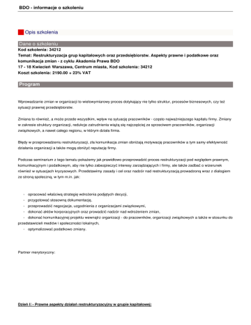 BDO - informacje o szkoleniu Opis szkolenia Dane o szkoleniu Kod szkolenia: 34212 Temat: Restrukturyzacja grup kapitałowych oraz przedsiębiorstw. Aspekty prawne i podatkowe oraz komunikacja zmian - z cyklu Akademia Prawa BDO 17 - 18 Kwiecień Warszawa, Centrum miasta, Kod szkolenia: 34212 Koszt szkolenia: 2190.00 + 23% VAT Program Wprowadzanie zmian w organizacji to wielowymiarowy proces dotykający nie tylko struktur, procesów biznesowych, czy też sytuacji prawnej przedsiębiorstw. Zmiana to również, a może przede wszystkim, wpływ na sytuację pracowników - często najważniejszego kapitału firmy. Zmiany w zakresie struktury organizacji, redukcje zatrudnienia wiążą się najczęściej ze sprzeciwem pracowników, organizacji związkowych, a nawet całego regionu, w którym działa firma. Błędy w przeprowadzeniu restrukturyzacji, zła komunikacja zmian obniżają motywację pracowników a tym samy efektywność działania organizacji a także mogą obniżyć reputację firmy. Podczas seminarium z tego tematu pokażemy jak prawidłowo przeprowadzić proces restrukturyzacji pod względem prawnym, komunikacyjnym i podatkowym, aby nie tylko zabezpieczyć interesy zarządzających i firmy, ale także zadbać o wizerunek również w sytuacjach kryzysowych. Przedstawimy zasady i cel oraz nadzór nad restrukturyzacją prowadzoną wraz z dialogiem ze stroną społeczną, w tym m.in. jak: - opracować właściwą strategię wdrożenia podjętych decyzji, - przygotować stosowną dokumentację, - przeprowadzić negocjacje, uzgodnienia z organizacjami związkowymi, - dokonać aktów korporacyjnych oraz prowadzić nadzór nad wdrożeniem zmian, - dokonać komunikacyjnej projektu wewnątrz organizacji - do pracowników, organizacji związkowych a także w stosunku do przedstawicieli mediów i społeczności lokalnych, - optymalizować podatkowo zmiany. Partner merytoryczny: Dzień I - Prawne aspekty działań restrukturyzacyjny w grupie kapitałowej: BDO - informacje o szkoleniu 1. Wprowadzenie - przegląd czynności restrukturyzacyjnych: - przyczyny restrukturyzacji, - przegląd typowych czynności restrukturyzacyjnych m.in.: przekształcenie, podział, łączenie, zbycie udziałów, zbycie aktywów, zbycie ZCP, zbycie przedsiębiorstwa, likwidacja, utworzenie nowego podmiotu, - najczęściej analizowane zagadnienia prawne towarzyszące restrukturyzacji m.in.: problem sukcesji praw i obowiązków, sukcesja zezwoleń, koncesji oraz ulg, prawa i obowiązki pracownicze, wpływ restrukturyzacji na stosunki umowne. 2. Podział spółki: - istota i sposoby podziału, dzień podziału, dzień wydzielenia, - procedura podziału, plan podziału, sukcesja praw i obowiązków oraz odpowiedzialność za zobowiązania, - przejście praw i obowiązków pracowniczych, - odpowiedzialność uczestników procesu podziału, - uprawnienia wspólnika mniejszościowego. 3. Zbycie przedsiębiorstwa/zorganizowanej części przedsiębiorstwa: - pojęcie przedsiębiorstwa i zorganizowanej części przedsiębiorstwa, - przejście koncesji ulg i zezwoleń, kwestia sukcesji praw i obowiązków, sukcesja umów, - zagadnienia pracownicze, - odpowiedzialność nabywcy i zbywcy, - forma zbycia. 4. Aport jako czynność restrukturyzacyjna: - pojęcie zdolności aportowej, - udziały i akcje jako przedmiot aportu, - aktywa inne niż udziały i akcje jako przedmiot aportu, - wycena aportu. 5. Restrukturyzacja podmiotów leczniczych: - obligatoryjne przekształcenie szpitali w spółki prawa handlowego - jak skorzystać z umorzenia długu szpitala przy przekształceniu? BDO - informacje o szkoleniu - jak wygląda procedura przekształcenia samodzielnego publicznego zakładu opieki zdrowotnej w spółkę kapitałową - harmonogram koniecznych czynności w przekształceniu szpitali - procedura przekształcenia szpitala w spółkę kapitałową - krok po kroku - czynności organu zarządzającego spółką - skutki przekształcenia szpitala w spółkę kapitałową - charakterystyka poszczególnych spółek kapitałowych, czyli którą formę wybrać dla przekształcenia szpitala - zmiany organizacyjne w szpitalu - likwidacja, łaczenie komórek organizacyjnych - jak prowadzić skuteczny dialog ze związkami zawodowymi aby doprowadzic do przekształcenia szpitala w społkę kapitałową? - czynności nadzorcze po dokonanym procesie przekształcenia 6. Restrukturyzacja zatrudnienia - od programu łagodnych zwolnień przez proces odejść dobrowolnych po projekt outplacement: - restrukturyzacja rozwojowa i naprawcza: - restrukturyzacja zatrudnienia jako nieodzowny element restrukturyzacji firmy - czas jako wyznacznik podjęcia działań restrukturyzacyjnych - przygotowanie planu restrukturyzacji zatrudnienia - pojecie planu społecznego - spłaszczanie struktur organizacyjnych - outsourcing - przebieg procesu restrukturyzacji zatrudnienia: - podstawy prawne redukcji zatrudnienia - programy Dobrowolnych Odejść (PDO) - oddziaływanie wewnątrzzakładowego prawa pracy oraz porozumień społecznych - rola związków zawodowych, rad pracowników w procesie restrukturyzacji - jakie kryteria przyjąć za podstawę decyzji o zwolnieniach? - jak zgodnie z prawem rozstać się z pracownikiem? - Pracownicy wobec restrukturyzacji zatrudnienia: - znaczenie komunikacji w procesie zwolnień - jak zwalniać? - umiejętność przeprowadzania rozmów ze zwalnianym pracownikiem - tworzenie komunikatów do pracowników - rola kadry kierowniczej w dostarczaniu informacji BDO - informacje o szkoleniu - Outplacement - przygotowanie i przeprowadzenie projektu: - jakie są cele outplacementu? - rodzaje outplacementu - czy i jaki program wybrać? - program merytoryczny outplacementu - pracownik zwalniany w procesie outplacementu - plusy i minusy sytuacji - pracodawca w procesie outplacementu - plusy i minusy dla firmy. 7. Znaczenie i rola komunikacji w procesie zmian: - Jak skutecznie komunikować zmiany i czego unikać? - Jak komunikować zmiany by ut