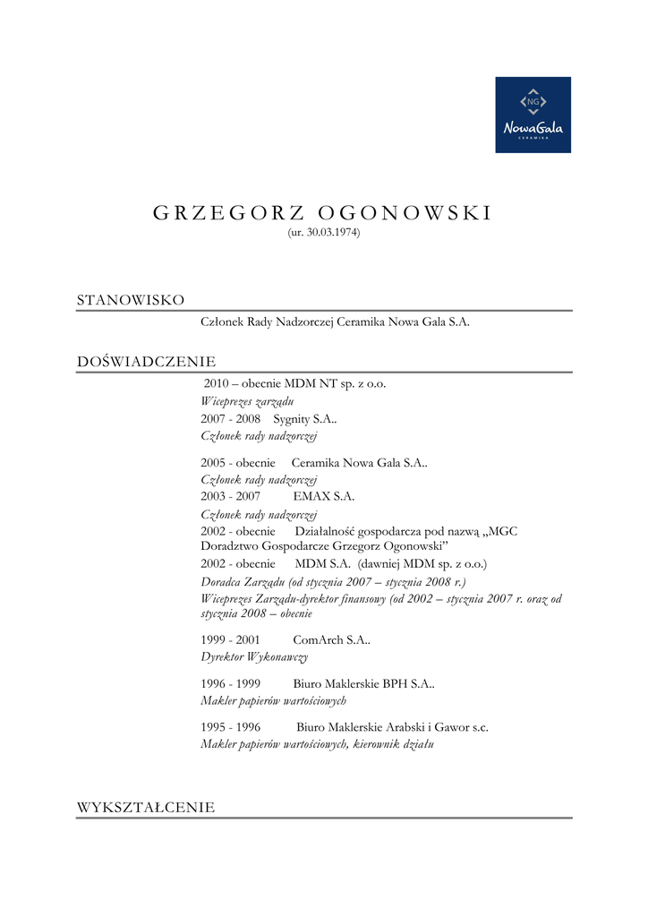 GRZEGORZ OGONOWSKI (ur. 30.03.1974) STANOWISKO Członek Rady Nadzorczej Ceramika Nowa Gala S.A. DOŚWIADCZENIE 2010 – obecnie MDM NT sp. z o.o. Wiceprezes zarządu 2007 - 2008 Sygnity S.A.. Członek rady nadzorczej 2005 - obecnie Ceramika Nowa Gala S.A.. Członek rady nadzorczej 2003 - 2007 EMAX S.A. Członek rady nadzorczej 2002 - obecnie Działalność gospodarcza pod nazwą „MGC Doradztwo Gospodarcze Grzegorz Ogonowski” 2002 - obecnie MDM S.A. (dawniej MDM sp. z o.o.) Doradca Zarządu (od stycznia 2007 – stycznia 2008 r.) Wiceprezes Zarządu-dyrektor finansowy (od 2002 – stycznia 2007 r. oraz od stycznia 2008 – obecnie 1999 - 2001 ComArch S.A.. Dyrektor Wykonawczy 1996 - 1999 Biuro Maklerskie BPH S.A.. Makler papierów wartościowych 1995 - 1996 Biuro Maklerskie Arabski i Gawor s.c. Makler papierów wartościowych, kierownik działu WYKSZTAŁCENIE 1998 Akademia Ekonomiczna w Krakowie Magister kierunku Finanse i bankowość 1995 Licencja maklera papierów wartościowych Pan Grzegorz Ogonowski nie prowadzi działalności konkurencyjnej wobec emitenta ani nie jest wspólnikiem w konkurencyjnej spółce cywilnej lub spółce osobowej bądź członkiem organu spółki kapitałowej lub członkiem organu jakiejkolwiek innej konkurencyjnej osoby prawnej. Nie został wpisany do Rejestru DłuŜników Niewypłacalnych, prowadzonego na podstawie ustawy o Krajowym Rejestrze Sądowym. FAX (0-41) 390 11 02 • E-MAIL [email protected] UL. CERAMICZNA 1 • 26-200 KOŃSKIE • TELEFON (0-41) 390 11 00 2