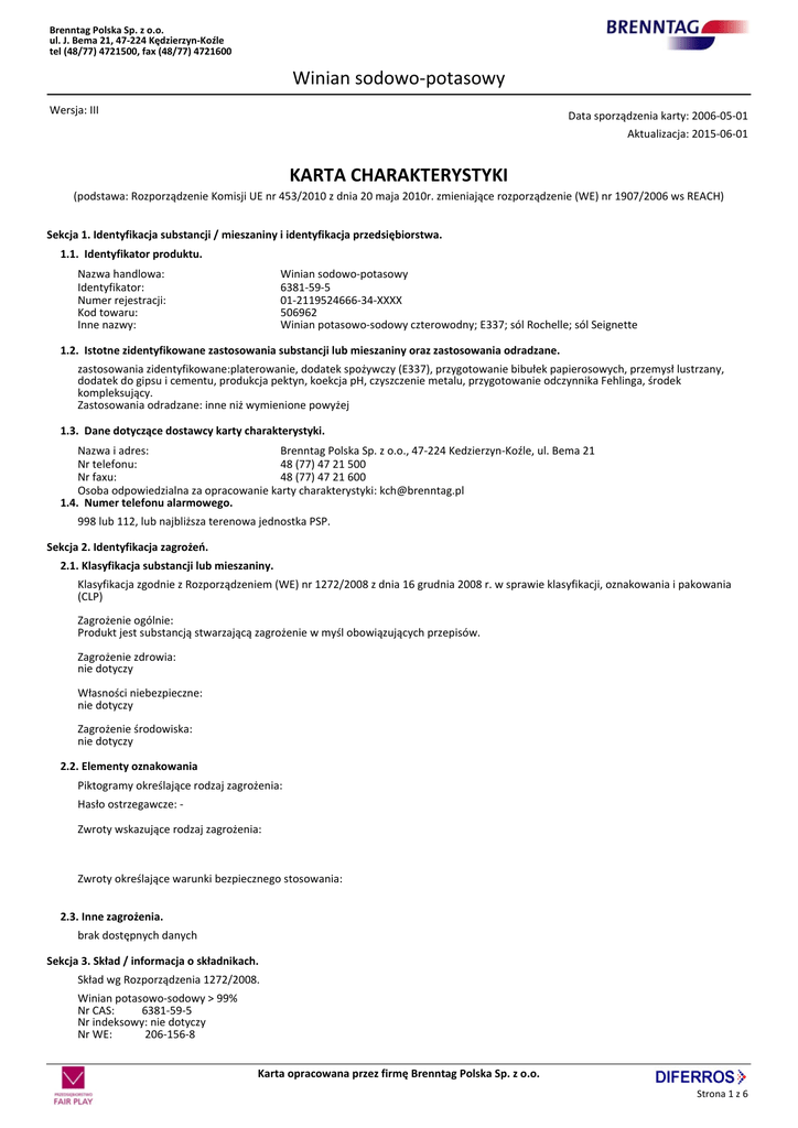 Brenntag Polska Sp. z o.o. ul. J. Bema 21, 47-224 Kędzierzyn-Koźle tel (48/77) 4721500, fax (48/77) 4721600 Winian sodowo-potasowy Wersja: III Data sporządzenia karty: 2006-05-01 Aktualizacja: 2015-06-01 KARTA CHARAKTERYSTYKI (podstawa: Rozporządzenie Komisji UE nr 453/2010 z dnia 20 maja 2010r. zmieniające rozporządzenie (WE) nr 1907/2006 ws REACH) Sekcja 1. Identyfikacja substancji / mieszaniny i identyfikacja przedsiębiorstwa. 1.1. Identyfikator produktu. Nazwa handlowa: Identyfikator: Numer rejestracji: Kod towaru: Inne nazwy: Winian sodowo-potasowy 6381-59-5 01-2119524666-34-XXXX 506962 Winian potasowo-sodowy czterowodny; E337; sól Rochelle; sól Seignette 1.2. Istotne zidentyfikowane zastosowania substancji lub mieszaniny oraz zastosowania odradzane. zastosowania zidentyfikowane:platerowanie, dodatek spożywczy (E337), przygotowanie bibułek papierosowych, przemysł lustrzany, dodatek do gipsu i cementu, produkcja pektyn, koekcja pH, czyszczenie metalu, przygotowanie odczynnika Fehlinga, środek kompleksujący. Zastosowania odradzane: inne niż wymienione powyżej 1.3. Dane dotyczące dostawcy karty charakterystyki. Nazwa i adres: Brenntag Polska Sp. z o.o., 47-224 Kedzierzyn-Koźle, ul. Bema 21 Nr telefonu: 48 (77) 47 21 500 Nr faxu: 48 (77) 47 21 600 Osoba odpowiedzialna za opracowanie karty charakterystyki: [email protected] 1.4. Numer telefonu alarmowego. 998 lub 112, lub najbliższa terenowa jednostka PSP. Sekcja 2. Identyfikacja zagrożeń. 2.1. Klasyfikacja substancji lub mieszaniny. Klasyfikacja zgodnie z Rozporządzeniem (WE) nr 1272/2008 z dnia 16 grudnia 2008 r. w sprawie klasyfikacji, oznakowania i pakowania (CLP) Zagrożenie ogólnie: Produkt jest substancją stwarzającą zagrożenie w myśl obowiązujących przepisów. Zagrożenie zdrowia: nie dotyczy Własności niebezpieczne: nie dotyczy Zagrożenie środowiska: nie dotyczy 2.2. Elementy oznakowania Piktogramy określające rodzaj zagrożenia: Hasło ostrzegawcze: Zwroty wskazujące rodzaj zagrożenia: Zwroty określające warunki bezpiecznego stosowania: 2.3. Inne zagrożenia. brak dostępnych danych Sekcja 3. Skład / informacja o składnikach. Skład wg Rozporządzenia 1272/2008. Winian potasowo-sodowy > 99% Nr CAS: 6381-59-5 Nr indeksowy: nie dotyczy Nr WE: 206-156-8 Karta opracowana przez firmę Brenntag Polska Sp. z o.o. Strona 1 z 6 Brenntag Polska Sp. z o.o. ul. J. Bema 21, 47-224 Kędzierzyn-Koźle tel (48/77) 4721500, fax (48/77) 4721600 Winian sodowo-potasowy Sekcja 4. Środki pierwszej pomocy. 4.1. Opis środków pierwszej pomocy. Wdychanie: W razie narażenia inhalacyjnego wyprowadzić poszkodowanego na świeże powietrze. Kontakt ze skórą: W razie zanieczyszczenia skóry zmyć dokładnie wodą z mydłem, przy wystapieniu podraznienie skonstaktowac się z lekarzem. Kontakt z oczami: W razi ezanieczyszczenia oczu przemyć dużą ilością wody, gdy podrażnienie nie ustępuje skontaktować się z lekarzem. Spożycie: W razie połknięcia wypić dużą ilość wody, w razie potrzeby skontaktować się z lekarzem. 4.2. Najważniejsze ostre i opóźnione objawy oraz skutki narażenia. połknięcie: może powodować łagodne podrażnienie przewodu pokarmowego 4.3. Wskazania dotyczące wszelkiej natychmiastowej pomocy lekarskiej i szczególnego postępowania z poszkodowanym. brak dostępnych danych Sekcja 5. Postępowanie w przypadku pożaru. 5.1. Środki gaśnicze. Woda, proszki gaśnicze, piany, dwutlenek węgla. 5.2. Szczególne zagrożenia związane z substancją lub mieszaniną. W czasie pożaru mogą uwalniać niebezpieczne gazy i opary. 5.3. Informacje dla straży pożarnej. Stosować niezależny aparat oddechowy Sekcja 6. Postępowanie w przypadku niezamierzonego uwolnienia do środowiska. 6.1. Indywidualne środki ostrożności, wyposażenie ochronne i procedury w sytuacjach awaryjnych. Stosować środk ochrony osobistej. 6.2. Środki ostrożności w zakresie ochrony środowiska. brak dostępnych danych 6.3. Metody i materiały zapobiegające rozprzestrzenianiu się skażenia i służące do usuwania skażenia. Rozsypany produkt zebrać do zamykanego pojemnika i przekazać do zniszczenia. 6.4. Odniesienia do innych sekcji. Informacje dotyczące odpowiedniego sprzętu ochrony osobistej podano w sekcji 8. Usuwać zgodnie z zaleceniami przedstawionymi w sekcji 13 Sekcja 7. Postępowanie z substancjami i mieszaninami oraz ich magazynowanie. 7.1. Środki ostrożności dotyczące bezpiecznego postępowania. brak dostępnych danych 7.2. Warunki bezpiecznego magazynowania, łącznie z informacjami dotyczącymi wszelkich wzajemnych niezgodności. Przechowywać w szczelnie zamknietych opakowaniach w suchym i chłodnym miejscu o dobrej wentylacji. Trzymać z dala od źródeł ognia i zapłonu. 7.3. Szczególne zastosowania końcowe. brak dostępnych danych Sekcja 8. Kontrola narażenia / środki ochrony indywidualnej. 8.1. Parametry dotyczące kontroli. NDS, NDSCh - nie ustalono (wg Rozporządzenia MPiPS z dn. 29 listopada 2002 ; Dz.U. Nr 217, poz. 1833, z późniejszymi zmianami) Zalecenia dotyczące procedury monitoringu zawartości składników niebezpiecznych w powietrzu – metodyka pomiarów: -Rozporządzenie Ministra Zdrowia z dnia 20 kwietnia 2005 r. w sprawie badań i pomiarów czynników szkodliwych dla zdrowia w środowisku pracy (Dz.U. Nr 73, poz.645) -PN-89/Z-01001/06. Ochrona czystości powietrza. Nazwy, określenia i jednostki. Terminologia dotycząca badań jakości powietrza na stanowiskach pracy. Karta opracowana przez firmę Brenntag Polska Sp. z o.o. Strona 2 z 6 Brenntag Polska Sp. z o.o. ul. J. Bema 21, 47-224 Kędzierzyn-Koźle tel (48/77) 4721500, fax (48/77) 4721600 Winian sodowo-potasowy -PN Z-04008-7:2002. Ochrona czystości powietrza. Pobieranie próbek. Zasady pobierania próbek powietrza w środowisku pracy i interpretacja wyników. -PN-EN-689: 2002. Powietrze na stanowiskach pracy – wytyczne oceny narażenia inhalacyjnego na czynniki chemiczne przez porównanie z wart